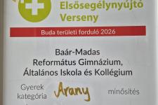 A Magyar Vöröskereszt 54. Országos Elsősegélynyújtó versenyének területi fordulóján iskolánk mindkét csapata arany minősítéssel első helyet szerzett.