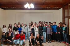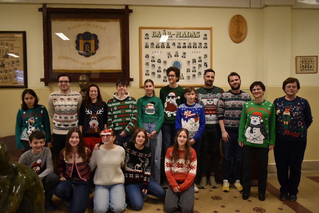 Karácsonyi pulcsis tanár-diák csoportképpel kíván mindenkinek Áldott Karácsonyt, Boldog Új Évet és tartalmas pihenést a téli szünetben a Diákönkormányzat!