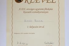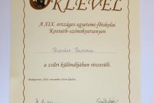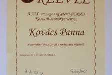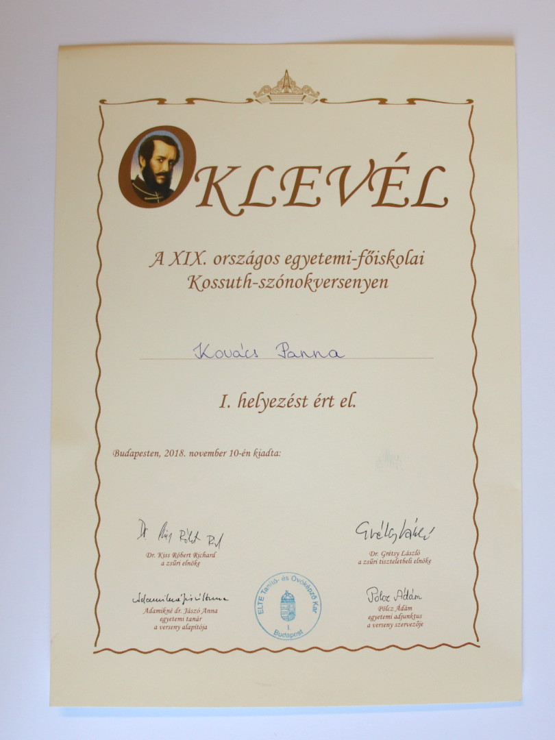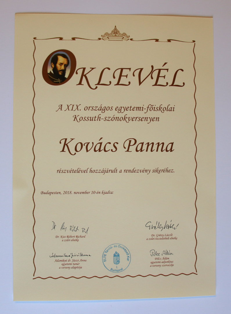 Kovács Panna 12.c-s tanulónk az "Édes anyanyelvünk" verseny döntőjén elért kitűnő eredményével kivívta a részvétel jogát.Az egyetemistáknak és középiskolásoknak meghirdetett versenyen egy 6 perces előre megírt és egy 3 perces rögtönzött szöveget kellett elmondaniuk a versenyzőknek.
