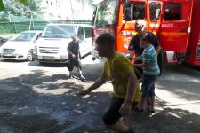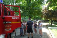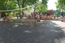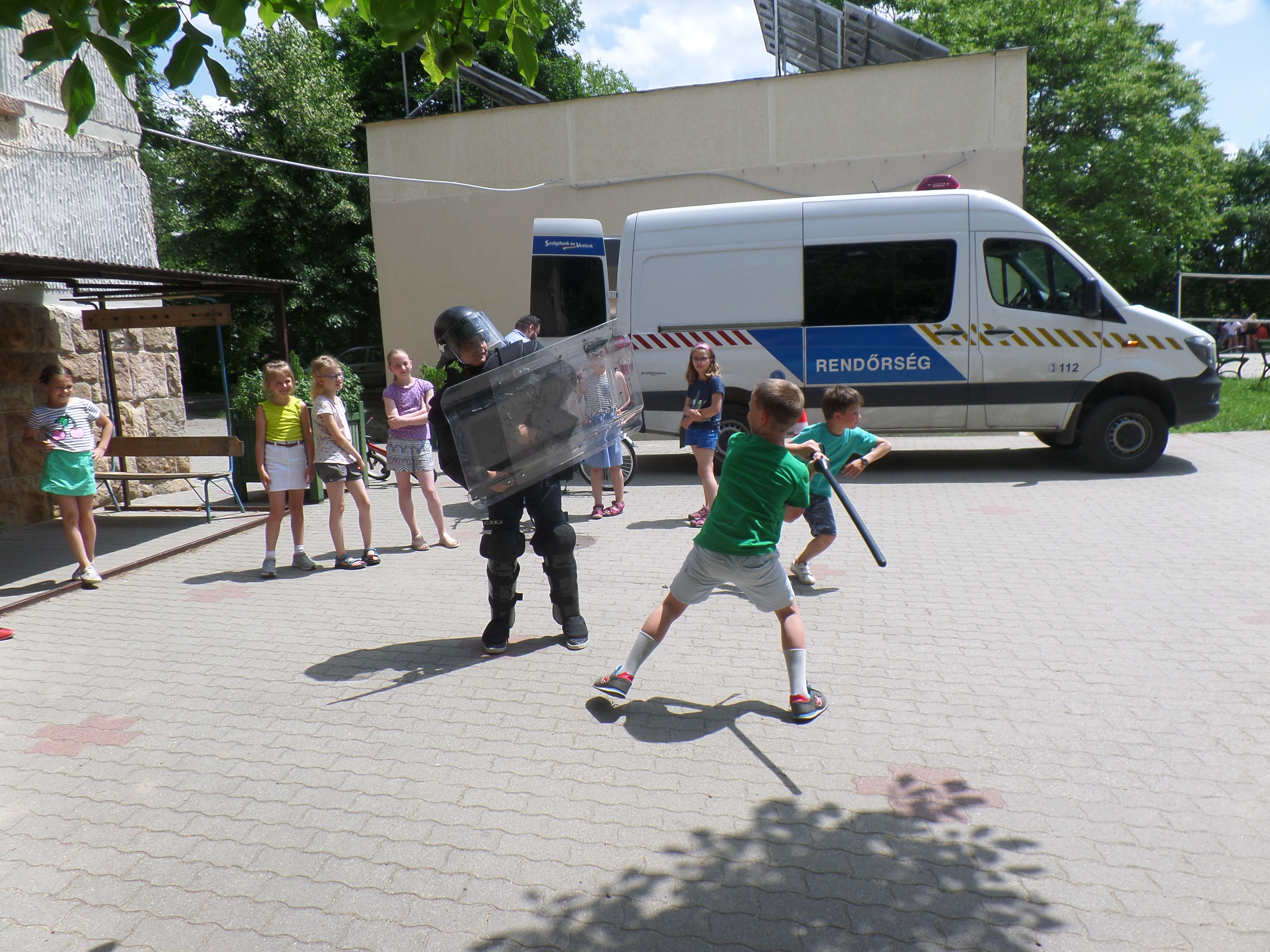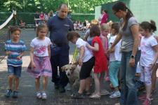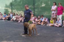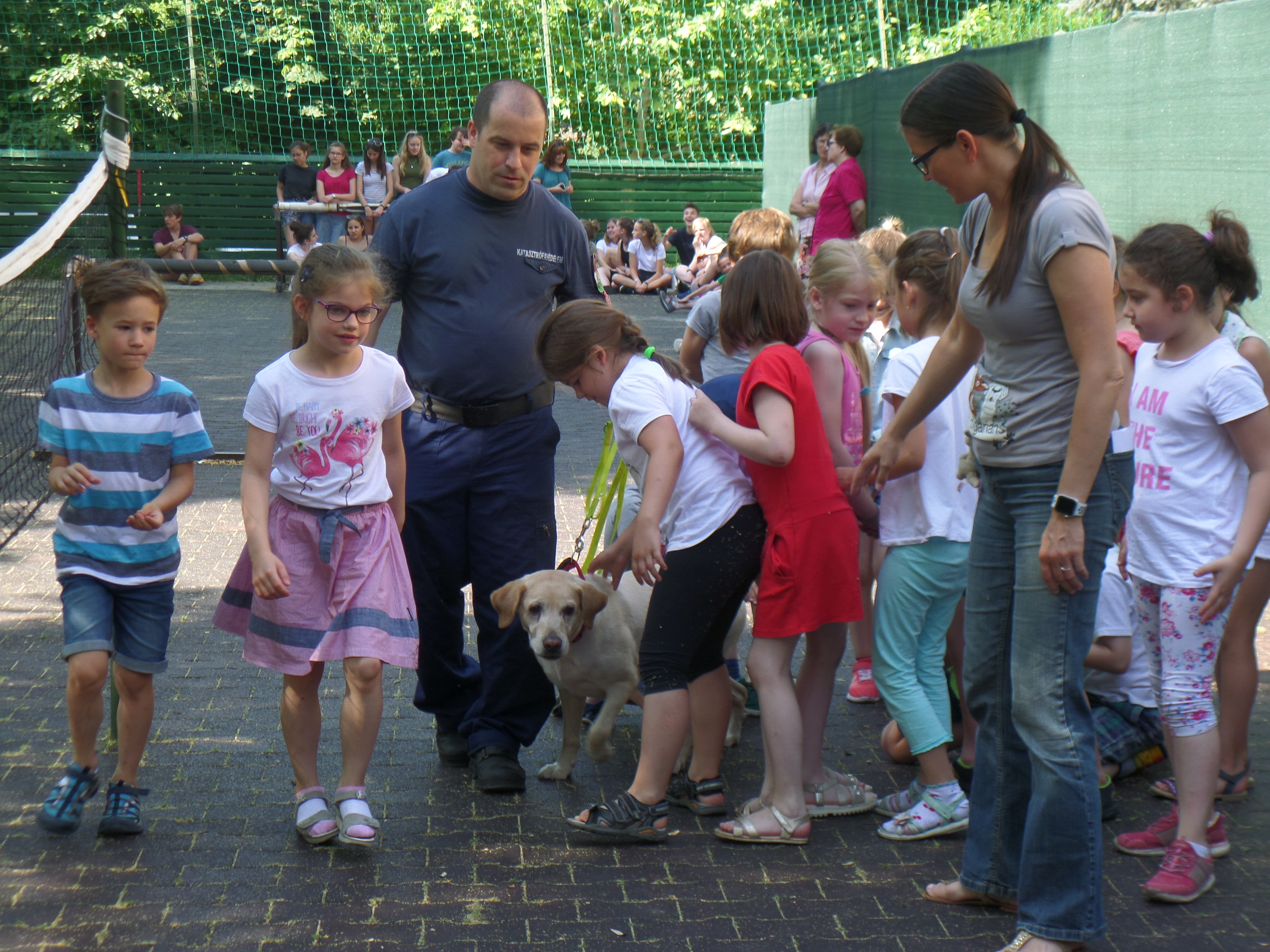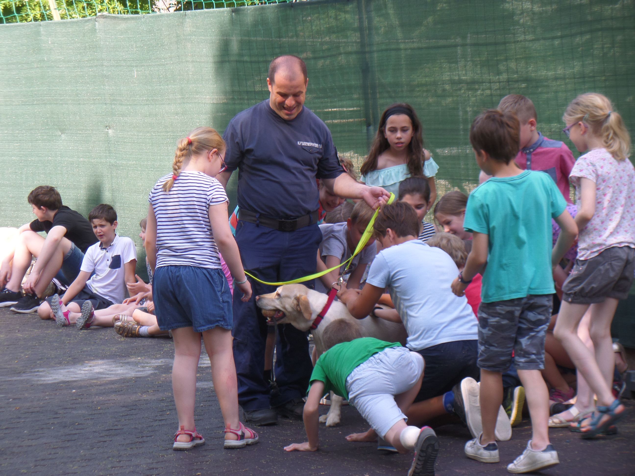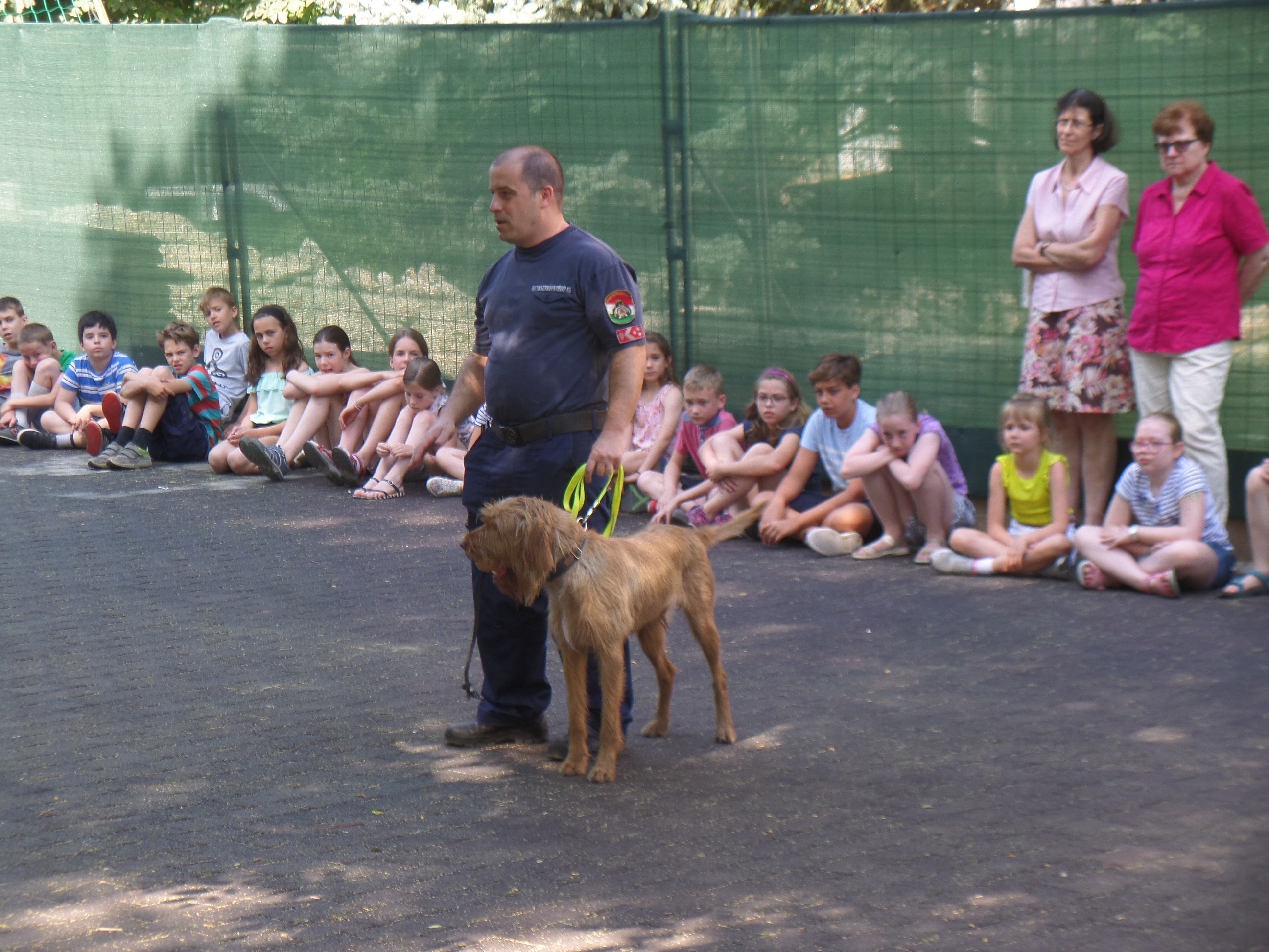 2019.06.12.-én reggel még a szokásosnál is nagyobb volt az általános iskolai Egészségnap kezdetét jellemző izgalom. A hónapokkal ezelőtt összeállított program szerint az eseményt a II. Kerületi Hivatásos Tűzoltóparancsnokság Mentőkutyás Szolgálatának bemutatójával szerettük volna kezdeni. A Katasztrófavédők érkezése mindig kicsit bizonytalan, hiszen, ha történik olyan esemény, amelyen a mentőkutyákat be kell vetni, az természetesen felülírja a tervezett bemutatót. Idén a dunai hajókatasztrófa miatt teljesen kérdésessé vált ez a programelem, mivel az áldozatok keresésében a kutyáknak és hivatásos gazdáiknak is részt kellett venniük. Ugyan a hajóroncs kiemelése végül előző nap megtörtént, ám a Katasztrófavédelem számára a feladat ezzel még nem ért véget, így csak a kezdés előtt fél órával kaptuk a hírt, hogy nem teljes létszámban, és egy kis késéssel, de el tudnak jönni hozzánk. Megérte várni rájuk! A két fantasztikusan okos – egy ember- és egy tűzkereső - kutya a tavalyihoz hasonlóan pillanatok alatt varázsolta el az összes gyereket és felnőttet, majd néhány percen belül a türelmesebb, az emberekhez jobban hozzászokott kutya már ki sem látszott a gyerekek alkotta kupacból. Emberek mentésére, felkutatására képezték ki, de a simogatást, gyömöszkölést is türelmesen bírta. Közben gazdájától rengeteg érdekes információt hallhattunk a Mentőkutyás Szolgálat tevékenységeiről.
