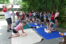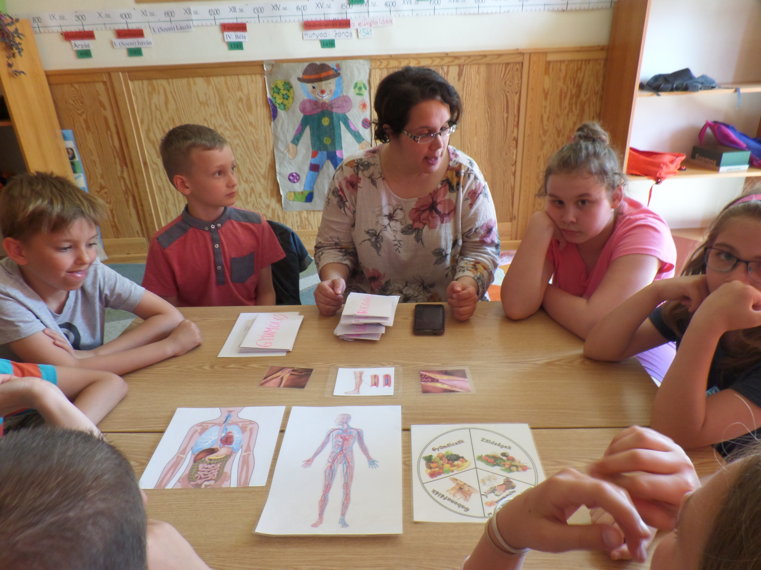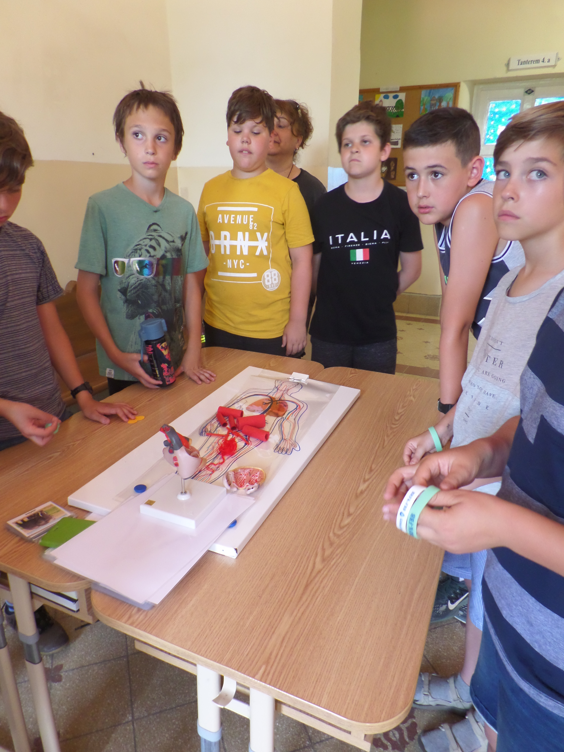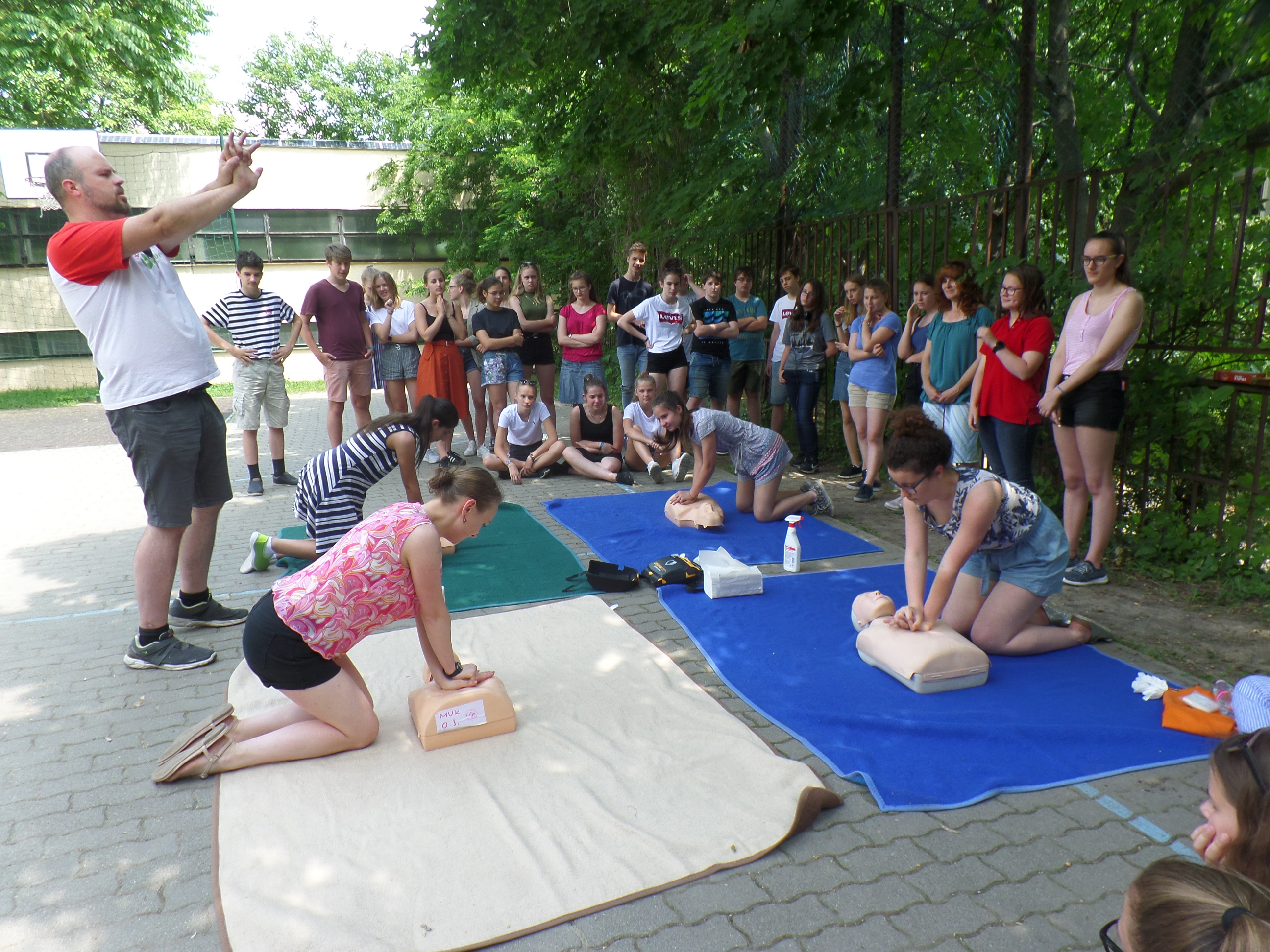 A közös kezdés után szétváltak az osztályok és életkoruknak megfelelő színes programokkal folytatódott a nap. Az első és második osztályosok igazán látványos és érdekes „kézmosós” foglalkozáson vettek részt, majd az alsó tagozatosok a II. kerületi Rendőrkapitányság közlekedési akadálypályáján kerékpárokkal gyakorolhattak, illetve magukra ölthettek testpáncélt és óvatosan, de kipróbálhatták a gumibotokat, és a Rózsadomb Polgárőr és Önkéntes Tűzoltó Egyesület jóvoltából még a tűzoltótömlőt is működtethették. A másodikosoknak Németh Sándor (Bethesda Gyermekkórház) az otthoni balesetek, égési sérülések megelőzéséről tartott előadást. A 3. és 4. osztályosok a Budapest Főváros Kormányhivatala Népegészségügyi Főosztály új, interaktív, fantasztikus ábrákkal és eszközökkel illusztrált „Szívdobbanás” foglalkozásán vettek részt, mely három állomásból állt. Rengeteg ismerettel gazdagodtak a szív működésével, a szívbarát táplálkozással és a szívünk egészségét védő életmóddal – ezen belül kiemelve a sport fontosságát - kapcsolatban. Az ötödikeseket és hatodikosokat Antal Emese Dietetikus látta el jó tanácsokkal, majd mindkét osztály játékos eszmeterjesztő foglalkozáson vett részt Kovács Dávid (Magyar Ifjúsági Vöröskereszt) és iskolánk elsősegélynyújtó szakköröseinek vezetésével. Ők, mint kortársoktatók a legnagyobbak újraélesztés oktatásában is részt vállaltak, de előtte még ez a két osztály (7. és 8.) részt vett az ELTE PPK pszichológia szakos hallgatói által tartott „Mind the Mind – Légy tekintettel az elmére” programon is, mely már februárban a gimnáziumi Egészségnapon nagy sikert aratott a diákság körében. Az interaktív workshopok célja a diákok érzékenyítése, tudatosságuk növelése, az empátiás készségeik fejlesztése, a megbélyegzés és a stigmatizáció megelőzése volt. Szó esett többek között olyan mentális zavarokról, mint pl. a depresszió, a skizofrénia, az evészavarok és a szorongásos zavarok. A foglalkozások több elemből álltak, a rövid elméleti részt videoanyagok, beszélgetések és élményalapú szerepjátékok, szituációs gyakorlatok színesítették.