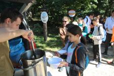 A cél, valamint a konyhások által megfőzött, és Süveges István karbantartónk által kiszállított babgulyás (KÖSZÖNJÜK!!!) megszerzési helye Budakeszi határában, a makkosmáriai templom melletti rét volt. A meghirdetésben 9 útvonal szerepelt, de végül csak ötre jelentkeztek az osztályok. A legnépszerűbb a Gyermekvasút mentén menő 5 kilométeres táv (5 osztály) bizonyult, de hasonló (4 osztály) volt az érdeklődés a 4,2 kilométer hosszú, libegőzéssel kezdődő túra iránt, mely a BMRG retro-túra, azaz eltévedésmentes szép út szende kislányoknak fantázianevet kapta. Sajnos –a kalapban érkező Laczik tanár úr kivételével– senki nem vette komolyan a kiírást, mely felhívta a figyelmet a korhű ruházatra: „Az útvonalon induló hölgyek számára kötelező a napernyő és a cérnakesztyű viselése, az uraktól elvárás a fehér ing, nyakkendő, zakó, kalap viselése!” Jövőre valószínűleg érdemes lesz a pontozási szempontok közé ezt is felvenni, hisz a túra idén is az Egy Baárkában evezünk! osztályok közötti verseny nyitóprogramja volt.