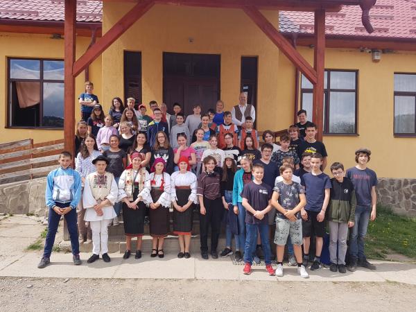 Ekkor látogattuk meg a helyi általános iskolát, ahol egy osztály tanáraival és az iskola igazgatójával fogadott minket. Több mint 10 éven keresztül szerveztünk tanszergyűjtést a helyi gyermekek számára, most öröm volt hallani, hogy erre már nincs szükség, megoldják helyben a szükséges dolgokat, egyre jobban felemelkedik a térség. A személyes beszélgetésben az is hangot kapott, hogy a helyi iskolának már-már terhes az egyre több csoport érkezése, mégis mindenkit szeretettel fogadnak. A gyimesi élet megismerése nemcsak az igazgató képes beszámolóján keresztül jött közel hozzánk, hanem a helyi tanulók ének és néptánc bemutatója is igazán felemelő volt, ráadásul az utolsó táncra a mi diákjaink is be tudtak állni.