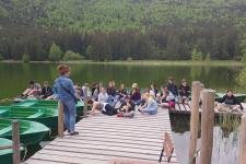 Másnap, május 23-án, vendéglátóinktól búcsút véve vettük utunkat Fogaras felé, ahol a helyi lelkipásztor várt minket. Az osztállyal megtekintettük a református templomot, meghallgattuk Árva Bethlen Kata életének fontos eseményeit, végül megkoszorúztuk a sírját. A városokat, Dél-Erdélyt lassan magunk mögött hagyva szeltük át Székelyföldet, eljutva az egyik legszebb pontjához, a Szent Anna-tóhoz. Bár a diákok szívesen láttak volna medvét, de majd 30 gyerek hangereje hál’ Istennek távol tartotta tőlünk őket. A tó partján, gyönyörű környezetben tartottuk meg aznapi áhítatunkat, hálát adva mindazért, amivel testünket, lelkünket táplálja Urunk ezen az úton. Estére megérkeztünk Gyimesbe, Hidegségpatakára, ahol a következő napokat töltöttük el. A Boglárka Vendégház gazdag vendéglátásában most sem csalódtunk, már több osztállyal visszatérő ismerősként köszöntöttük a háziakat.