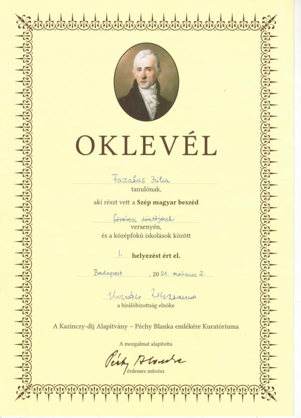 Fazakas Júlia - Szép Magyar Beszéd - Oklevél 2021