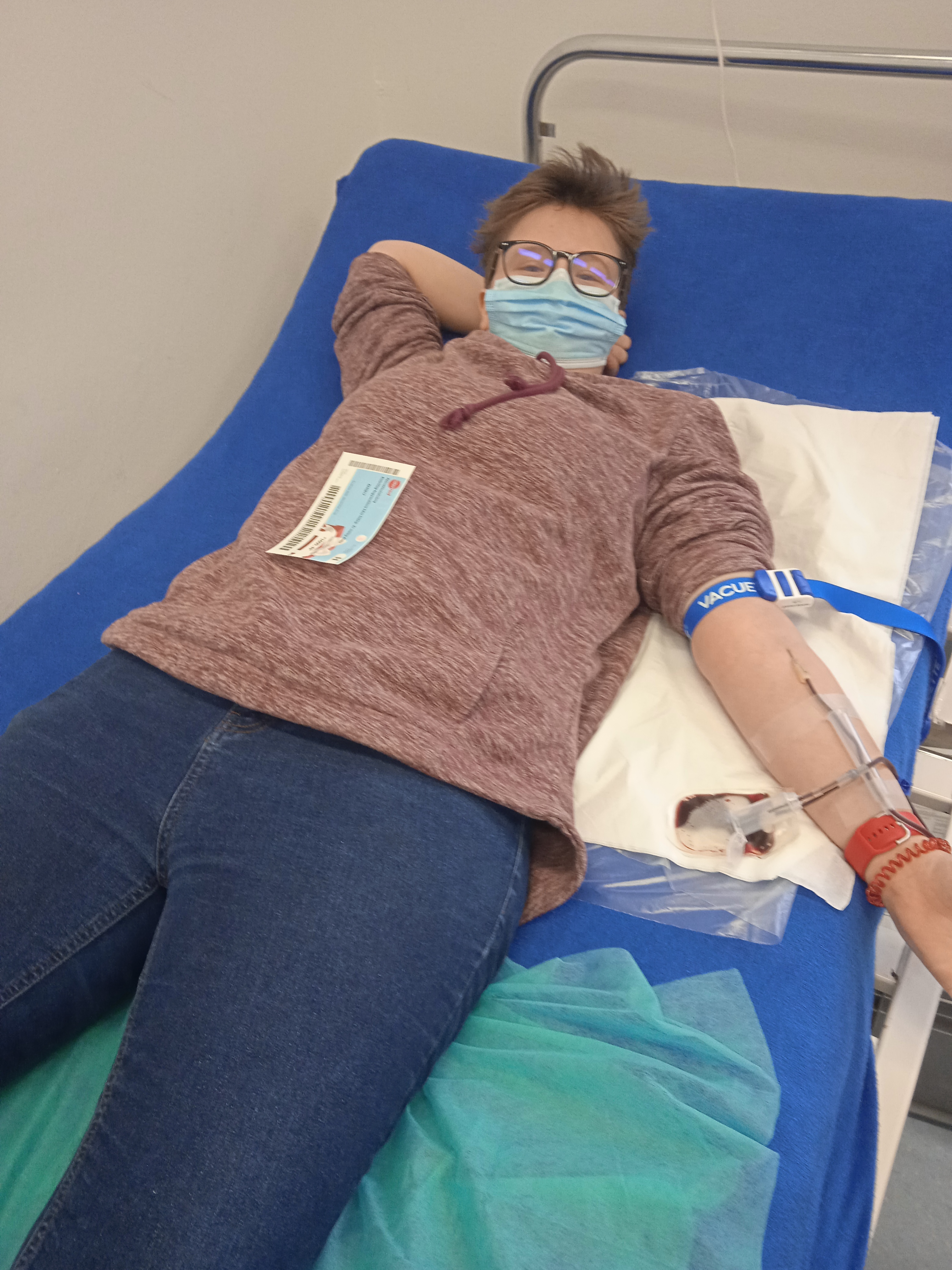 A visszatérők pedig régi diákjaink: akik tavaly érettségiztek, de az iskolában akkor, a Covid19 járvány miatt nem lehetett vért adni, akik már régebben végeztek, de azóta szorgalmasan visszajárnak, vannak néhányan, akik a ballagásuk óta eltelt hét évben mindig jöttek, és jöttek olyanok is, akik már szülőként tértek vissza régi iskolájukba. És vissza lehet térni nem csak véradóként, hanem a lebonyolításban részt vevőként is. Örömmel üdvözöltük egyik régi diákunkat, aki felsőfokú tanulmányai mellett az Országos Vérellátó Szolgálat munkatársa, a véradáson most ő felelt a regisztrációért. Az OVSZ és a Magyar Vöröskereszt szintén visszatérő, az ő segítségükkel tudtuk ezt az idén is sok résztvevőt vonzó (54 regisztrált véradó), kis izgalommal fűszerezett jó hangulatú, sok emberen segíteni tudó eseményt megvalósítani.
