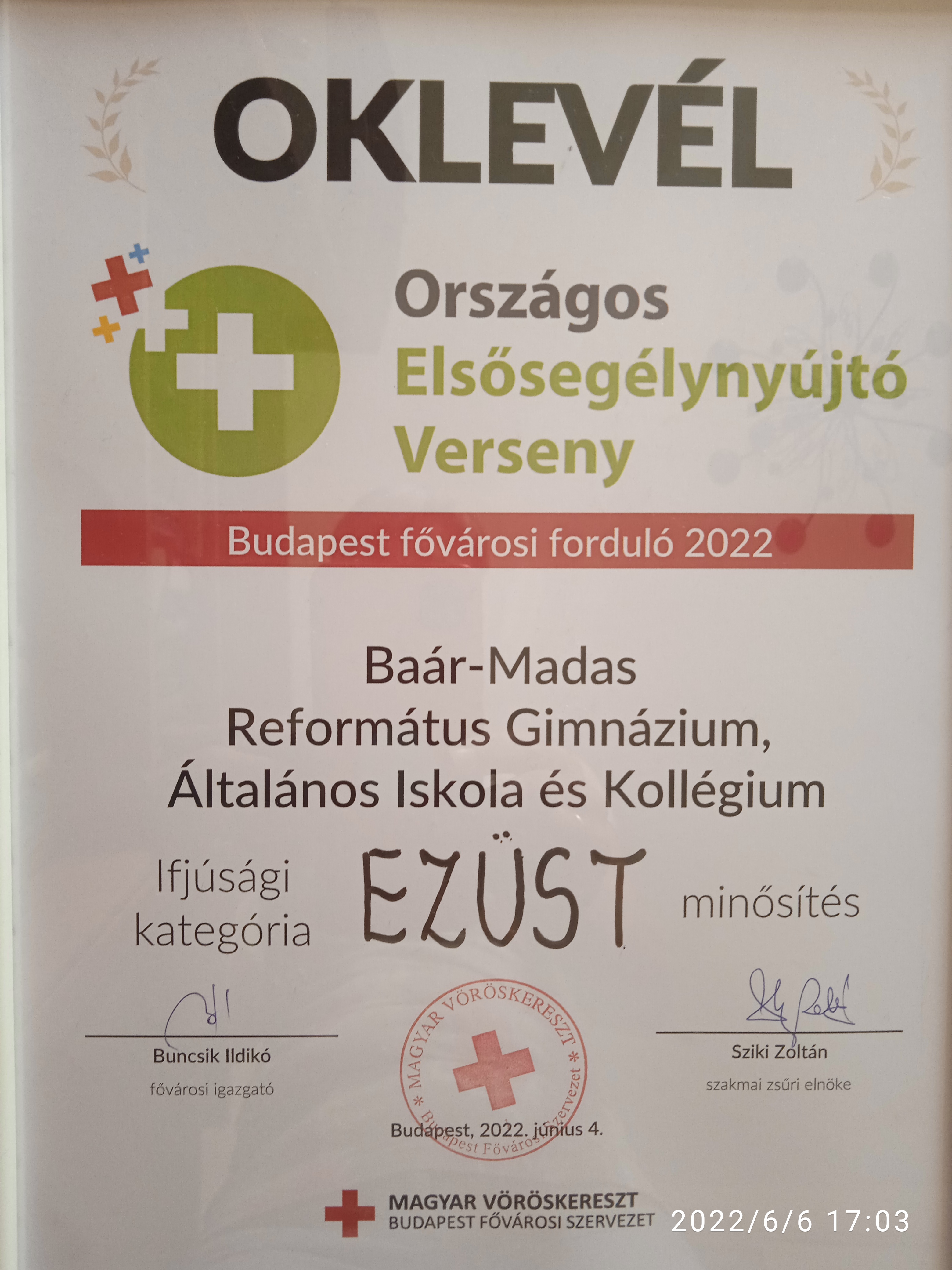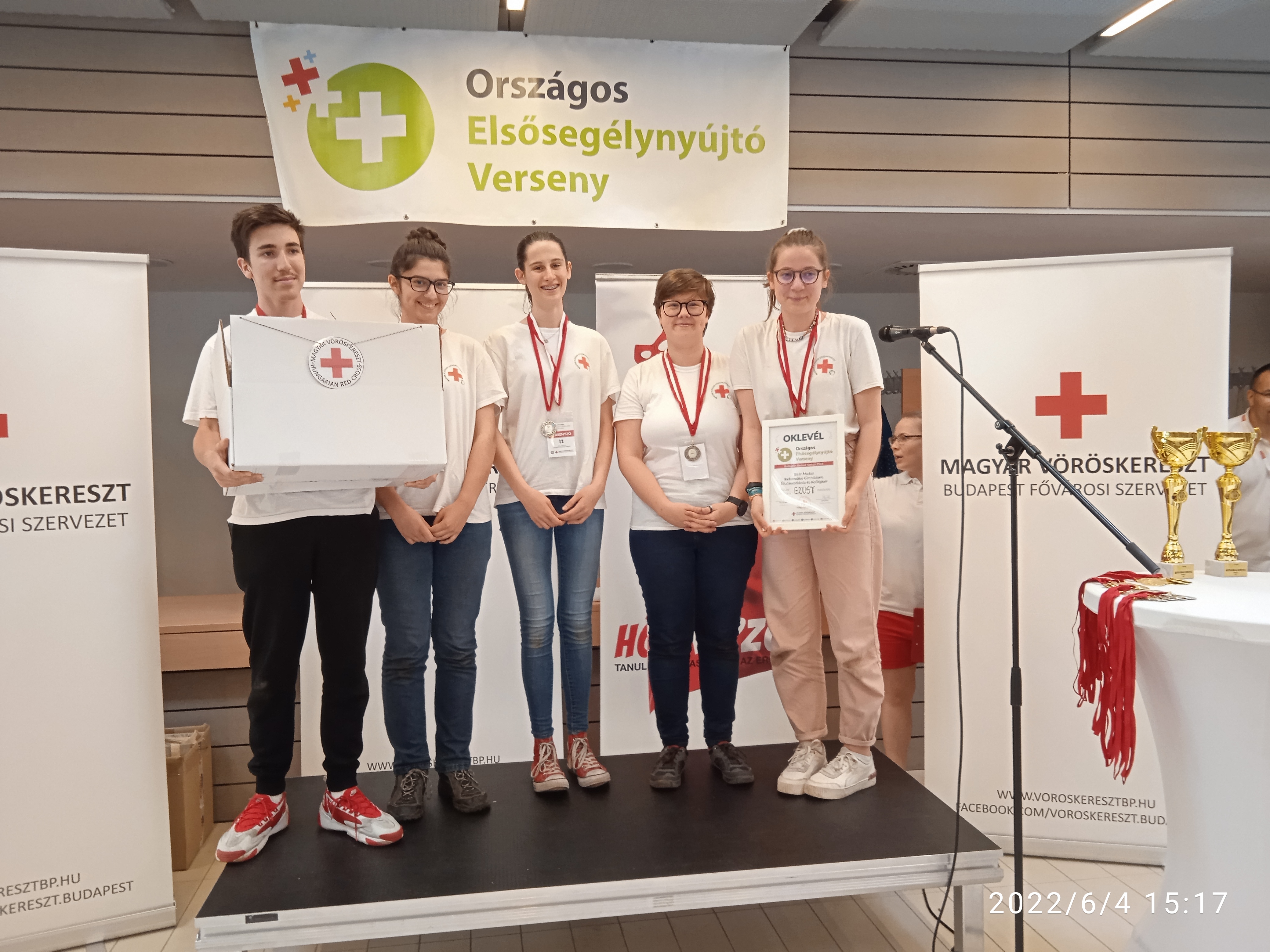 A Magyar Vöröskereszt által szervezett Országos Elsősegélynyújtó Verseny budapesti döntőjébe iskolánk csapata - NAGY ZSÓFIA, SUBA CSENGE, BARTHA LILLA, SZŰCS CSENGE(11.d) Bereczki Máté(9.b)- bejutott, ahol MÁSODIK helyezést ért el.