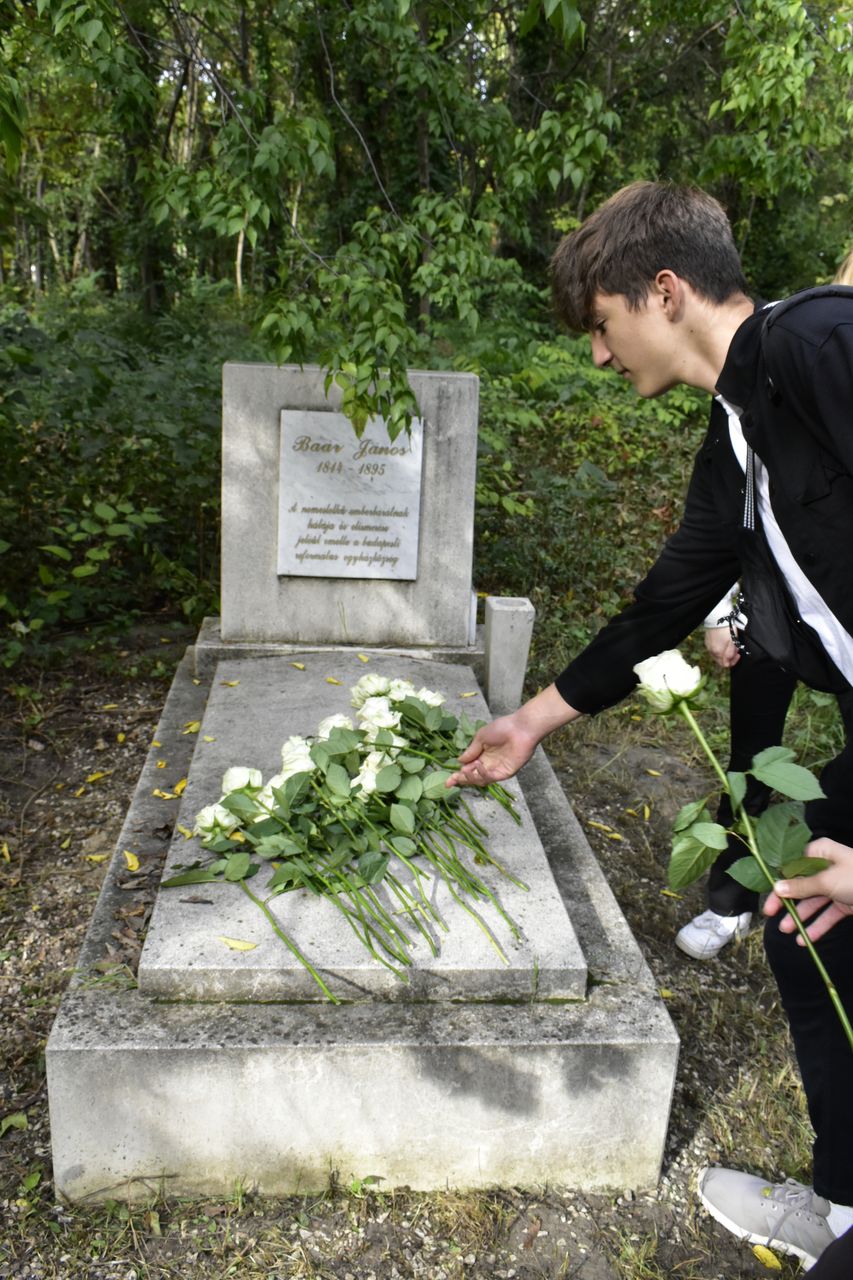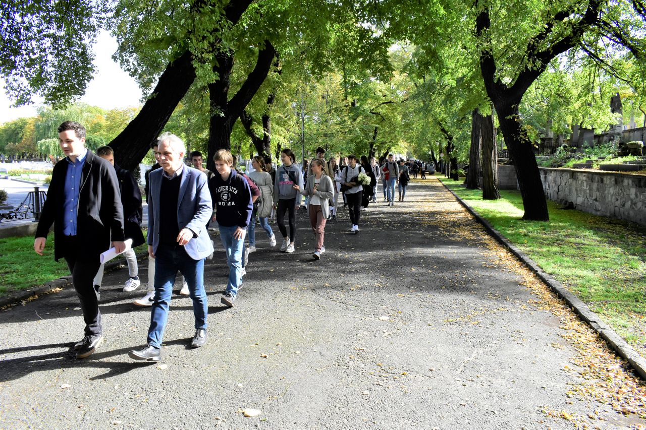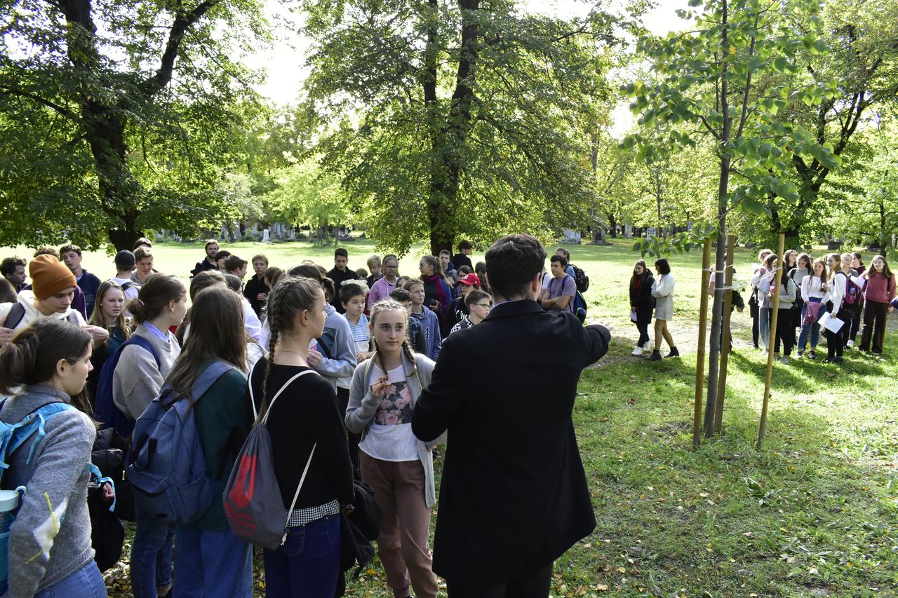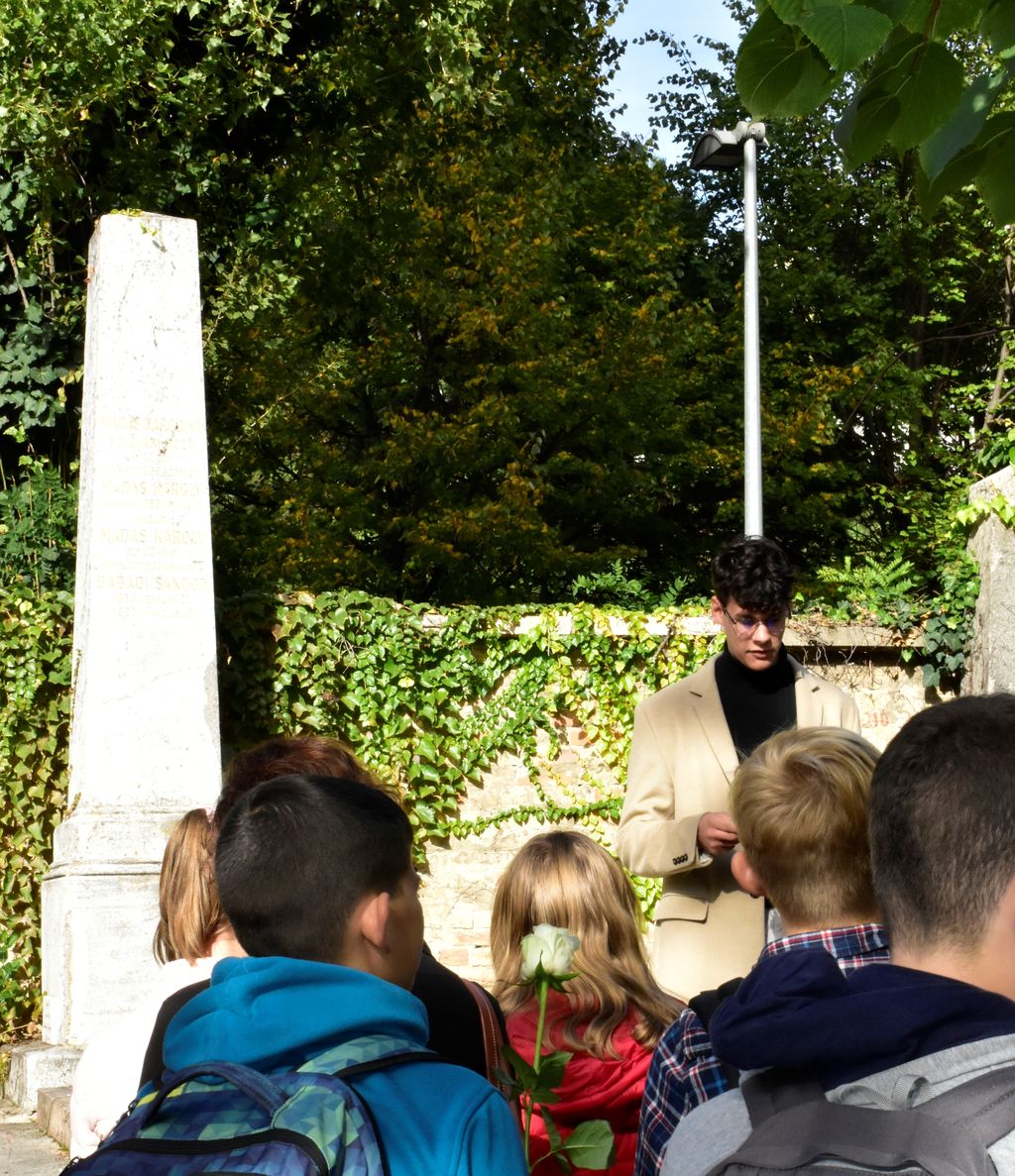 Iskolánk hagyományaihoz híven a gimnázium három új osztályával (7.b, 9.c, 9.d) idén is ellátogattunk a Fiumei úti sírkertbe, hogy lerójuk tiszteletünket intézményünk alapítói és névadói, Baár János és Madas Károly előtt. A temetőben a csoport először Madas Károly síremlékénél tartott rövid megemlékezést, amely során a diákok egy-egy szál fehér rózsát helyeztek a sírkőre. Ezt követően – a szép időtől és a környezettől megihletődve a szükségesnél valamivel hosszabb útvonalon – átsétáltunk Baár János sírjához, ahol szintén virágokkal, versmondással és egy rövid áhítattal mondtunk köszönetet azért, hogy ma is építhetünk a két névadónk által lefektetett alapokra.