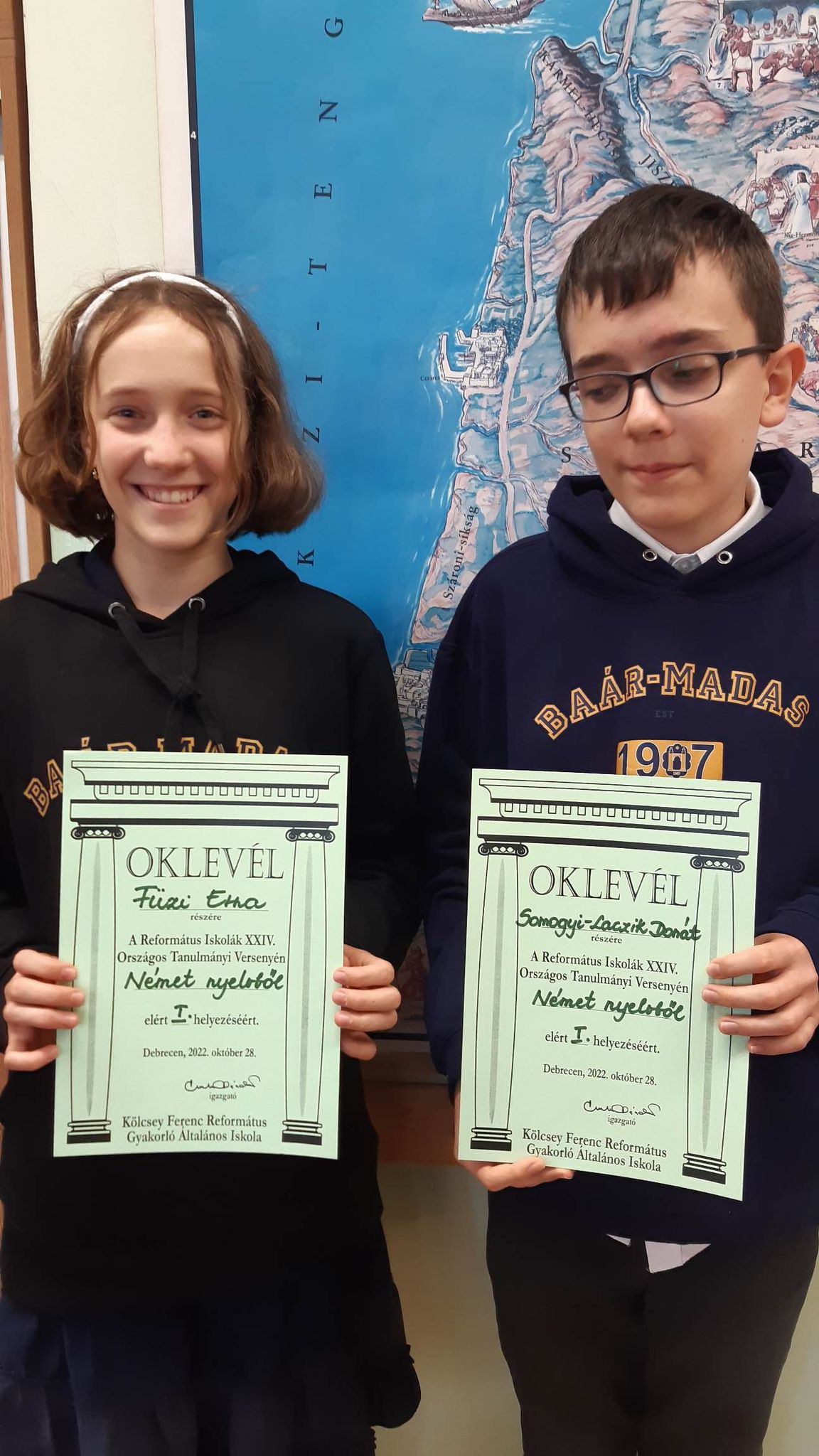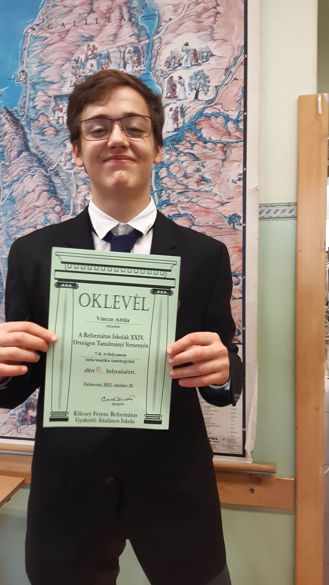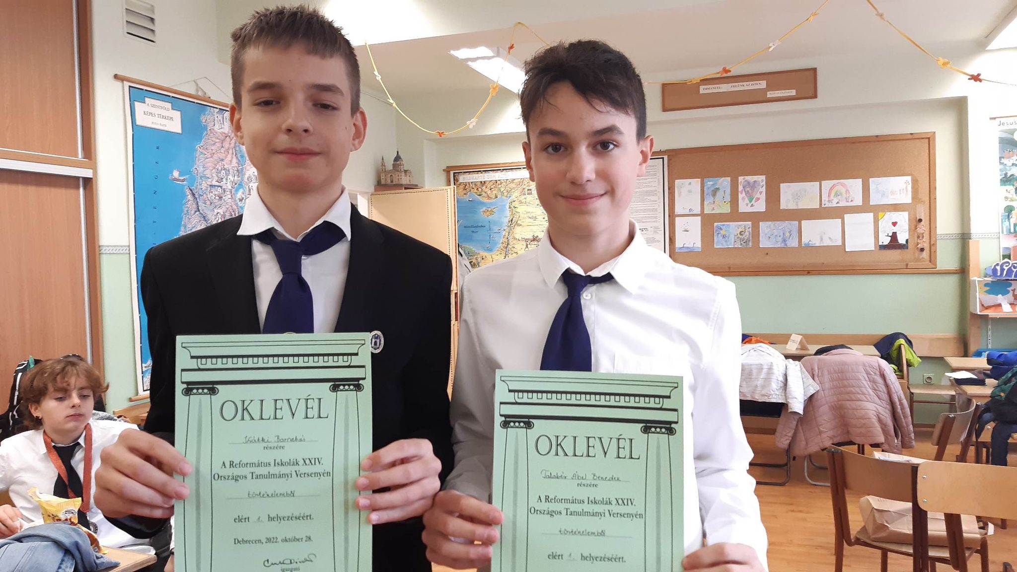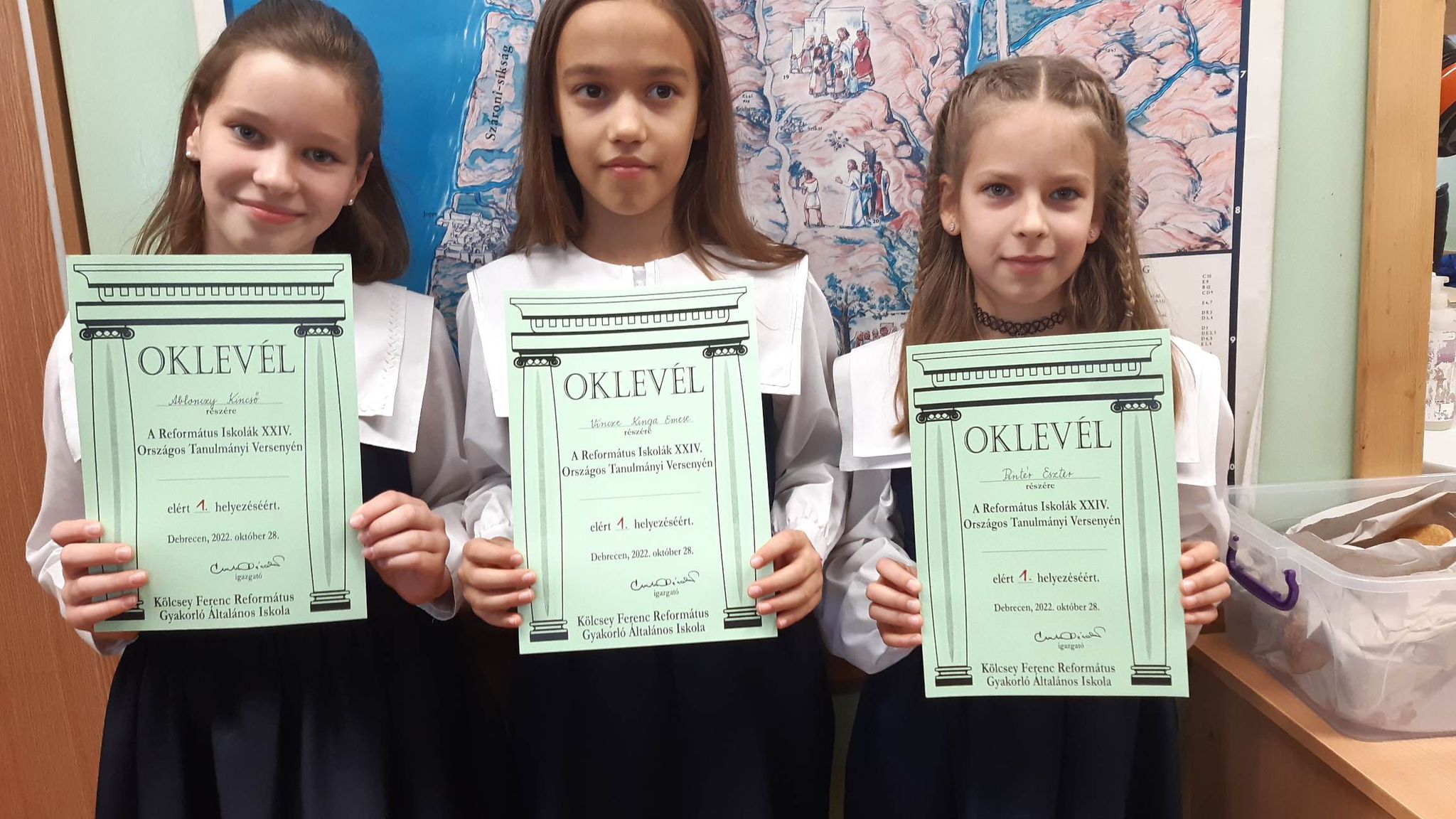 Huszonkét tanulónk vett részt Debrecenben a Refomátus Iskolák XXIV. Országos Tanulmányi Versenyén. I. HELYEZETTEK lettek az anyanyelvi verseny 3-4. osztályos kategóriában: PINTÉR ESZTER (3.o), ABLONCZY KINCSŐ, VINCZE KINGA EMESE (4.o), történelemből (6-7. osztály: TALABÉR ÁBEL BOTOND BENEDEK (6.a), KRÁTKI BARNABÁS ZÉTÉNY 7.a), német nyelv 7-8. osztály: FÜZI ERNA, SOMOGYI-LACZIK DONÁT (8.a). MÁSODIK HELYEN végzett informatikából VINCZE ATTILA (8.b), rajzból SASVÁRI LÉDA (4.a), míg bronzérmet szerzett lány kosárlabda csapatunk: ANTOLIK ÉDUA, HORVÁTH BORKA, MATUZ LILI, MÉRÉSZ CSENGE (8.a).