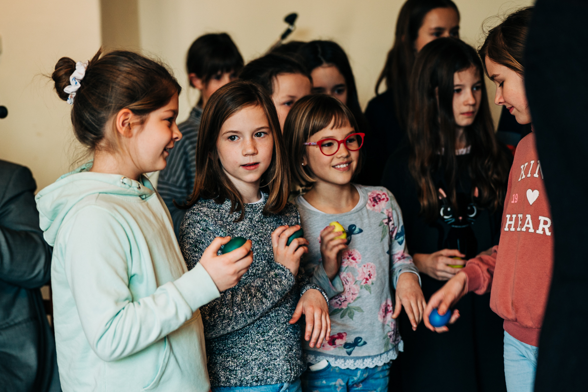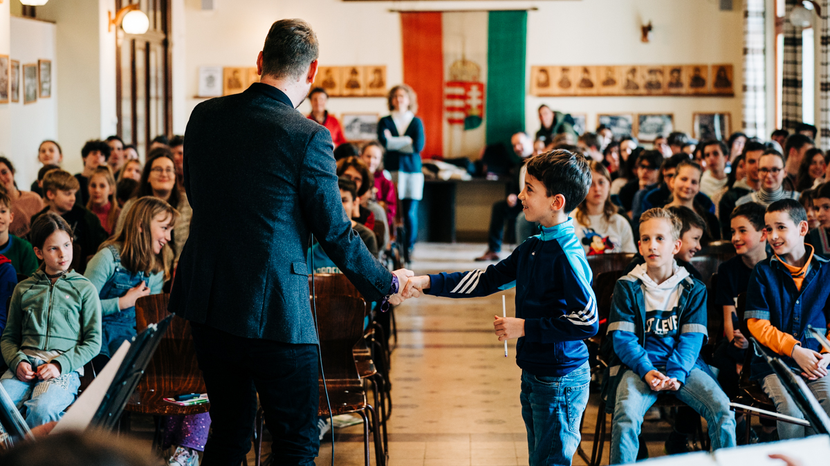 Az előadott művek között, a zenekar művészeti managere, Hornyák Balázs mondott érdekességeket a zeneszerzőkről, illetve az elhangzott zeneművekről. A diákok felé intézett kérdéseivel pedig zenei ismereteiket tesztelte. Zenei tájékozottságunkat illetően nem vallottunk szégyent, még kisiskolásaink is felismerték, illetve meg tudták nevezni a vonós hangszereket és a fotókon látható zeneszerzőket. Persze a tanulóknak kecsegtető volt a jó válaszért elnyerhető csoki vagy egyéb jutalom.
