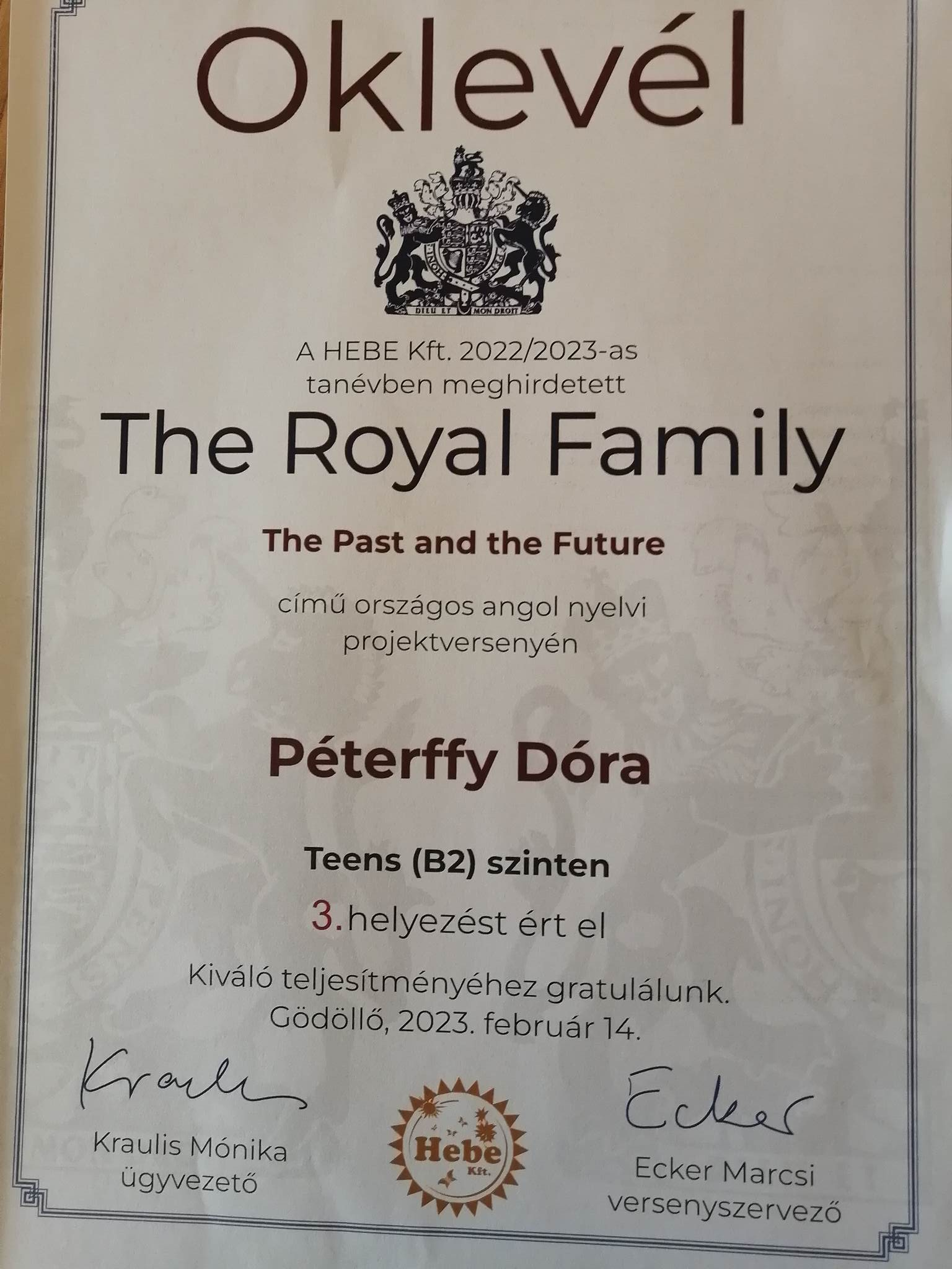 Péterffy Dóra 9.d osztályos tanuló részt vett az előző félévben egy levelezős versenyen, amit a királynő halála után szerveztek. Sok, változatos feladatot kellett megoldania a verseny során, nagyon sokat kellett olvasni Erzsébet királynő életéről, és az ehhez kapcsolódó feladatokat megoldania.