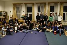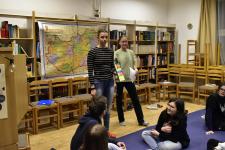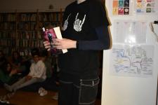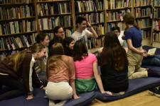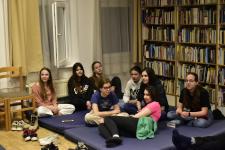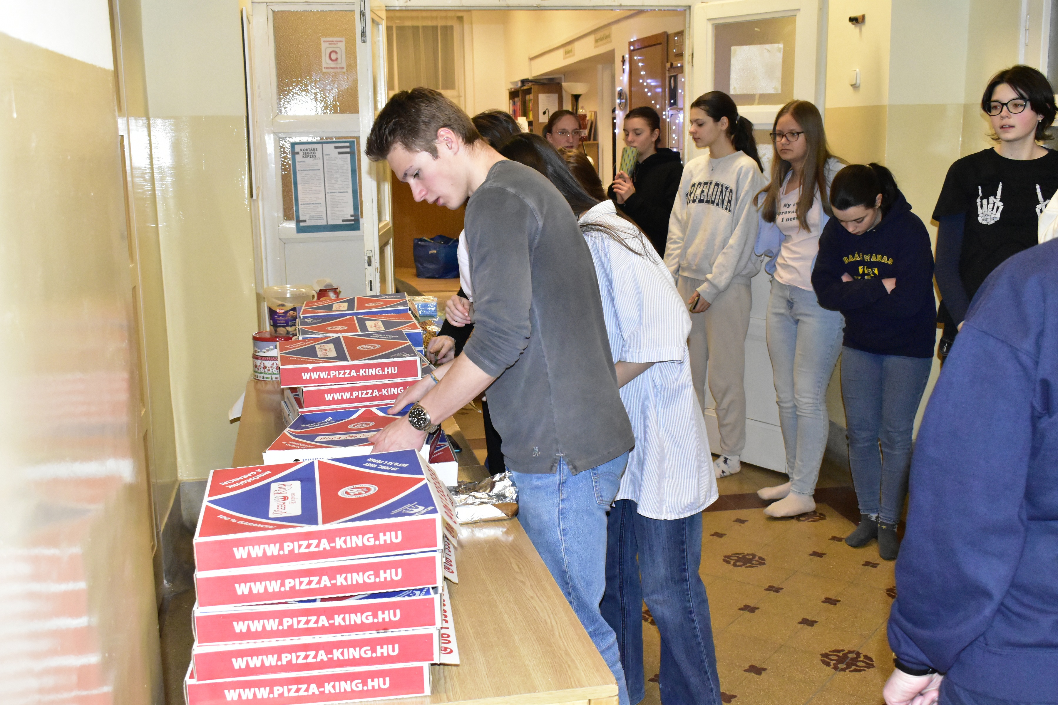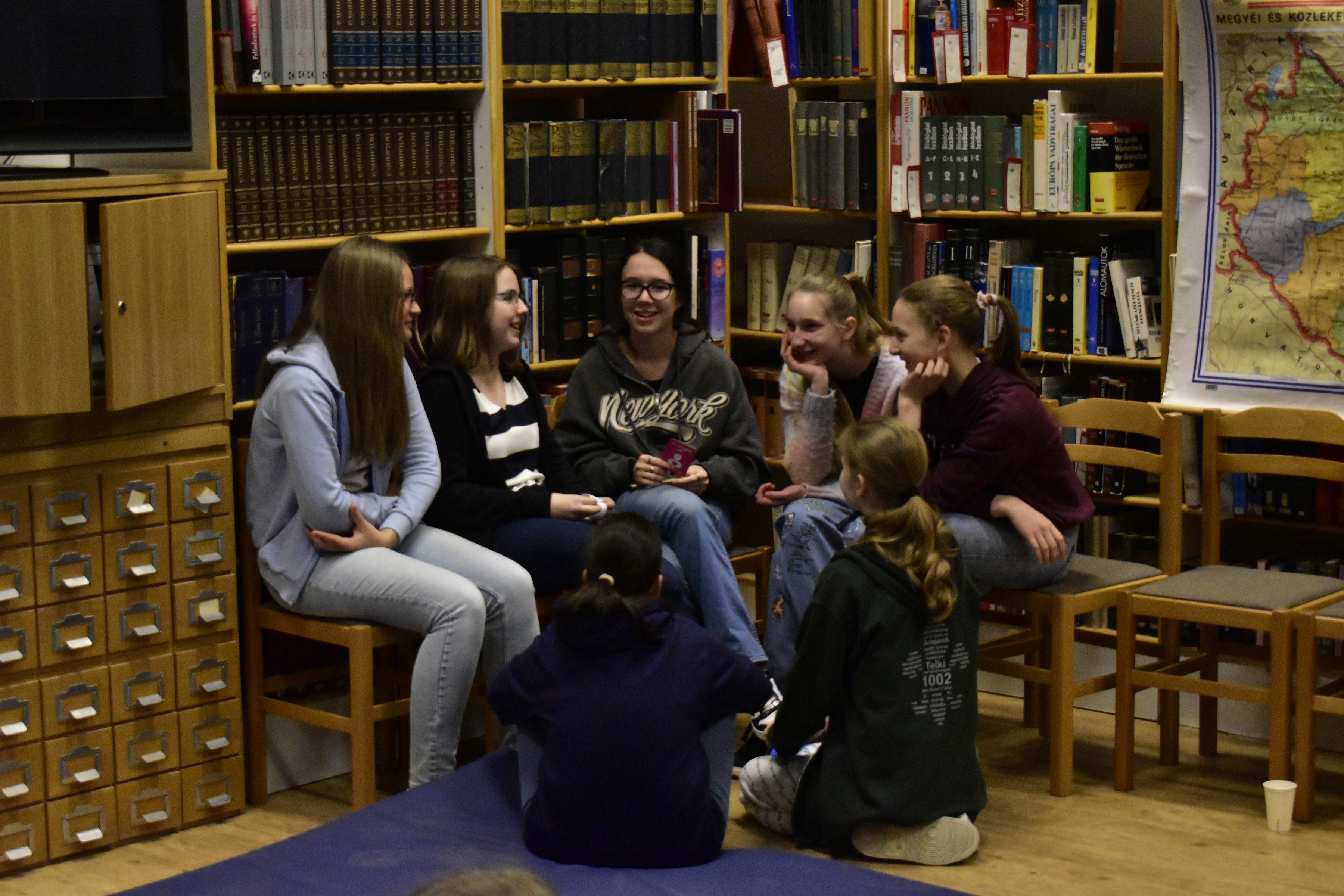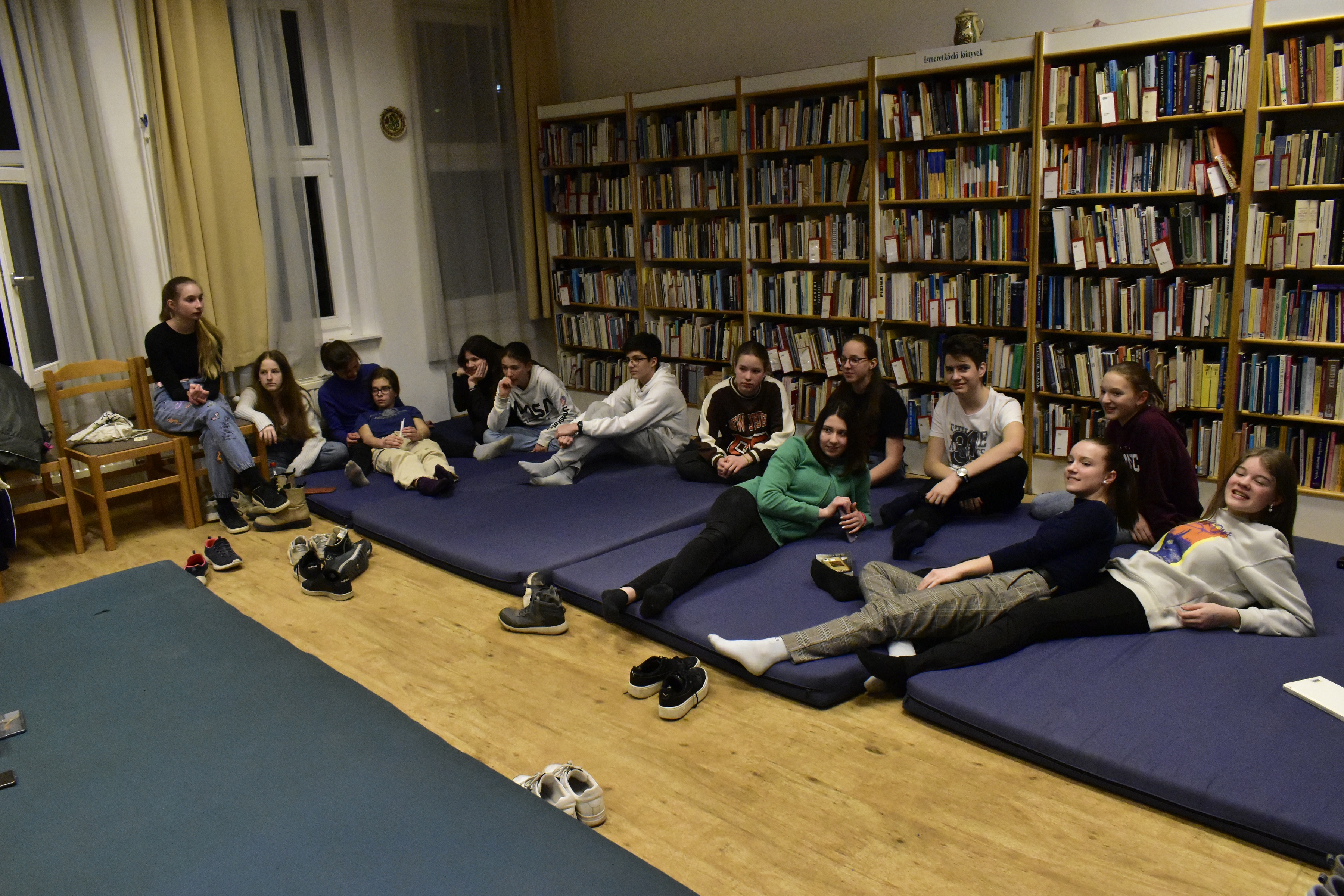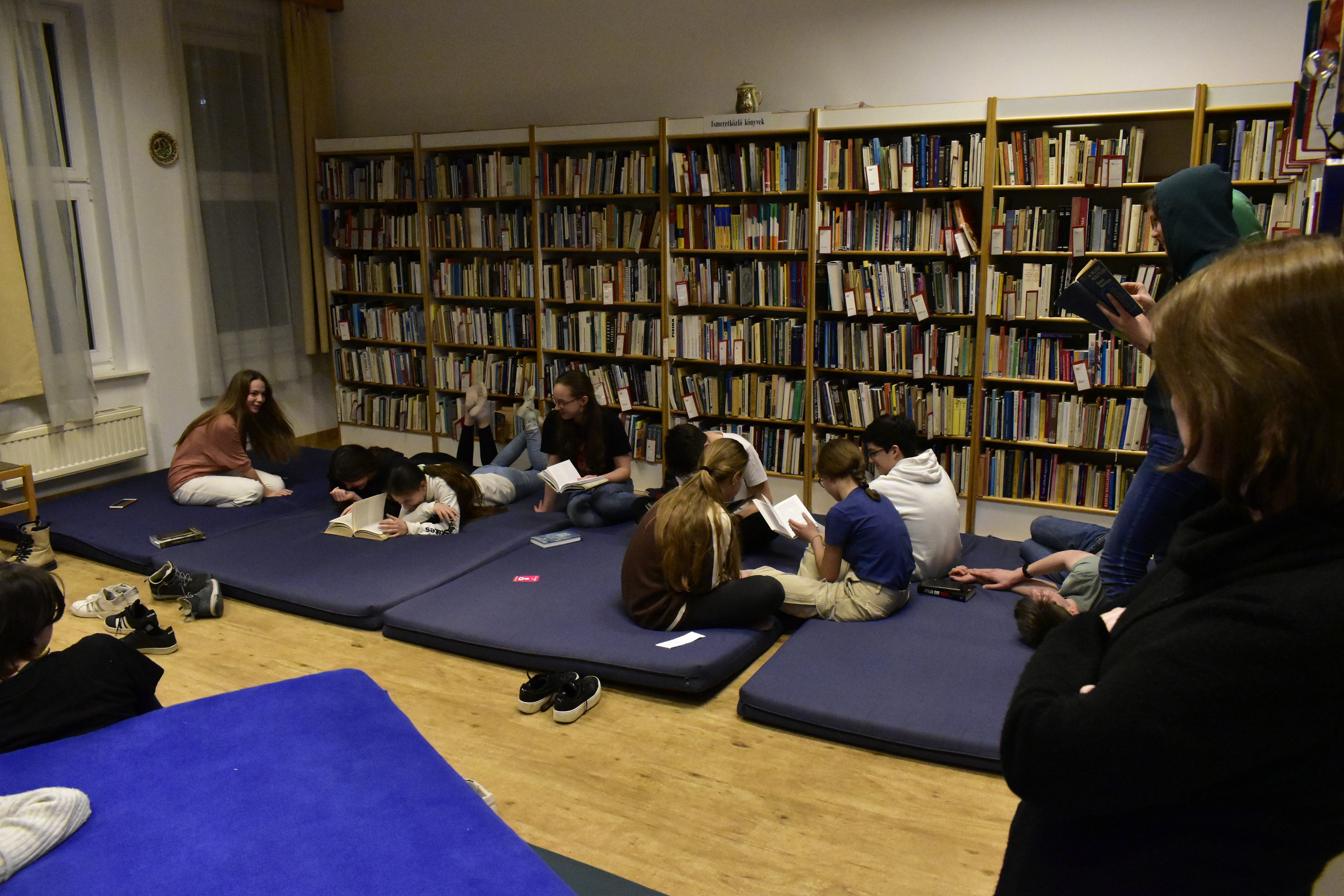 Amikor mindenki megérkezett, egy játékkal indítottuk az eseményt, aminek segítségével kicsit jobban megismertük egymást. Egy drámajáték keretein belül állóképeket alkottunk, majd csapatonként kaptunk egy-egy kérdést is, melyet közösen válaszoltunk meg. Ezután kis szünetet tartottunk, ami alatt az általunk hozott csemegékből falatoztunk. Amikor végeztünk, a Honfoglaló játékkal folytattuk az estét, amit két lelkes diák szervezett meg, és melyet rengeteg nevetés és izgalom kísért. A nagy küzdelem végére megéheztünk, és jó étvággyal estünk neki a pizzának. Miután jóllaktunk, a bátor vállalkozók felfedező útra indultak a sötét épületben. Ezt követően összegyűltünk, és meghallgattuk a 14 könyvajánlót. Sok érdekes és elgondolkodtató történetről hallhattunk, melyek közül szavazással választottuk ki azt, amelyből az este folyamán egy részletet felolvastunk.