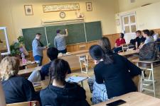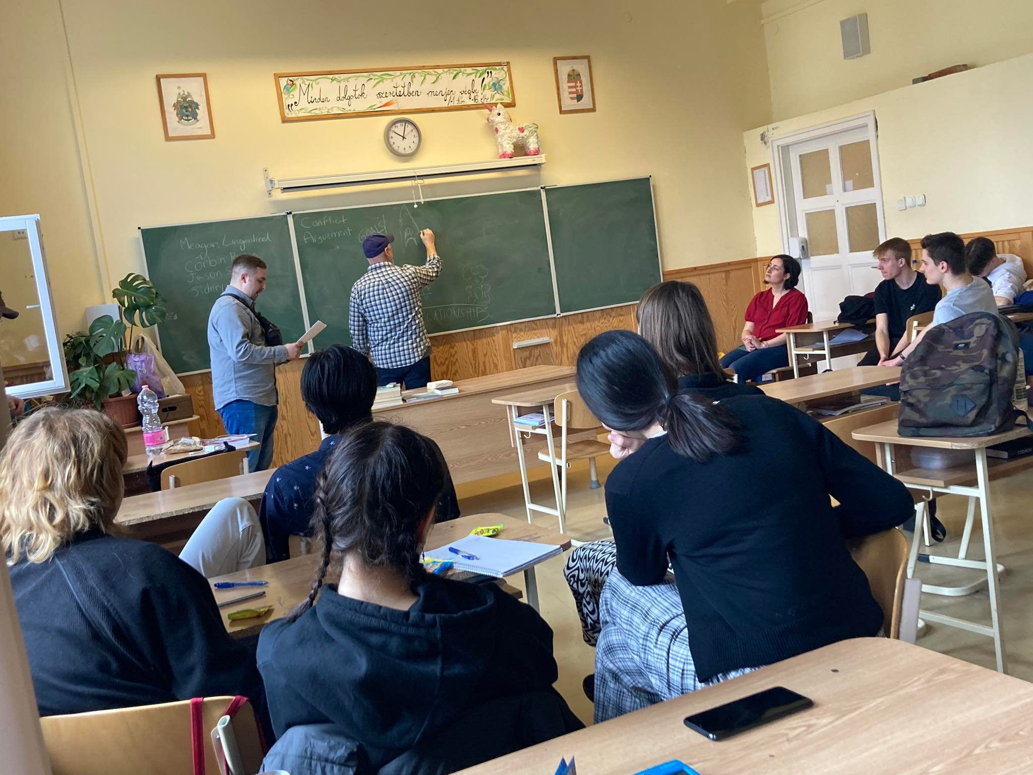 Évek óta látogatják angol óráinkat a Fiatalok az Élet Küszöbén munkatársai, ezért hát nem volt senki számára meglepő, amikor múlt héten megjelent egy csapat amerikai az iskolánkban. A lelkes, kedves, kreatív missziós önkéntesek a szervezeten keresztül iskolákat látogatnak meg, és amerikai kultúrával megspékelt, izgalmas témákat feszegető beszélgetéseket kezdeményeznek a diákokkal. Idén a konfliktusmegoldási módszerek kerültek napirendre, és a szerencsésebbek óra végére megtudhatták, vajon teknősként, cápaként vagy netán rókaként viselkednek egy-egy feszültebb helyzetben. A vetélkedők nyertesei pedig természetesen boldogan markolhattak bele egy hatalmas zacskó amerikai cukorkába.