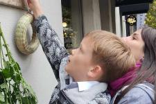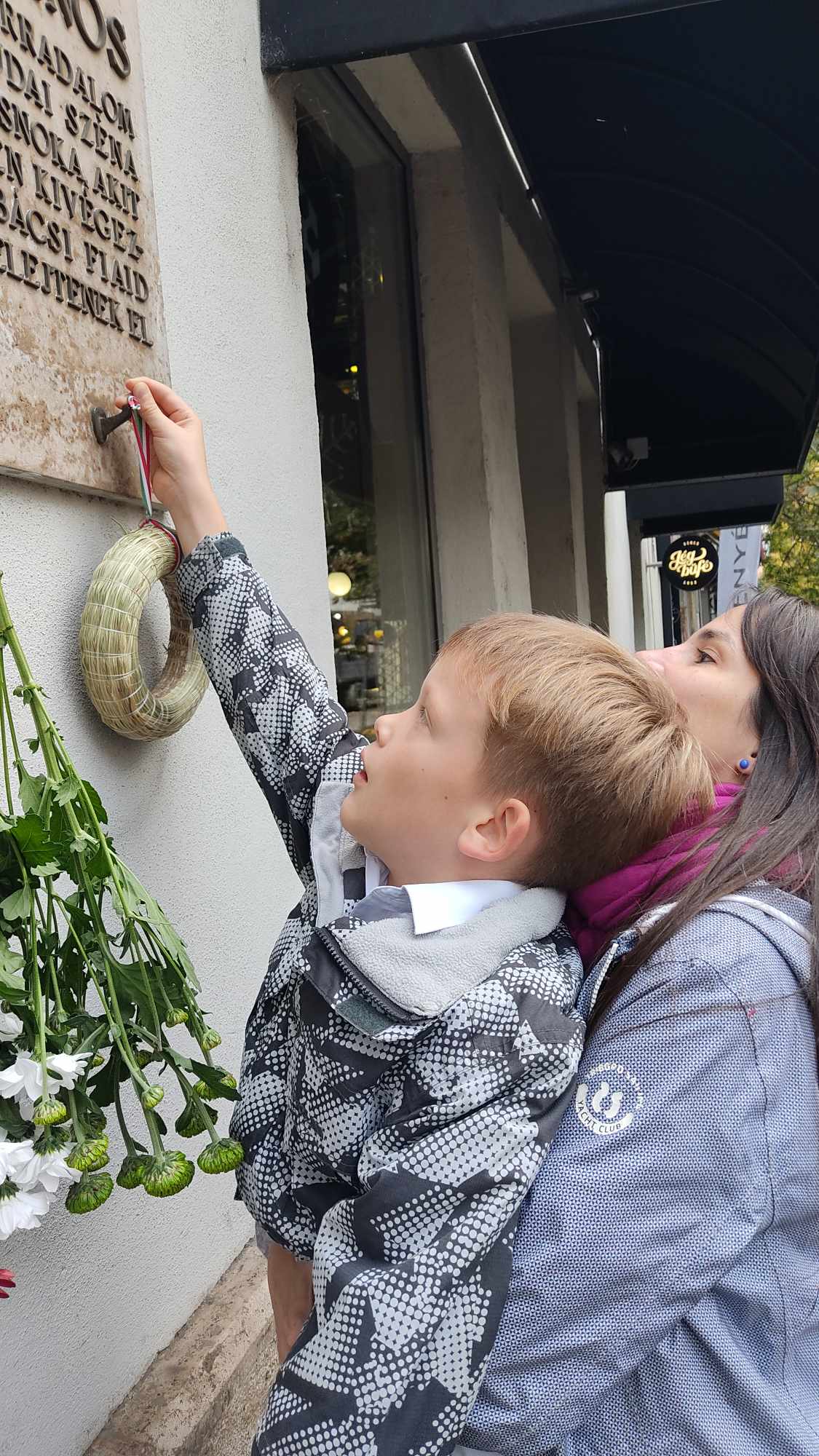 A visszaúton minden osztály lerótta tiszteletét Szabó János emléktáblája előtt (a Fény utca 15. szám alatt): a felsősök egy-egy piros-fehér-zöld virággal, míg a legfiatalabbak koszorúalapjára a másodikosok helyezték fel a borostyán díszítést, a harmadikosok a piros szívet, a negyedikesek pedig a fehér madarat, a hatodikosok a szövegezett nemzetiszín szalaggal kötötték át az emlékezés szimbólumait.
