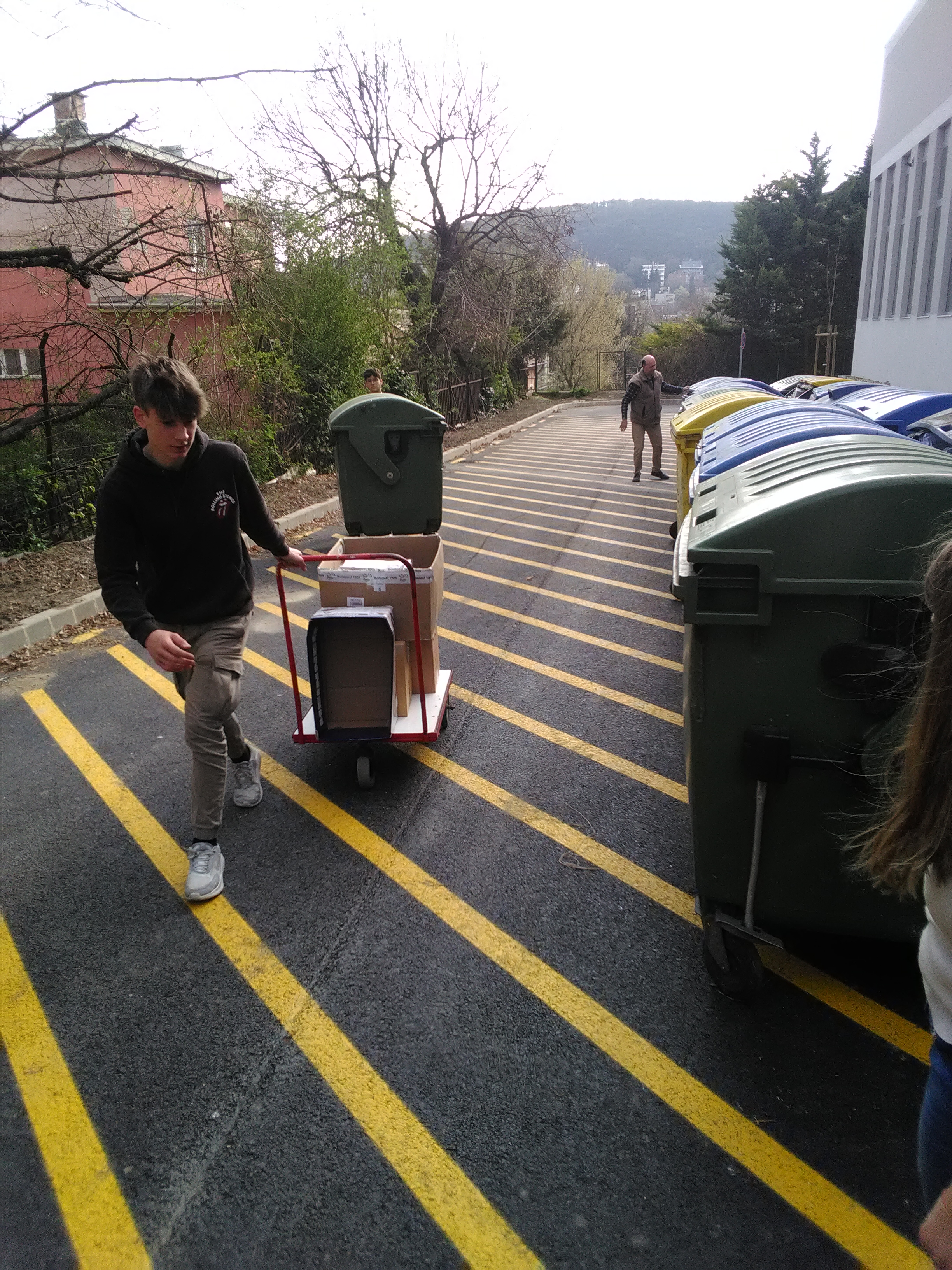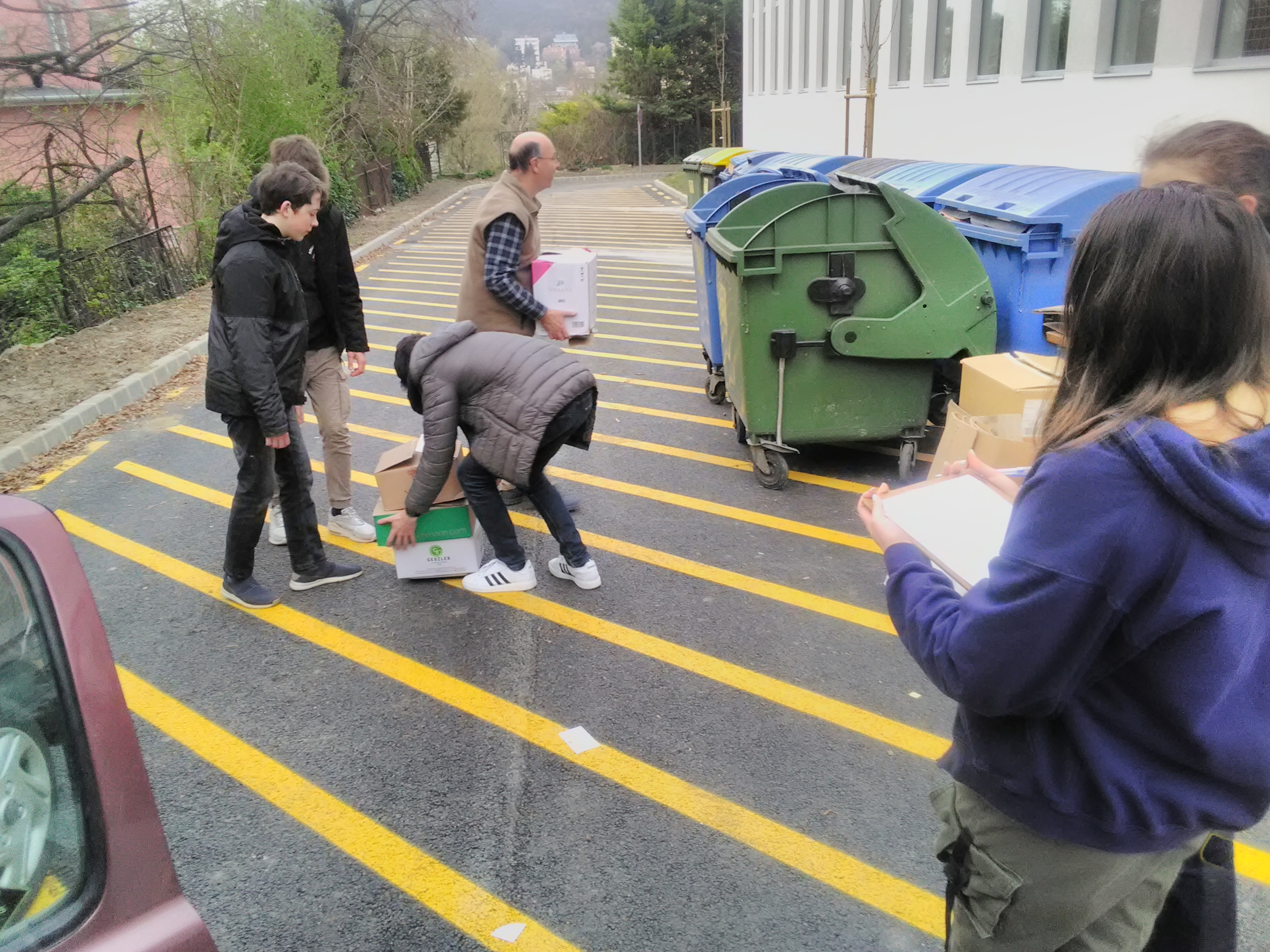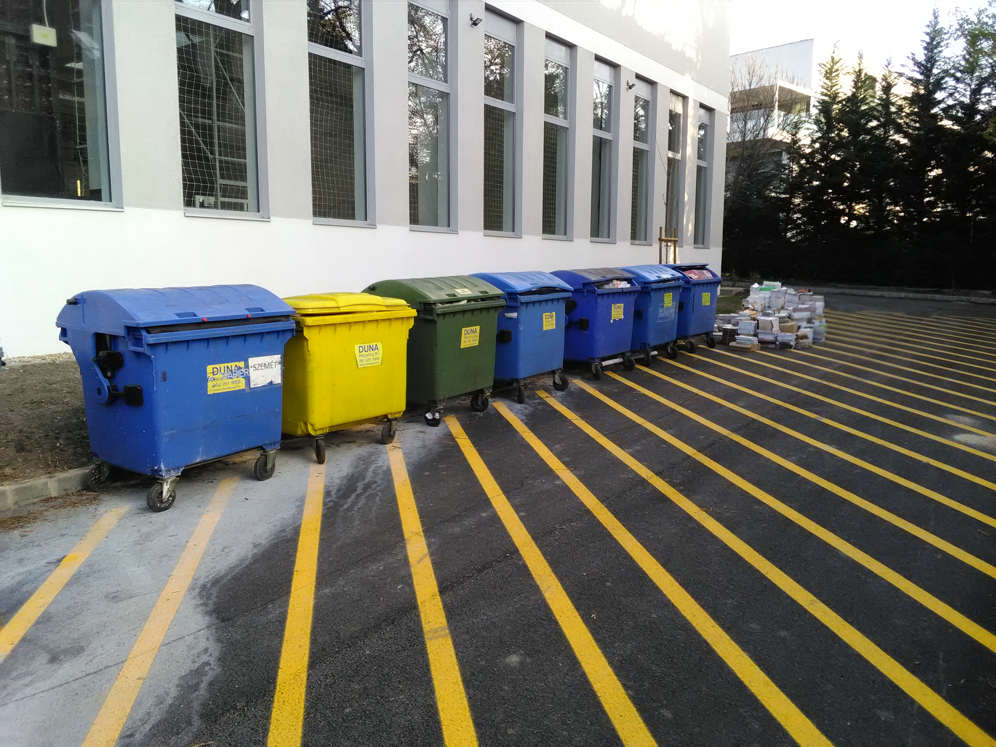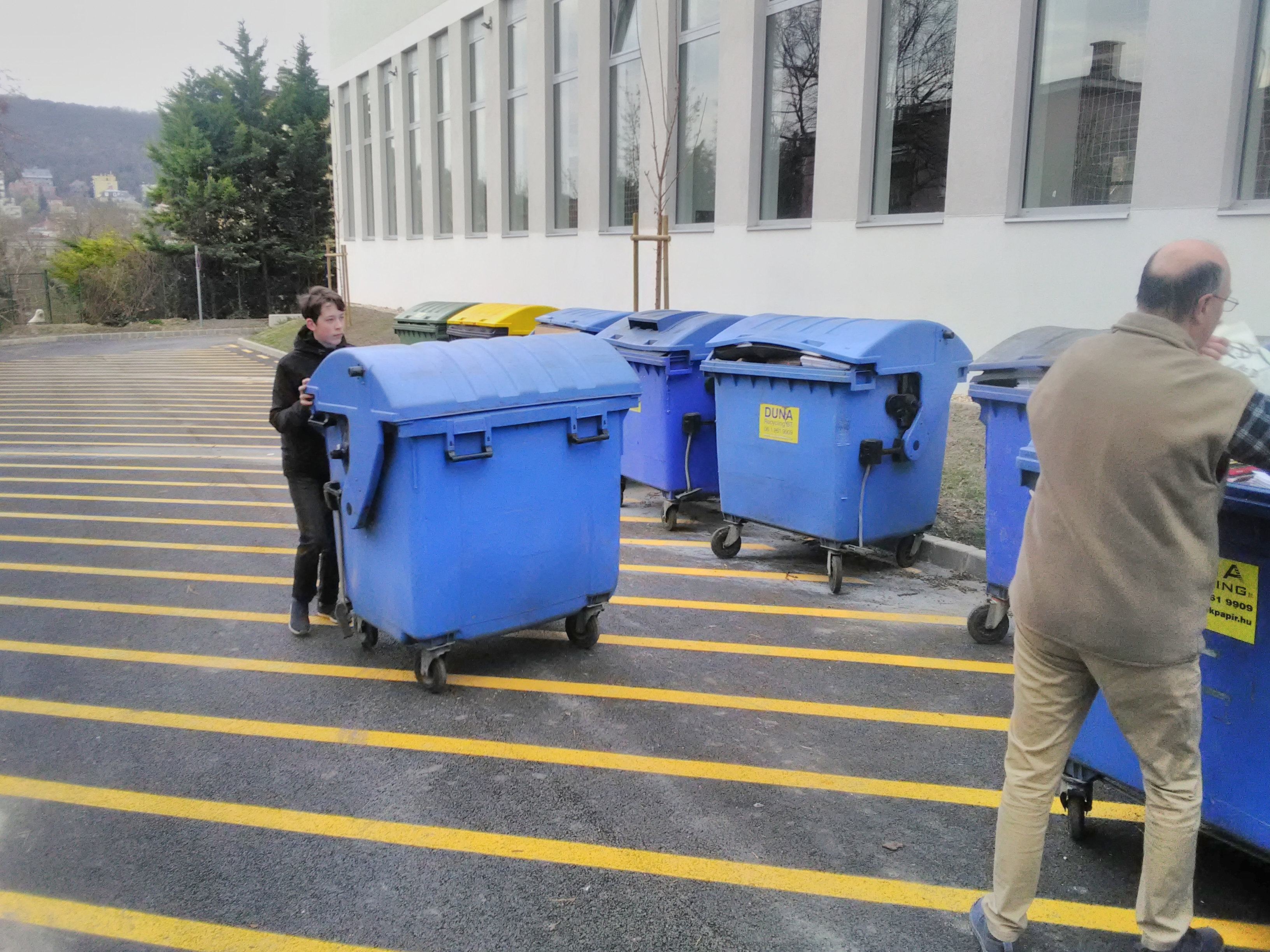 Tavaly megváltozott a hulladékgazdálkodás rendszere, így az a cég, amellyel évtizede bejáratott módon együtt tudtunk dolgozni, nem vállalta a feladatot. A gondnok úr keresgélése nyomán sikerült megoldani a helyettesítésüket, de a rutin hiányzott a kapcsolatból. Konténerek helyett gurulós kukákat kaptunk. Ennek egy előnye volt: mi is tudtuk mozgatni őket – üresen. Viszont a cserét hozó teherautó nem tudott beállni az iskolaudvarra, a teli kukák kihordása az utcára emberfeletti feladatot jelentett nekik (köszönjük a karbantartóink és az iskola dolgozóinak a segítségét!)… és fele annyi pénzt kapunk egy kiló papírért, mint két éve…