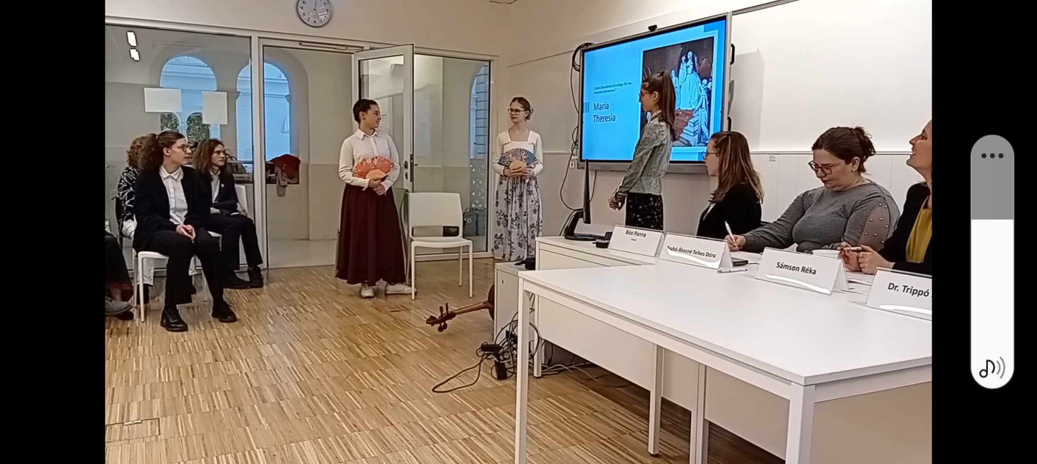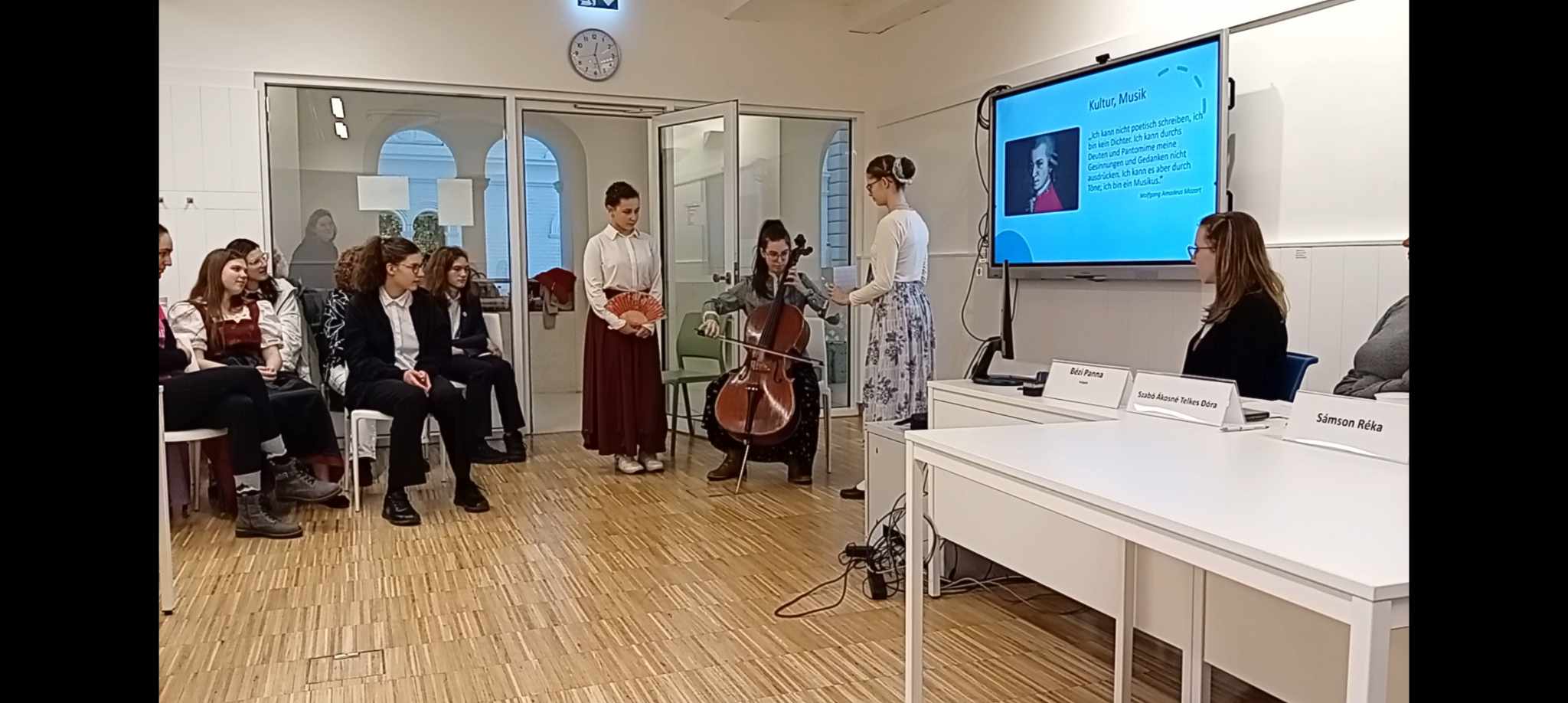 A döntőbe összesen 10-10 csapat jutott be két kategóriában. Feladatuk a német nyelvű országok bemutatása volt. Iskolánkból az Erste Schritte kategóriában a 9.d osztály Schöne Schmetterlinge csapata (EPER HELKA, DÁLNOKI LUCA,HAJÓS LILLA) képviselte az iskolánkat. Annak ellenére,hogy egyetlen kilencedikes csapatként, a legfiatalabbként indultak, nagy örömünkre KÜLÖNDÍJJAL jutalmazták a lányok tudását, mert ők írták a legjobb tesztet a versenyzők közül. Az előadásukban megjelent Sissi és 2 udvarhölgye és élőben felcsendült Mozart Kis éji zenéje is.