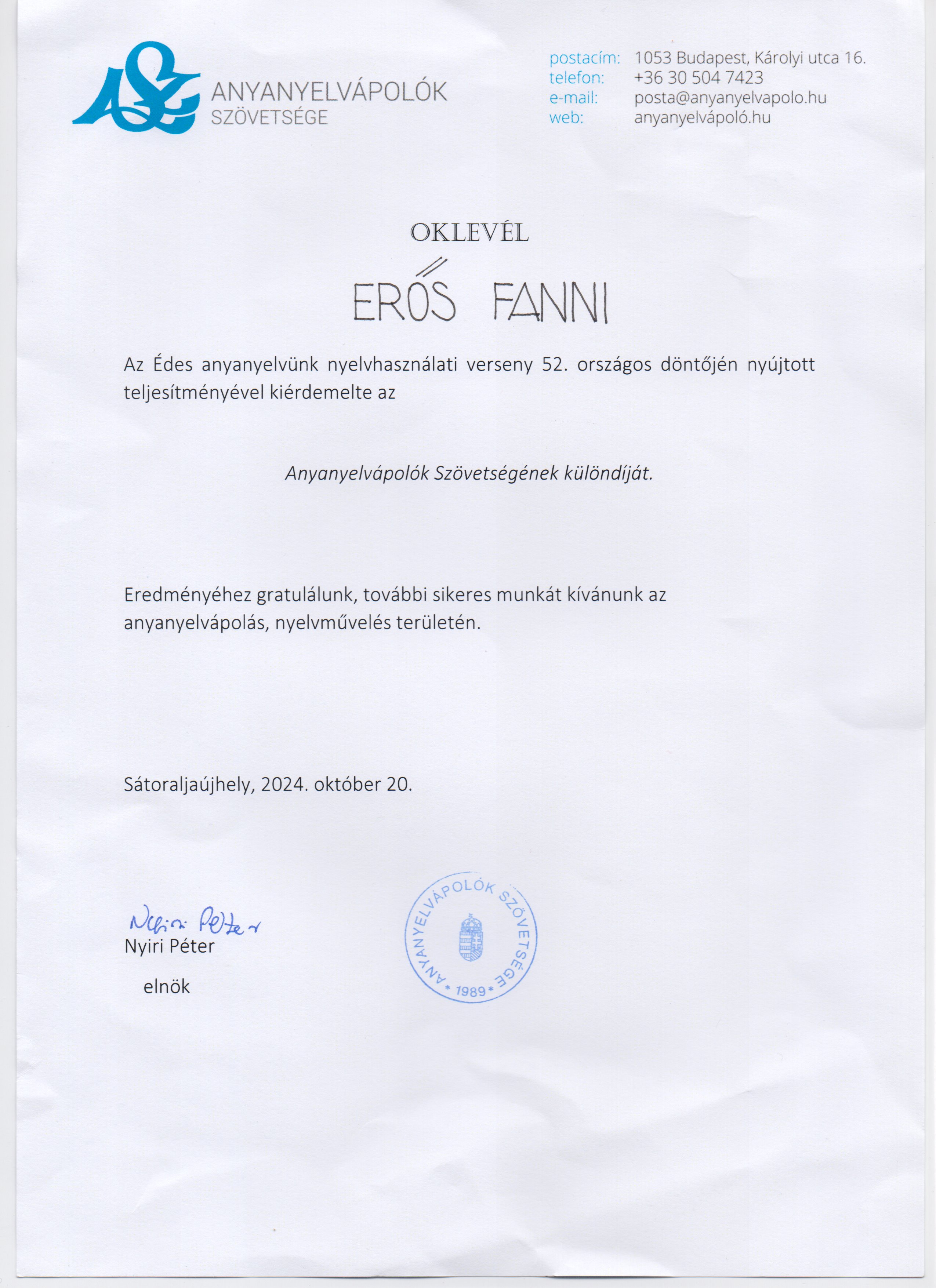 A fővárosi döntőből mindkét versenyzőnk továbbjutott, HABÁNY CSANÁD(11.b) és ERŐS FANNI(11.b) egyaránt eredményesen szerepelt, utóbbi elnyerte az Anyanyelvápolók Szövetségének különdíját.