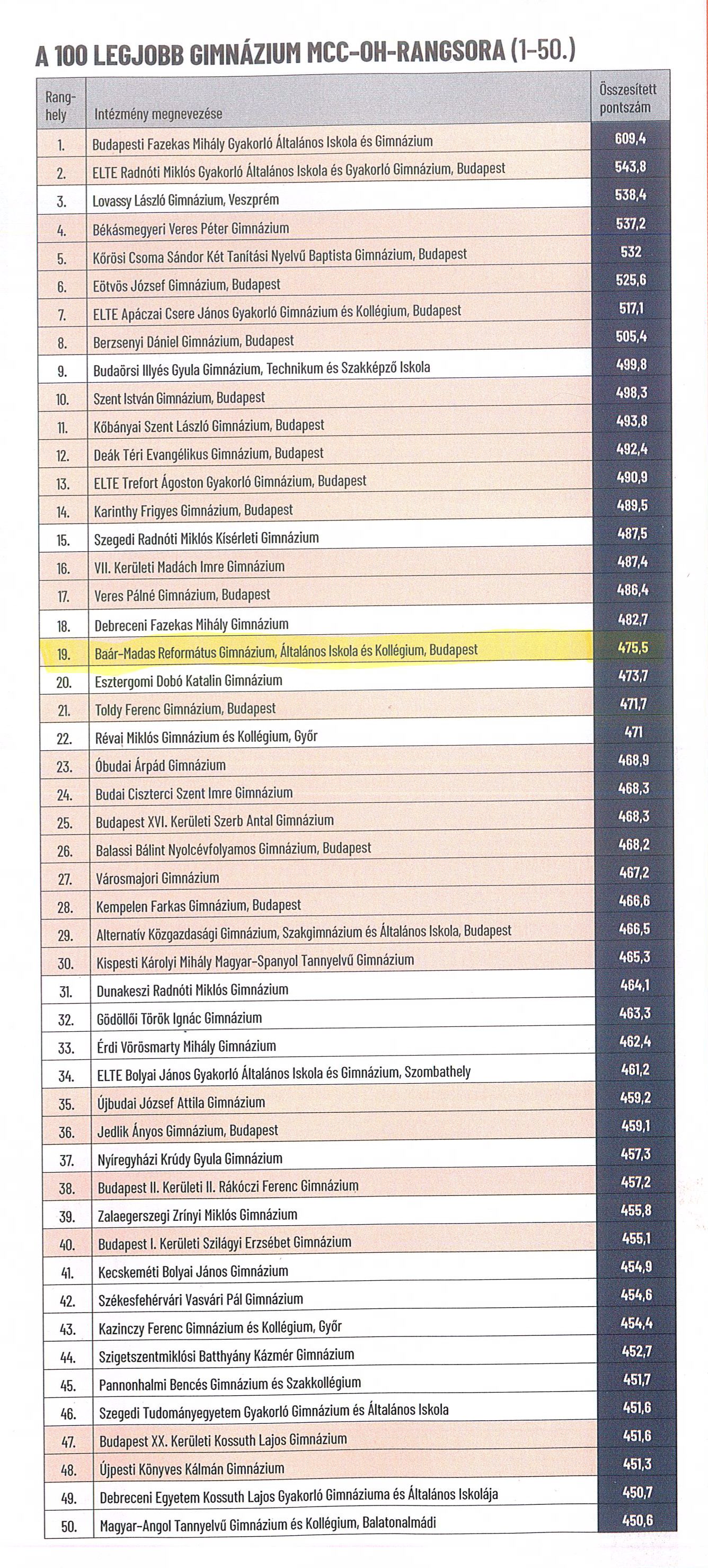 A HVG ősszel megjelent rangsorában a Baár-Madas a 19. helyen végzett. Az MCC és az Oktatási Hivatal is elkészítette a TOP 100-as gimnáziumi listáját. Néhány szempont ebben a vizsgálatban változott, például az iskolákba jelentkezők számát vagy az OKTV eredményeket is figyelembe vették, más elemeket kihagytak. A BAÁR-MADAS ebben a rangsorban is a 19. HELYEZETT lett. Az egyházi gimnáziumok között a HARMADIK, míg a reformátusoknál az ELSŐ helyet foglaljuk el.