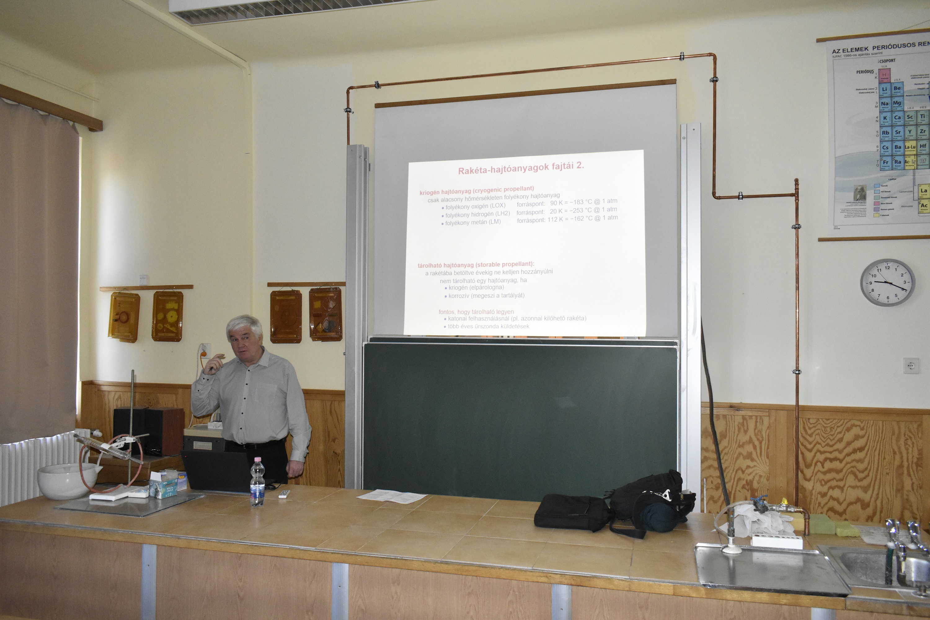 Turányi Tamás, az ELTE professzora először bevezetett minket az űrkutatás történetébe. Bemutatta az űrkutatásban élen járó országokat, például Oroszországot (a volt Szovjetuniót), az USA-t és Németországot. Ezt követően beszélt a különböző hajtóanyag-típusokról. Szó volt még a hőkapacitásról, a hőmérsékletről és a molekulatömegről, valamint azok fontosságáról. Felmerült a fajlagos impulzus kérdése is, amely megmutatja, hogy mennyire hatékony egy rakéta. Az előadás végén összegyűjtöttük a fejlődés nagy állomásait, majd a professzor úr elmesélte, miért nem lett űrhajós. Összességében hasznos, élvezetes előadás volt ez azok számára is, akik nincsenek benne az űrkutatás világában. Nekem nagyon tetszett, sok új, érdekes dolgot tudtam meg a témáról. (Kruchina Lilla 9. b)