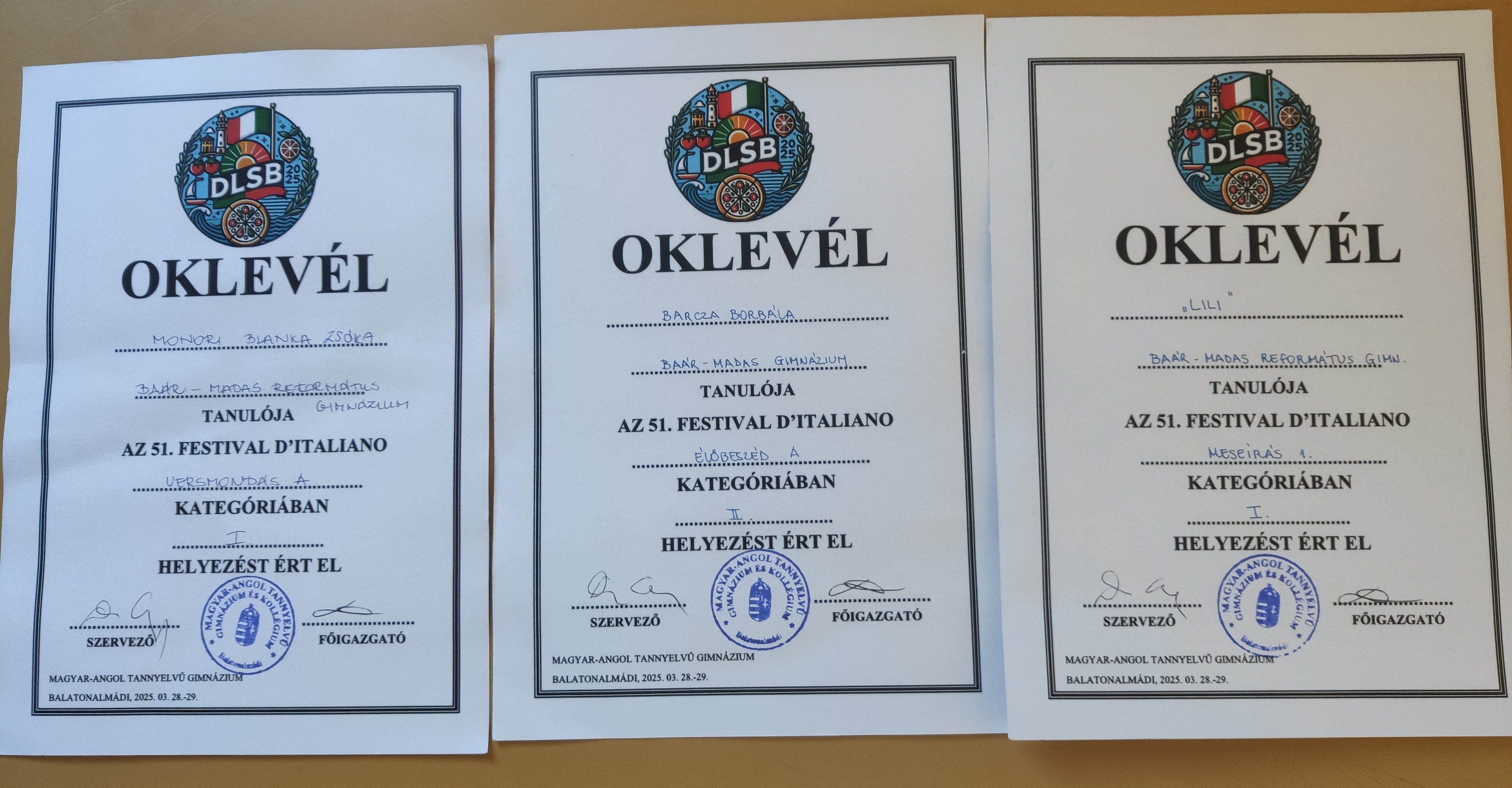 Idén is részt vettünk az ország egyetlen olaszos versenyén, a Festival d’italianón, amelynek idén Balatonalmádi adott otthont március 28-29-én. Ezen a két esős tavaszi napon nyolc diákunk vett részt a megmérettetésen vers- és prózamondás, élőbeszéd, meseírás és kultúrtörténeti vetélkedő kategóriában. A közel nyolcszáz résztvevőt megmozgató eseményen a versenyszámok mellett fogadáson és egy olasz folk-punk zenekar, a Mandalamarra koncertjén is részt vehettünk. Többen is eredményesen szerepeltek a diákjaink közül, így Monori Blanka Zsóka (9.c) a versmondás “A” kategóriát, Diószeghy Lili (11.c) pedig a meseírás “A” kategóriát nyerte meg, míg Barcza Borbála (10.b) második helyet ért el az élőbeszéd “A” versenyszámban.