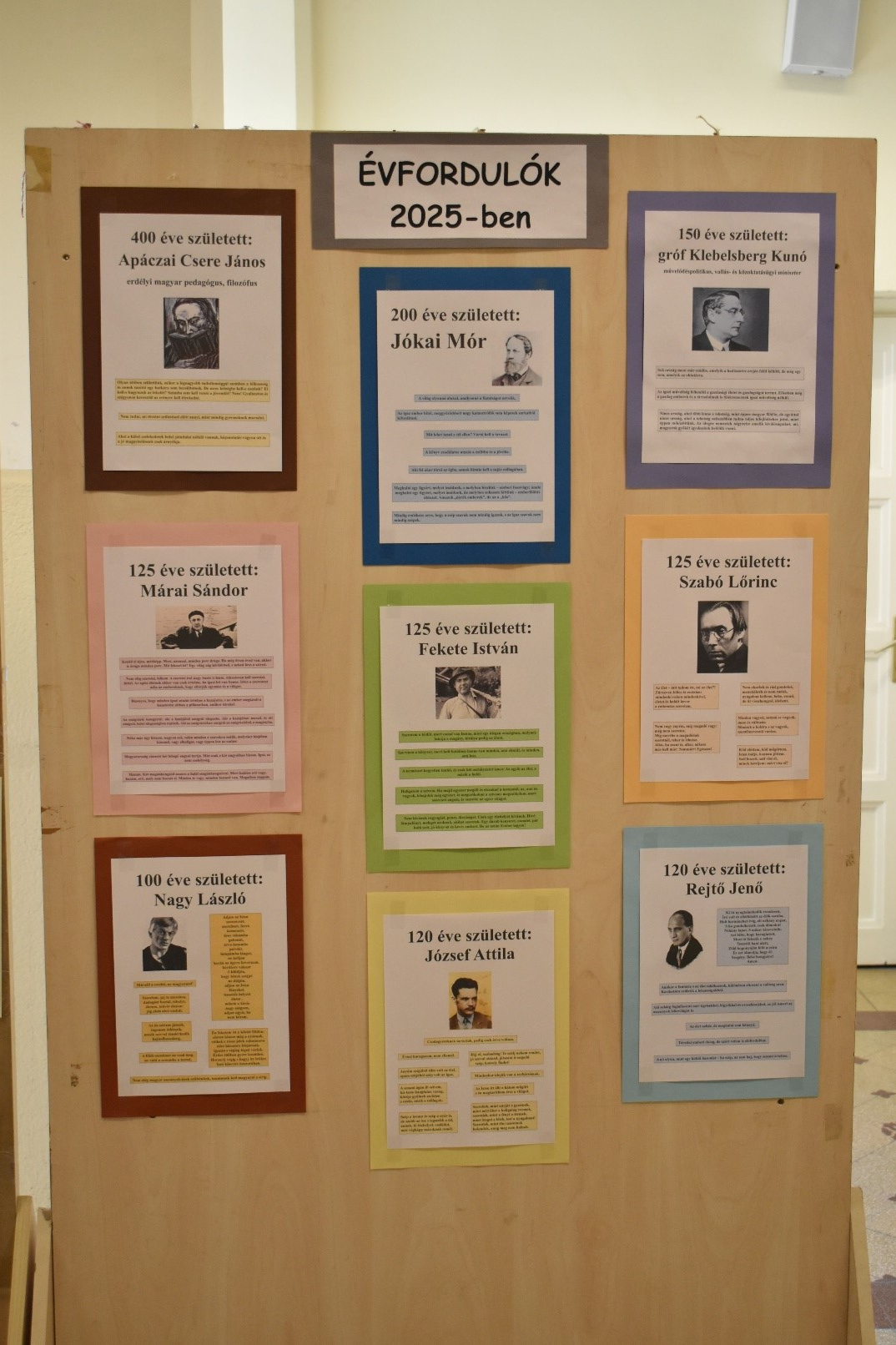 Sokan összegyűltünk április 11-én az egyik szünetben a tanári előtti aulában, hogy közös énekléssel ünnepeljük a magyar költészet napját, s emlékezzünk a 120 évvel ezelőtt ezen a napon született József Attilára. Ám 2025-ben nemcsak neki van kerek évfordulója: számos írónk, költőnk vagy a magyar kultúrához szorosan kötődő hírességünk jubileumát is ünnepelhetjük: Apáczai Csere János 400, Jókai Mór 200, gróf Klebelsberg Kunó 150, Szabó Lőrinc, Márai Sándor és Fekete István 125, József Attila és Rejtő Jenő 120, míg Nagy László 100 évvel ezelőtt látta meg a napvilágot.