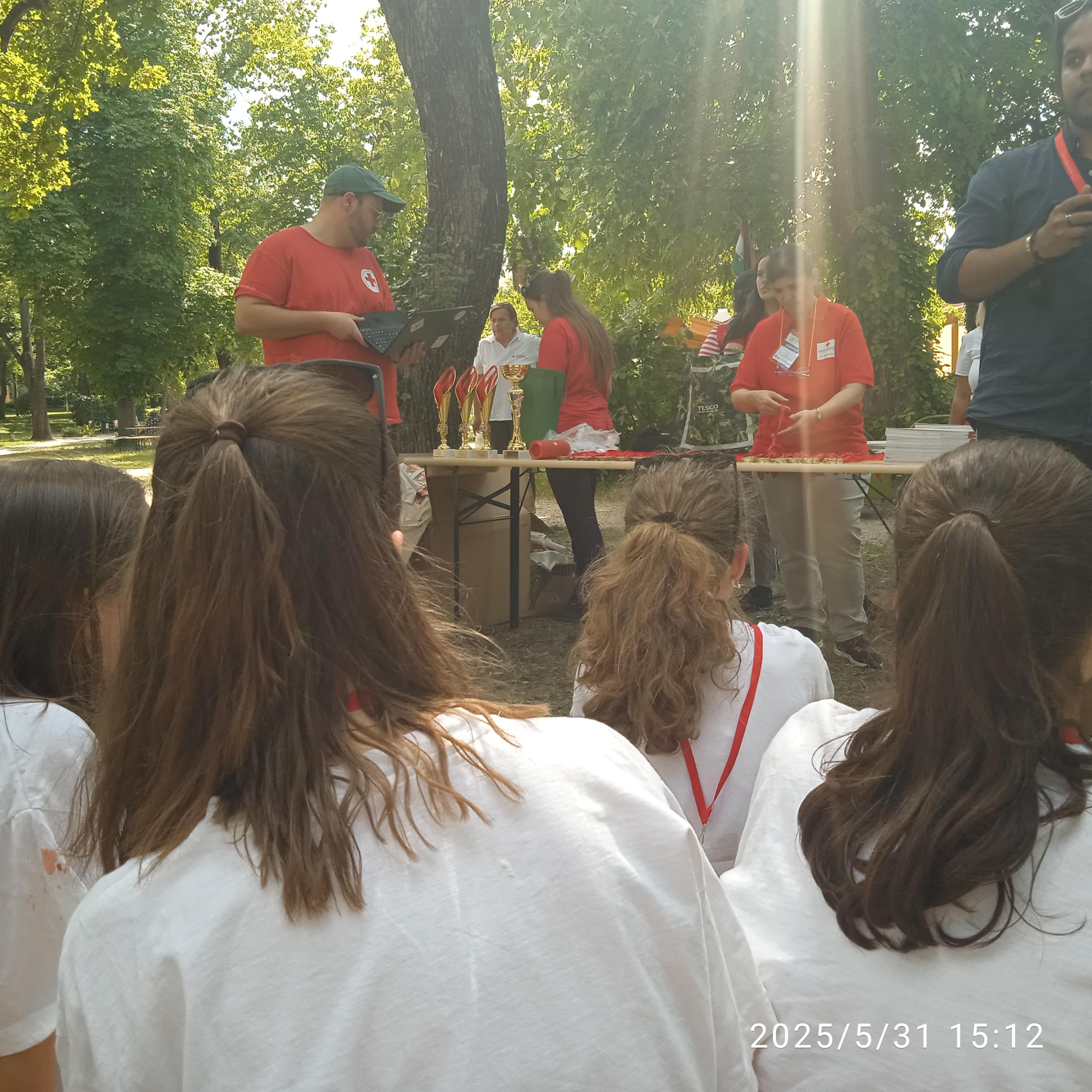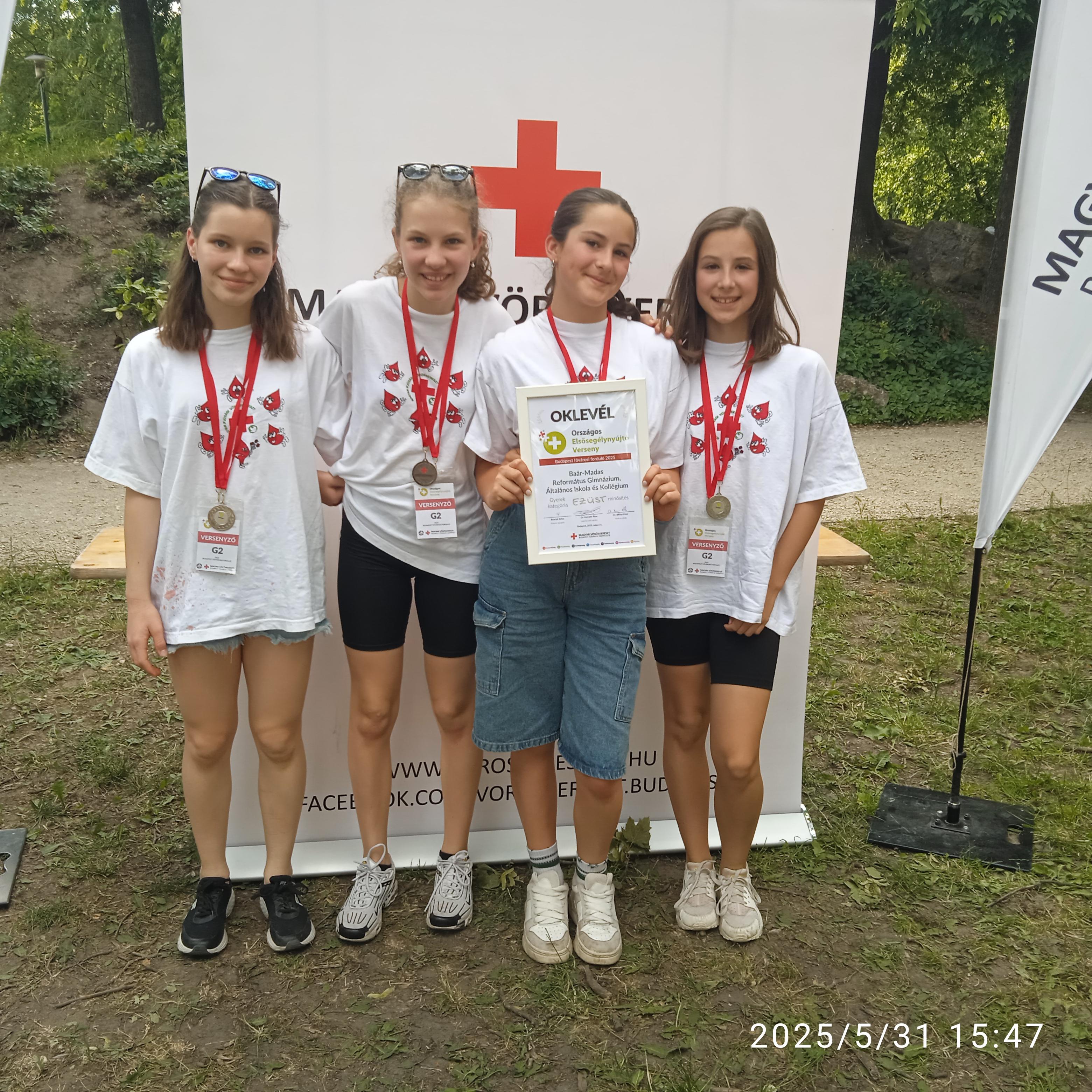 A területi fordulók lezárultak, az összesített eredmények alapján az általános iskolai csapta 88%-os teljesítménye továbbjutást eredményezett a budapesti döntőbe. Az Andriska Sára, Ablonczy Kincső, Kára Eszter, Illés Manga és Vaszilkó VIvien alkotta csapat a múlt szombati, az Orczy-kertben megrendezésre került Budapest fővárosi fordulót is kiemelkedő eredménnyel zárták, a harmadik helyen végeztek, hatalmas gratuláció illeti őket! Köszönet a lelkesedésükért, illetve a felkészítésükben szerepet vállalók: Kovács Dávid - Magyar Vöröskereszt, Bereczki Máté Dániel - 12.b munkájáért!