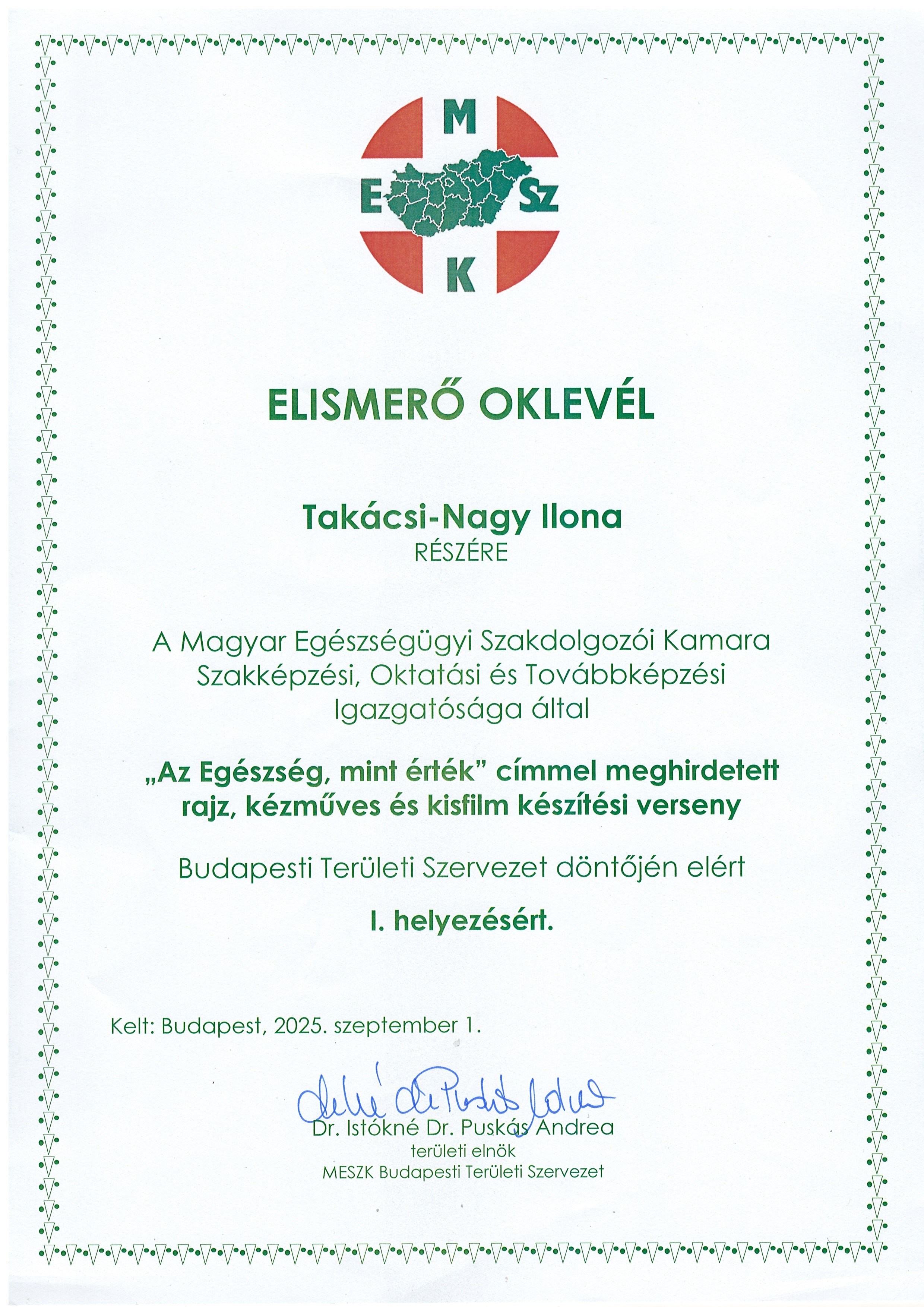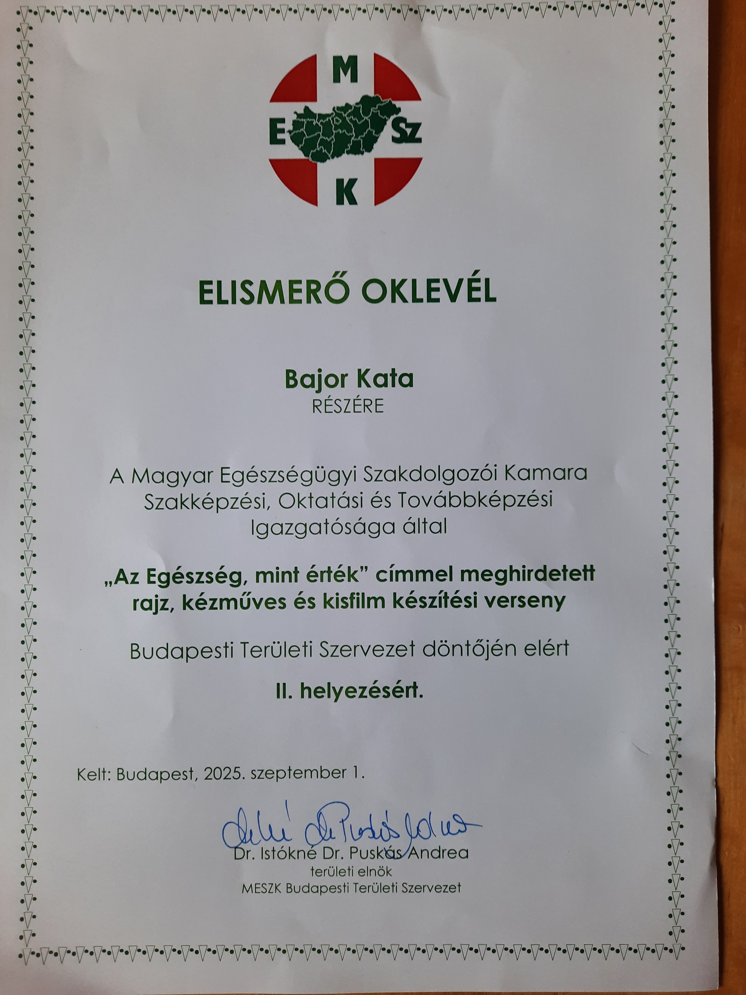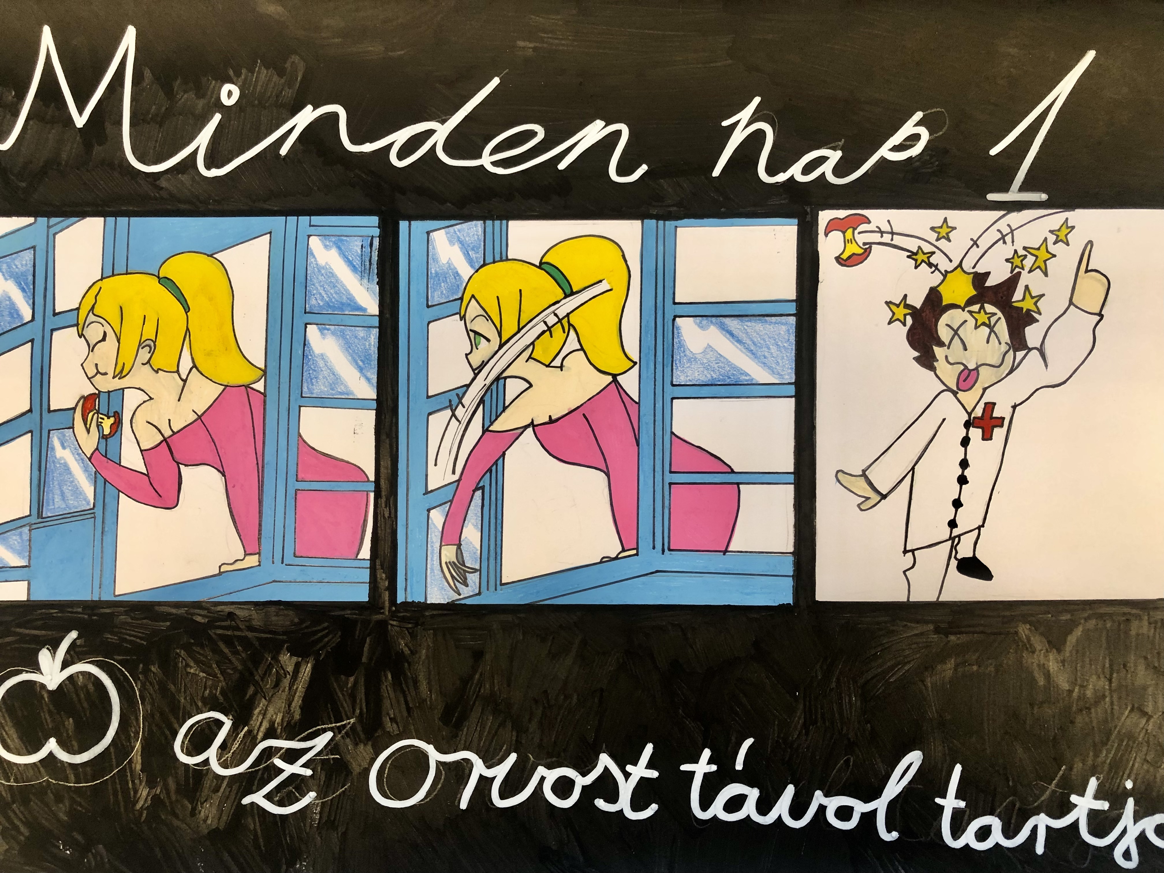 "Az egészség , mint érték" fővárosi képzőművészeti pályázat II. helyezett lett Bajor Kata 9.c Minden nap egy alma, az orvost távol tartja műve.