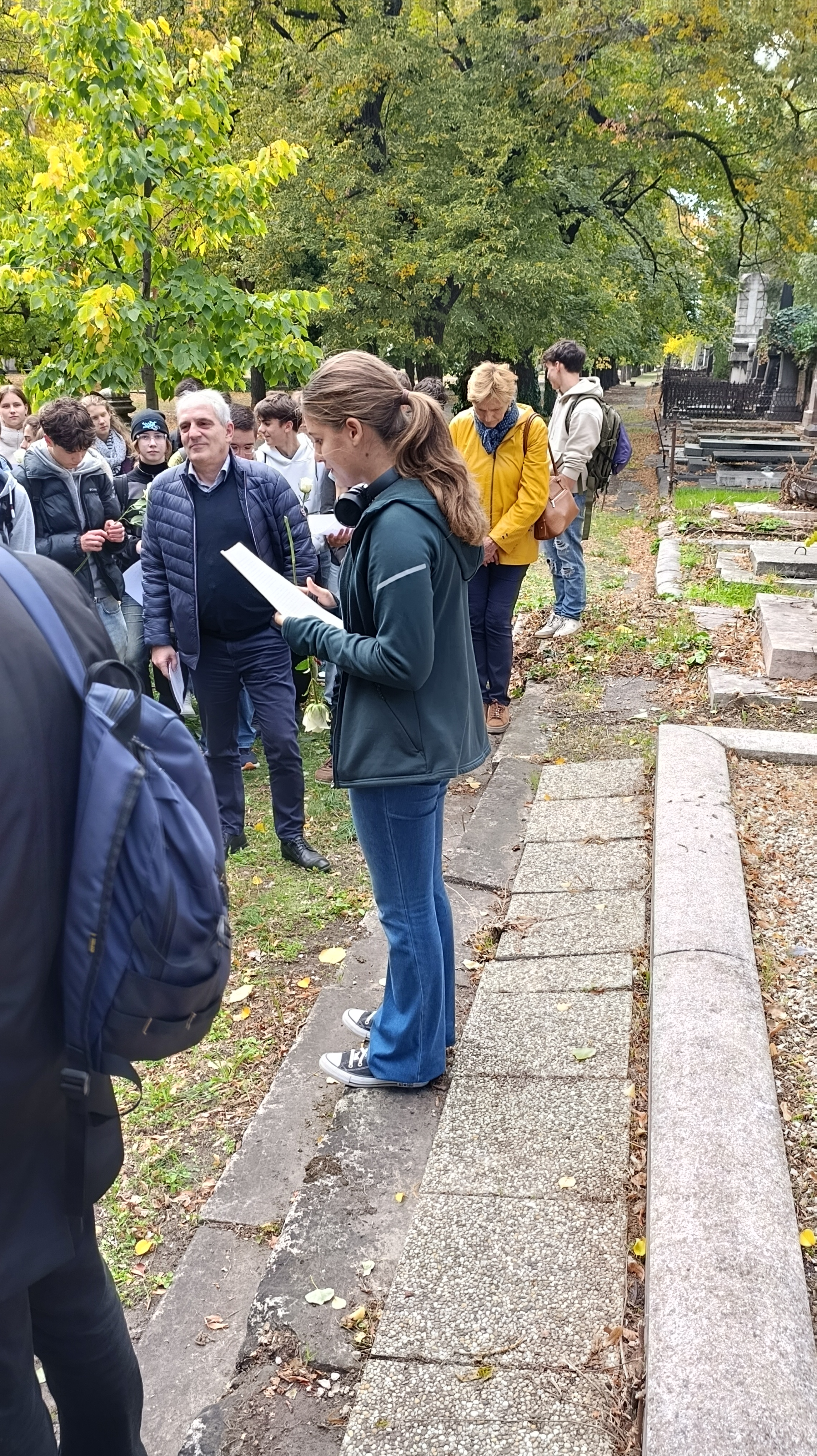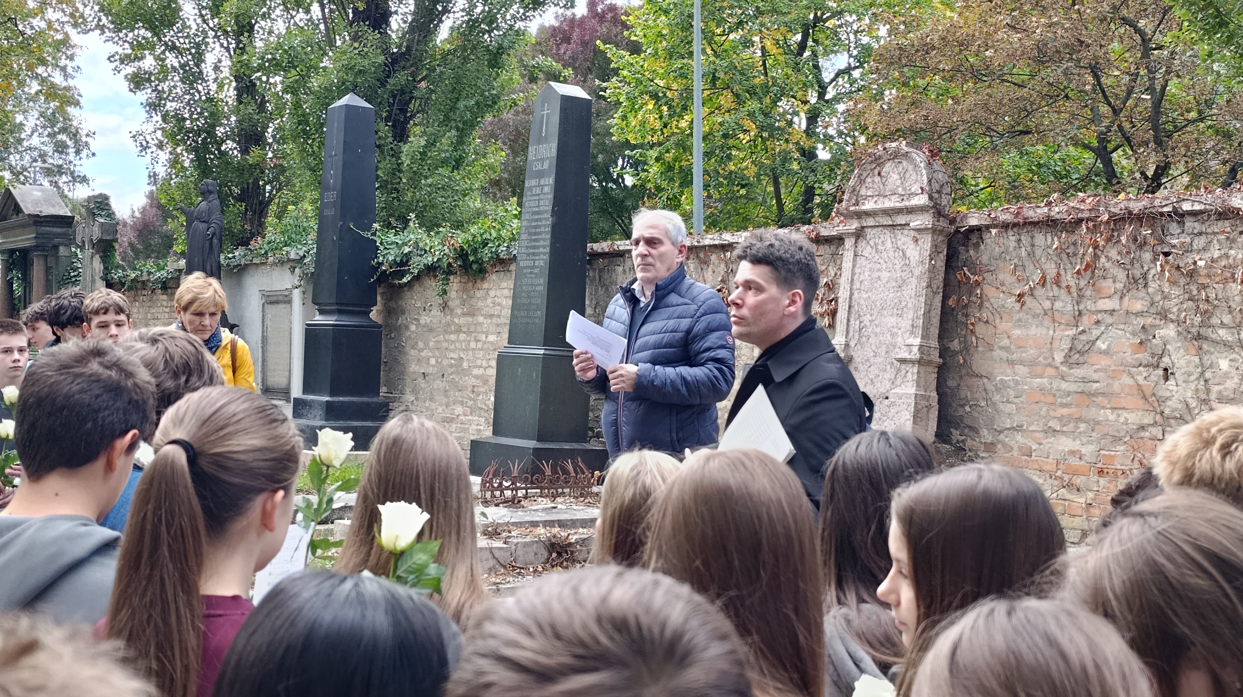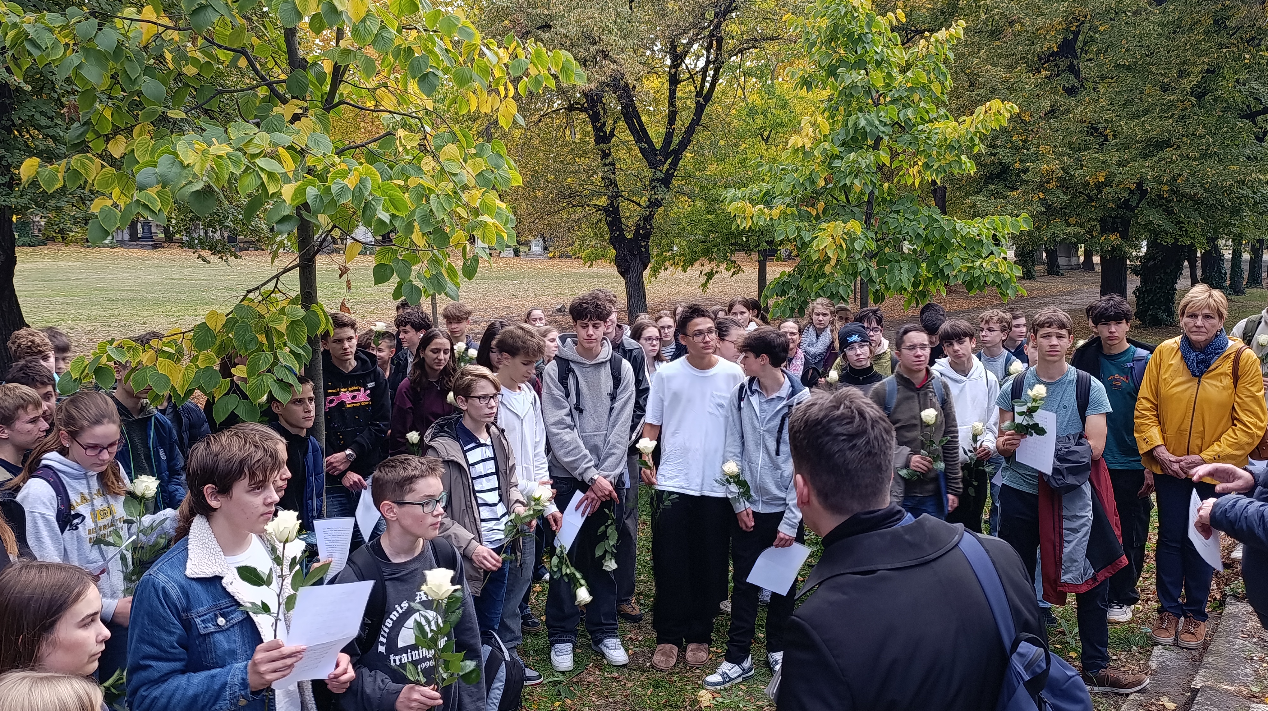 Szép hagyományt folytattunk hétfőn, amikor az induló új hetedik és a két kilencedik osztállyal együtt a Fiumei úti Nemzeti Sírkertben tettünk látogatást az alapítók síremlékénél. Madas Károly obeliszkjénél meghallgathattuk az élettörténetet, majd Tombor László igazgatónk mondta el gondolatait arról, hogy mennyire fontos felelősen gondolkodni vagyonról, örökségről, lehetőségekről előre, ráadásul úgy, hogy az örökhagyó polgár a gimnázium alapításáról mit sem tudhatott már. A jelenlévőkhöz fordulva kifejtette, hogy senki sem tudhatja közülünk, hogy egykor milyen nemes és előremutató ügyet tudhatunk szolgálni - de ehhez kell egy belső tartás, szilárd erkölcsi-hitbeli meggyőződés is. A 90. zsoltár eléneklése után a megemlékezés virágait helyeztük el a síron.