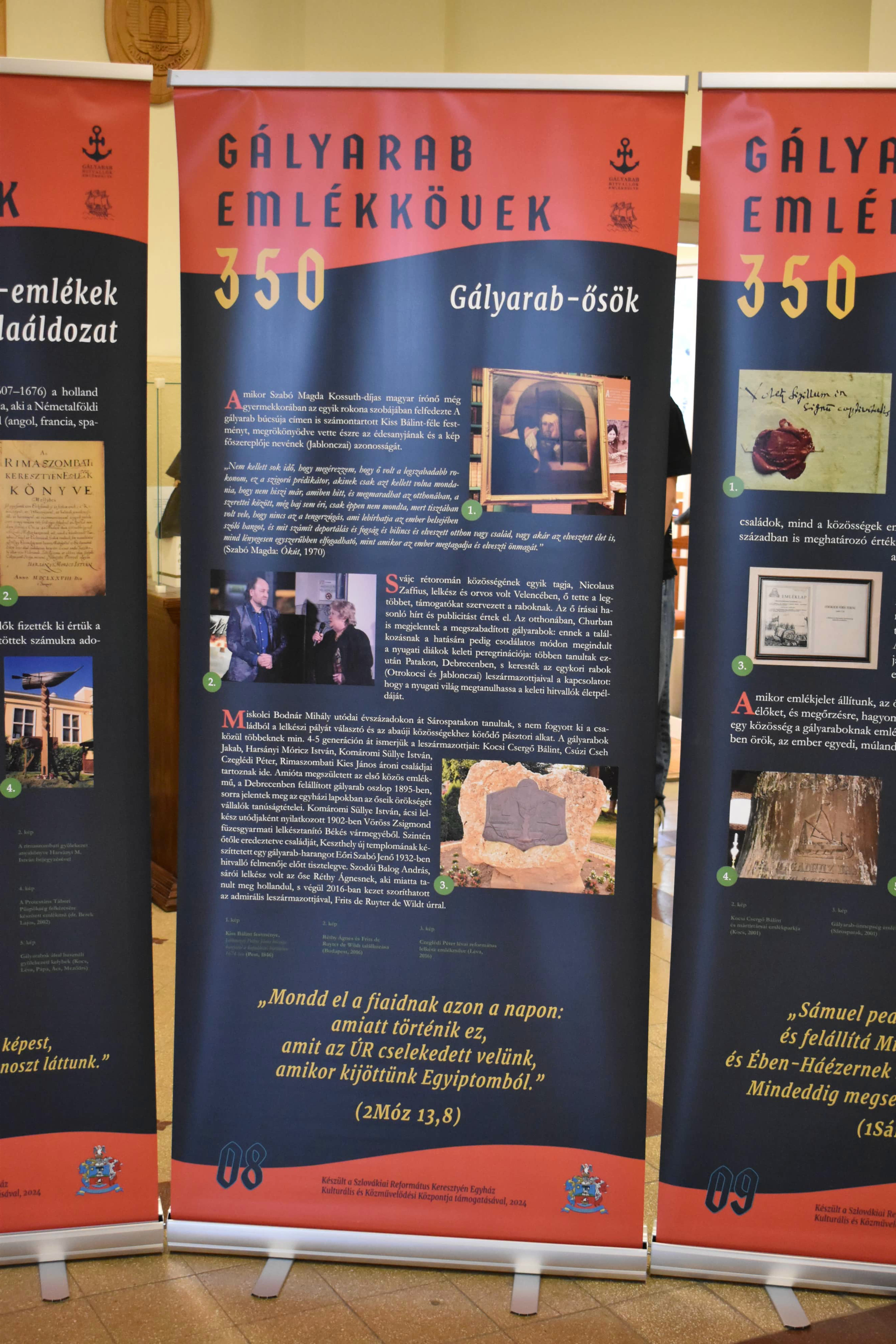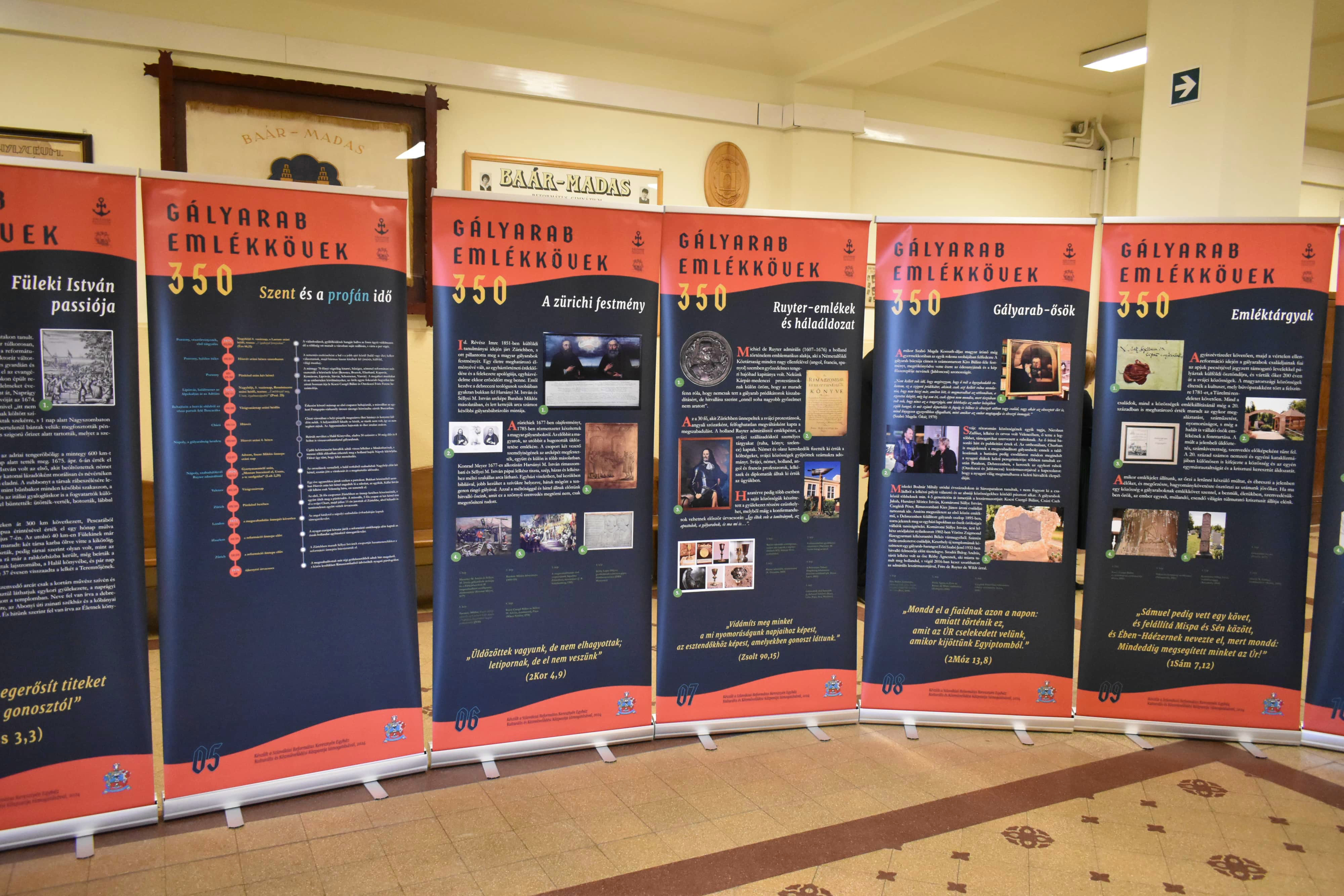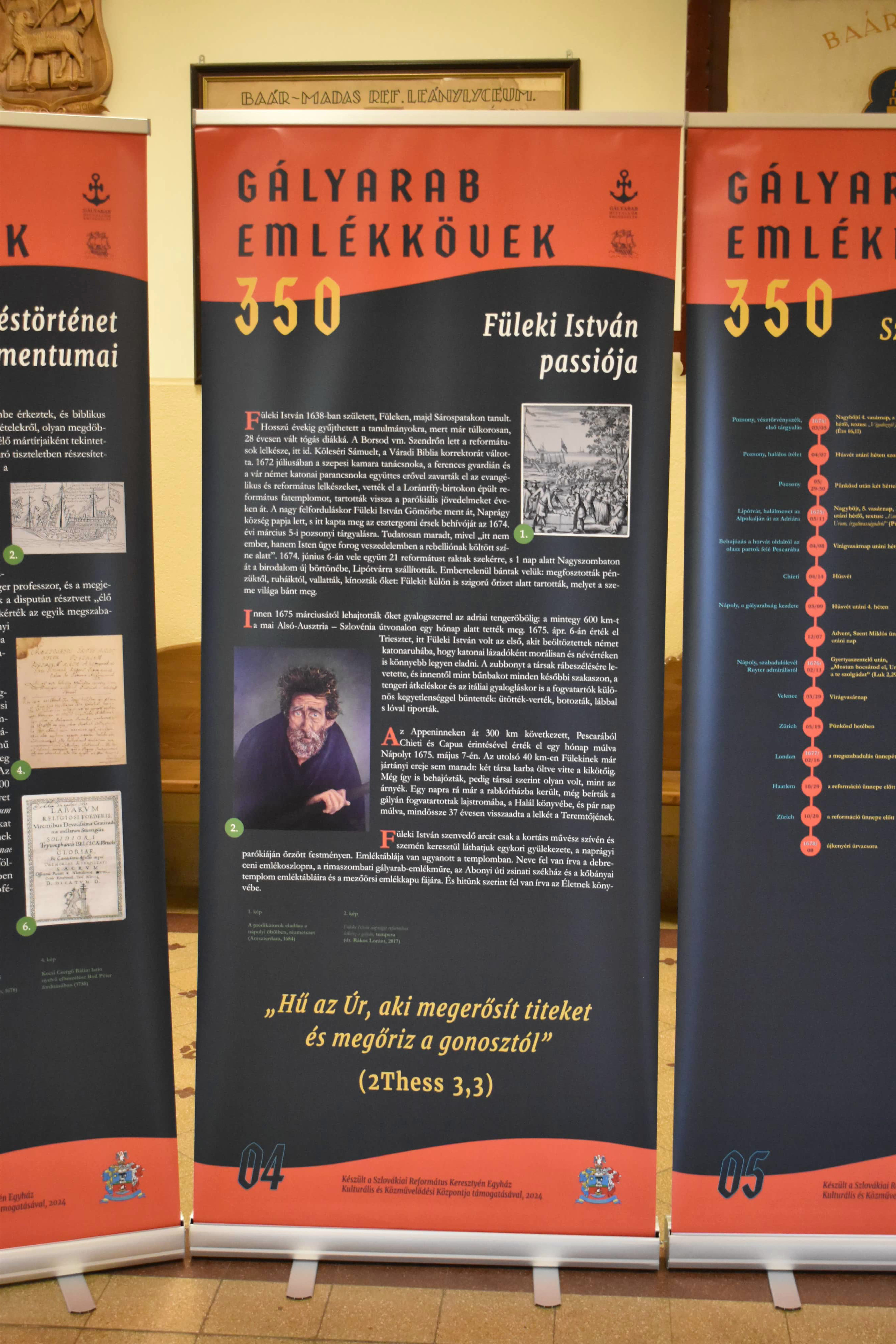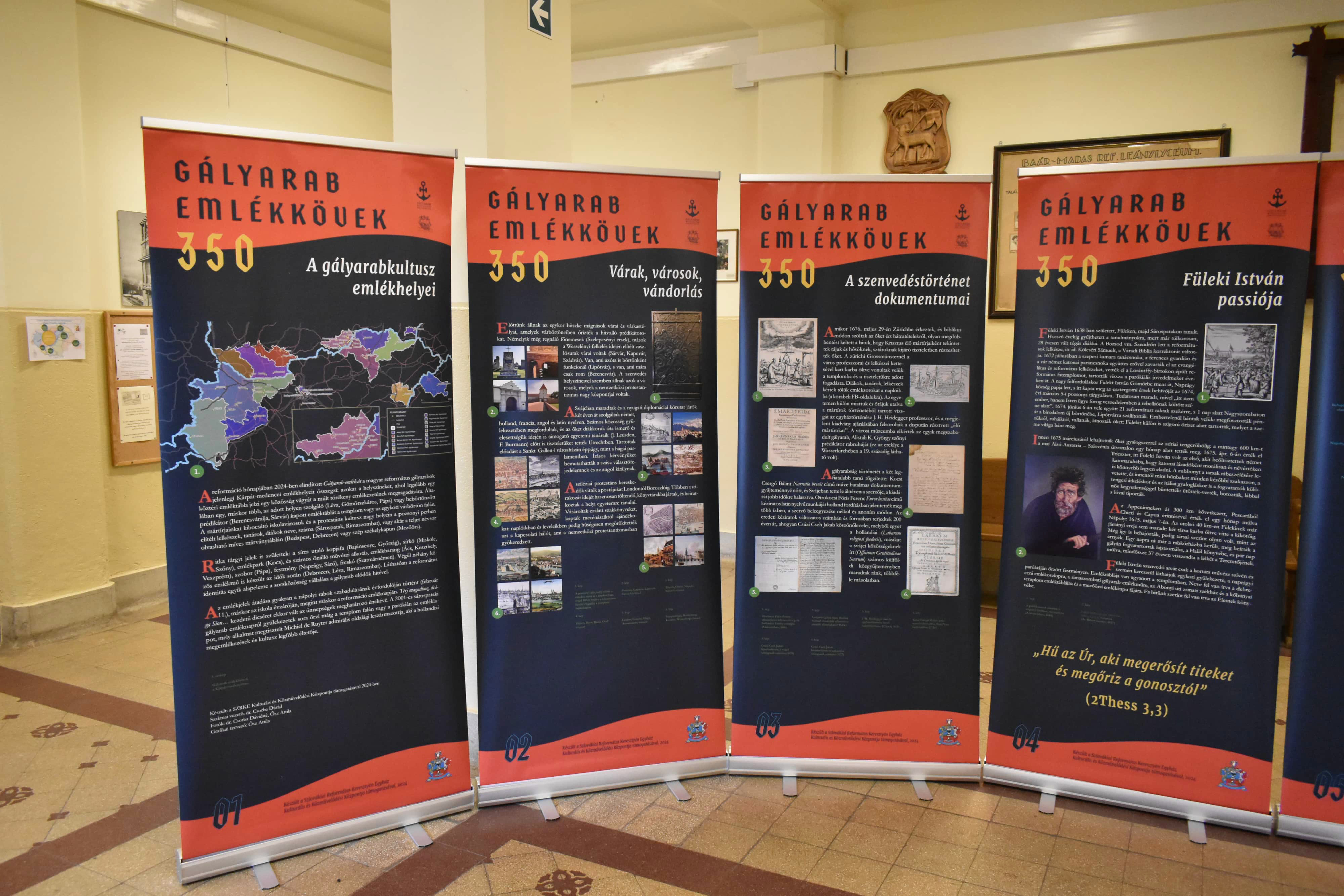 Azaz inkább emlékoszlopok. Legalábbis a nagytanári előtt kihelyezett plakátok alakja inkább erre emlékeztet és arról beszél, hogy lehet úgy élni ebben a világban, hogy akár mindhalálig vállalja valaki az ÚR ügyét, a méltatlan és igazságtalan megaláztatásokat, s nem mond le arról az elhívásról, amelyet magától Jézus Krisztustól kapott. A 350 éve kiszabadított protestáns prédikátorok sorsa kőbe vésett bizonyság az utódoknak: örökségüket, bibliás helytállásukat, a holland de Ruyter admirális hősies tettét, kiszabadításukat nemzedékről nemzedékre tovább kell adni. A kiállítás gazdag szöveg- és képanyaggal illusztrált, érdemes megtekinteni, elgondolkodni előtte - nemcsak a hittanórai látogatások alkalmával, hanem egyénileg is. „Mondd el fiaidnak”!