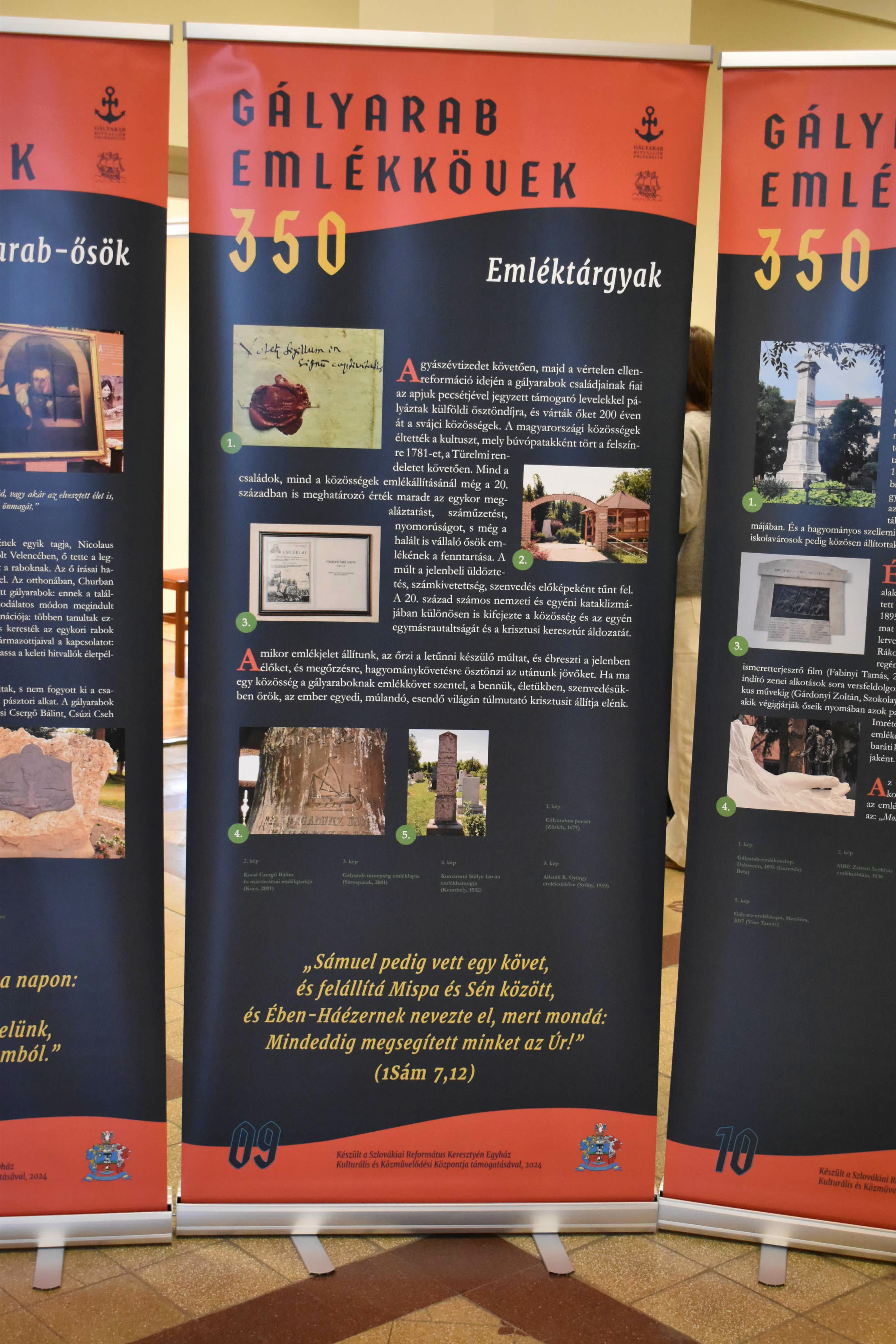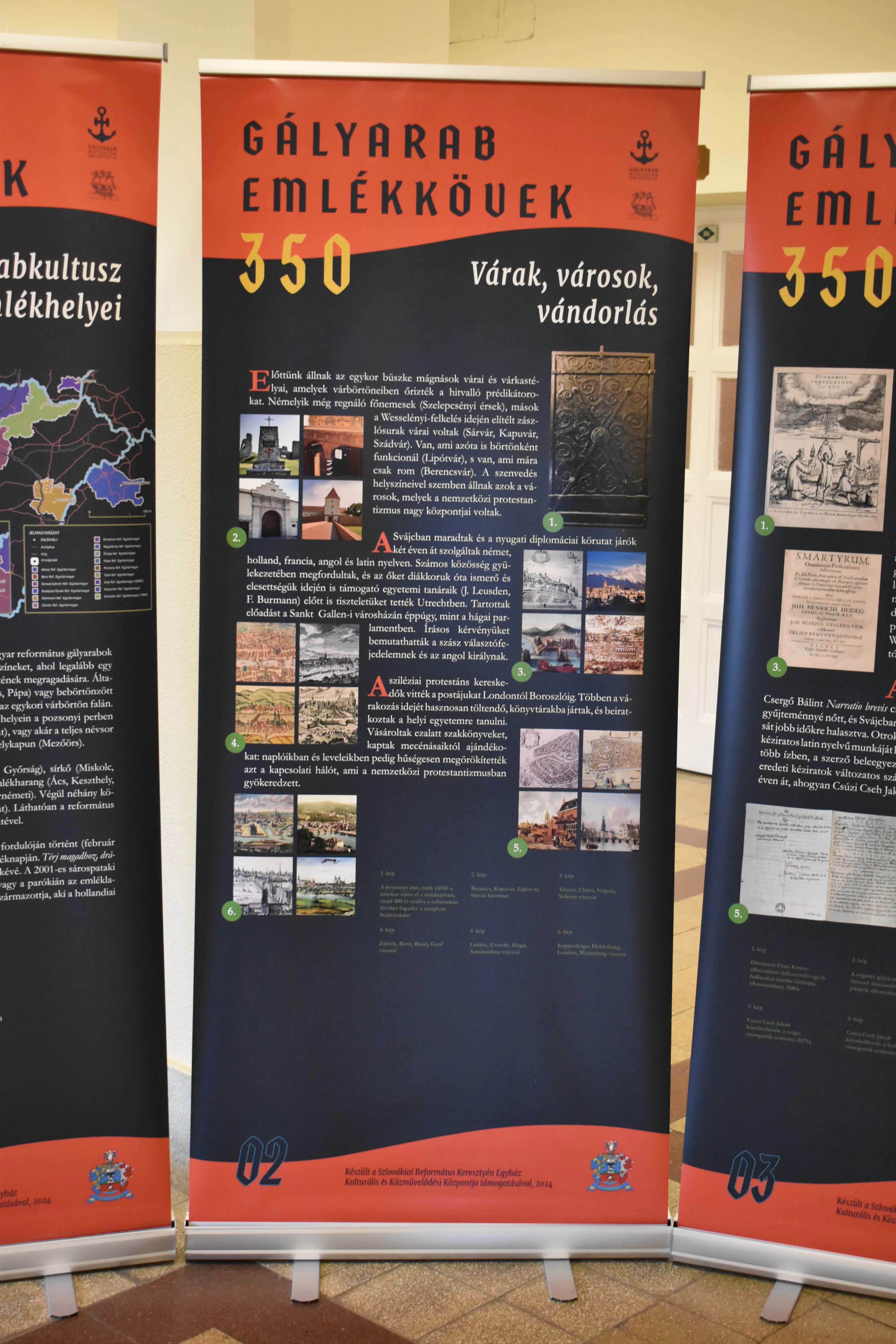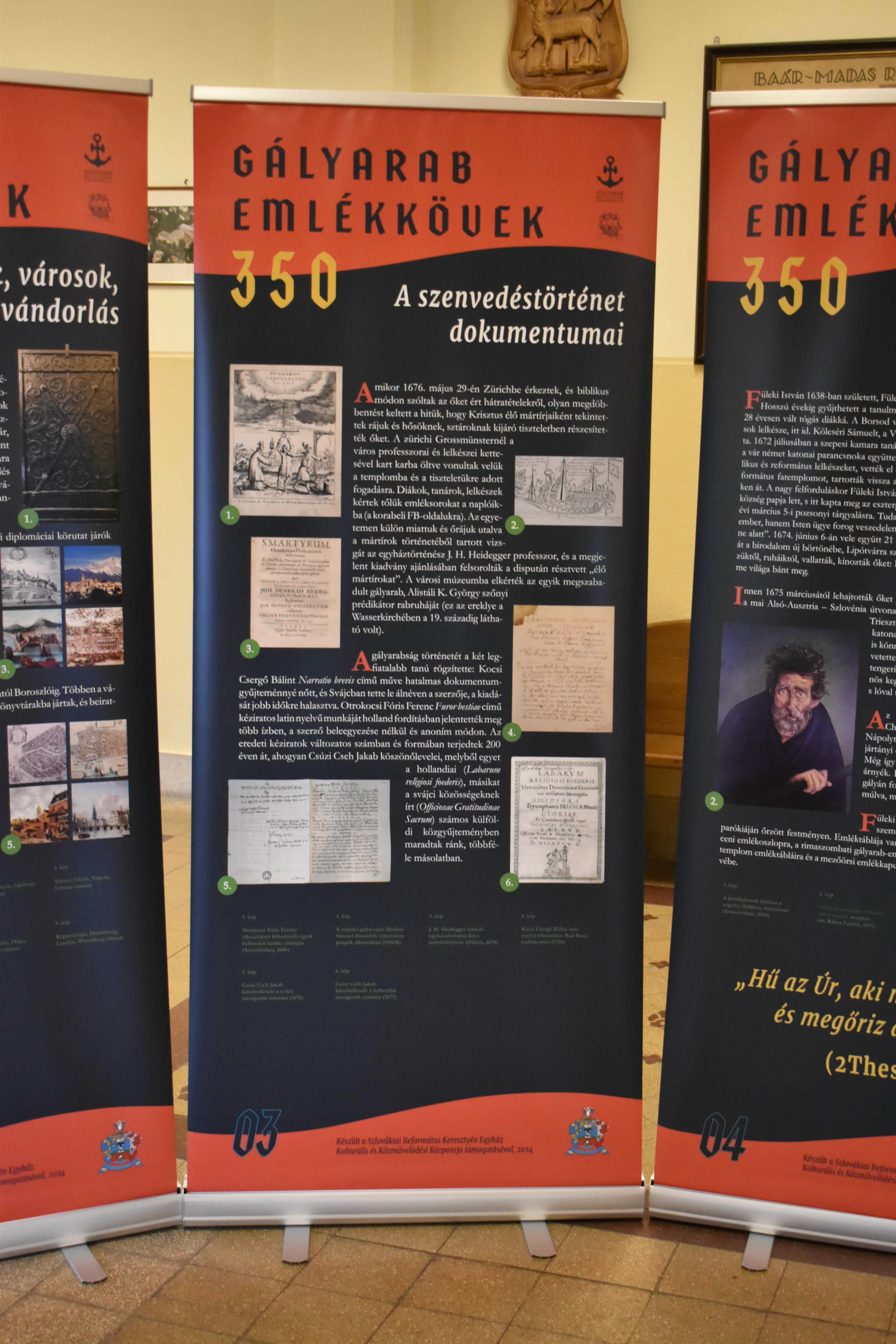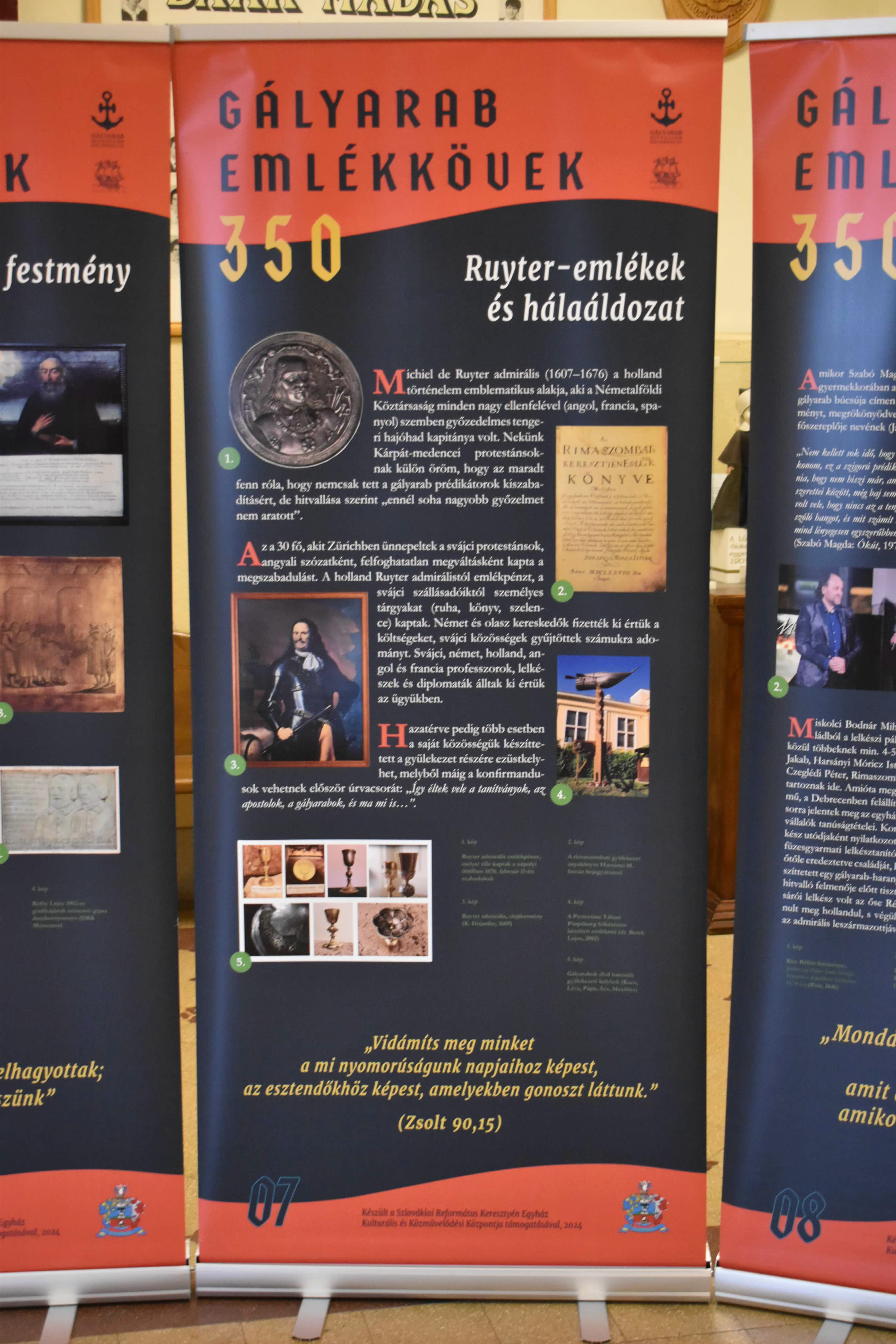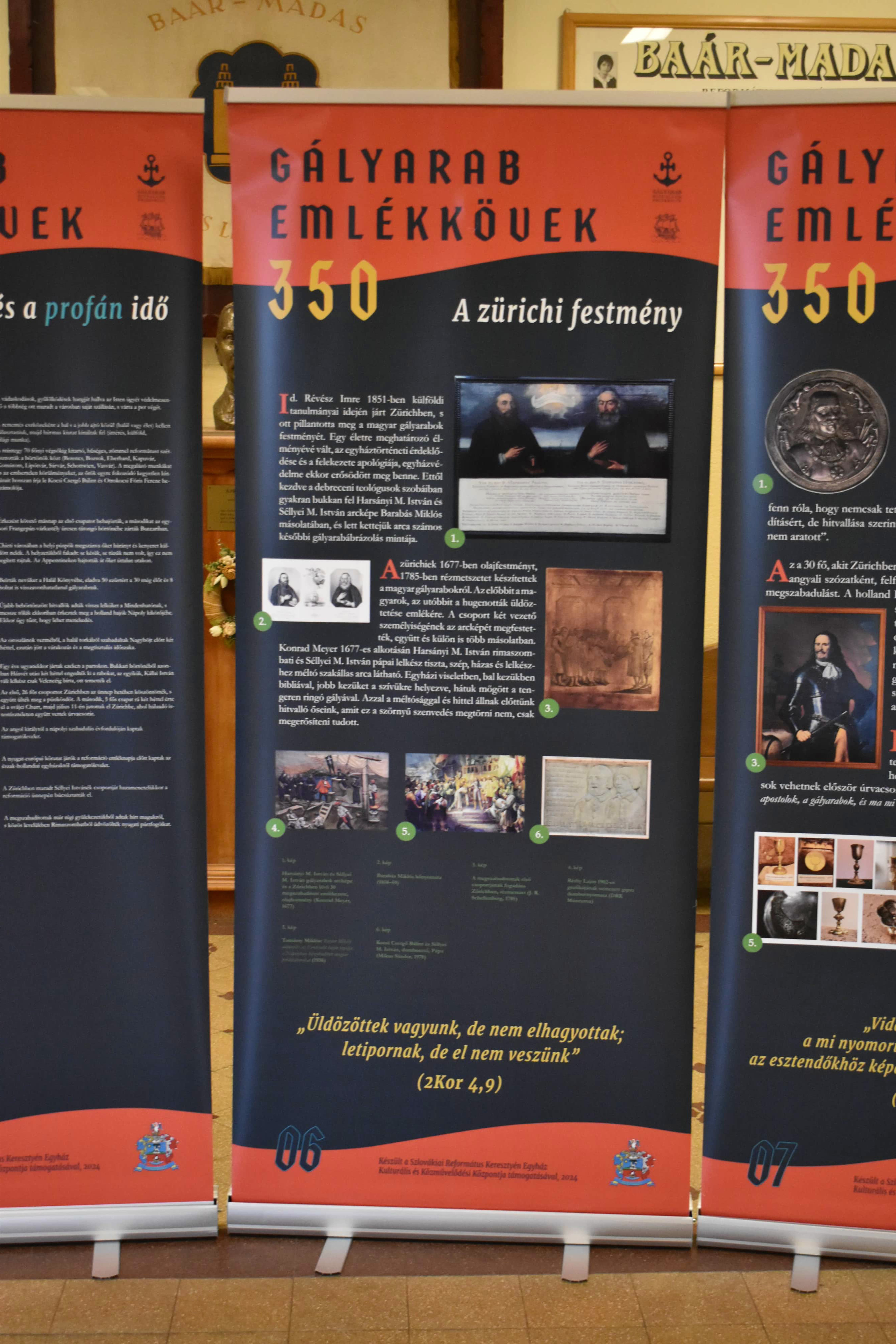 Azaz inkább emlékoszlopok. Legalábbis a nagytanári előtt kihelyezett plakátok alakja inkább erre emlékeztet és arról beszél, hogy lehet úgy élni ebben a világban, hogy akár mindhalálig vállalja valaki az ÚR ügyét, a méltatlan és igazságtalan megaláztatásokat, s nem mond le arról az elhívásról, amelyet magától Jézus Krisztustól kapott. A 350 éve kiszabadított protestáns prédikátorok sorsa kőbe vésett bizonyság az utódoknak: örökségüket, bibliás helytállásukat, a holland de Ruyter admirális hősies tettét, kiszabadításukat nemzedékről nemzedékre tovább kell adni. A kiállítás gazdag szöveg- és képanyaggal illusztrált, érdemes megtekinteni, elgondolkodni előtte - nemcsak a hittanórai látogatások alkalmával, hanem egyénileg is. „Mondd el fiaidnak”!