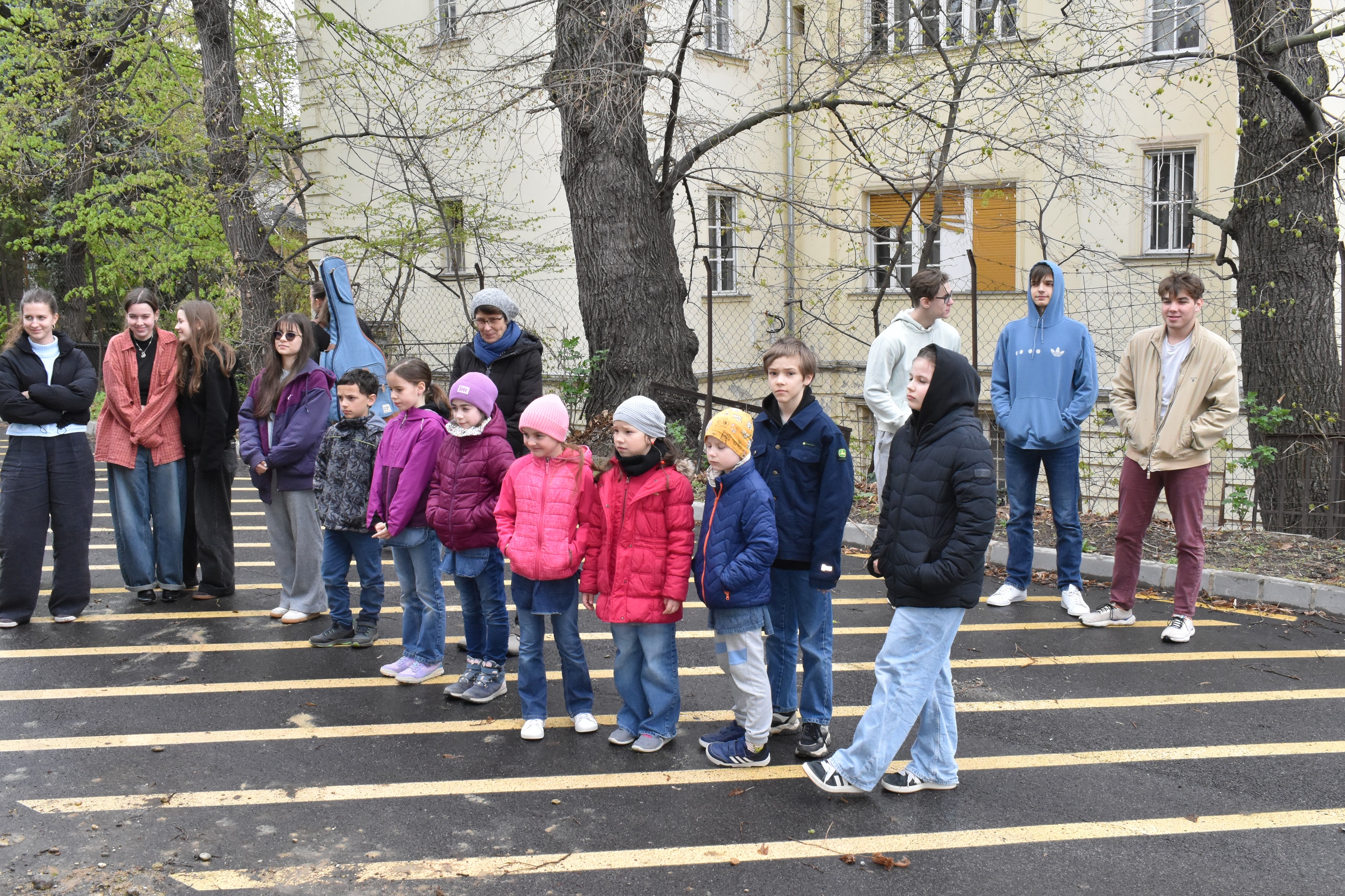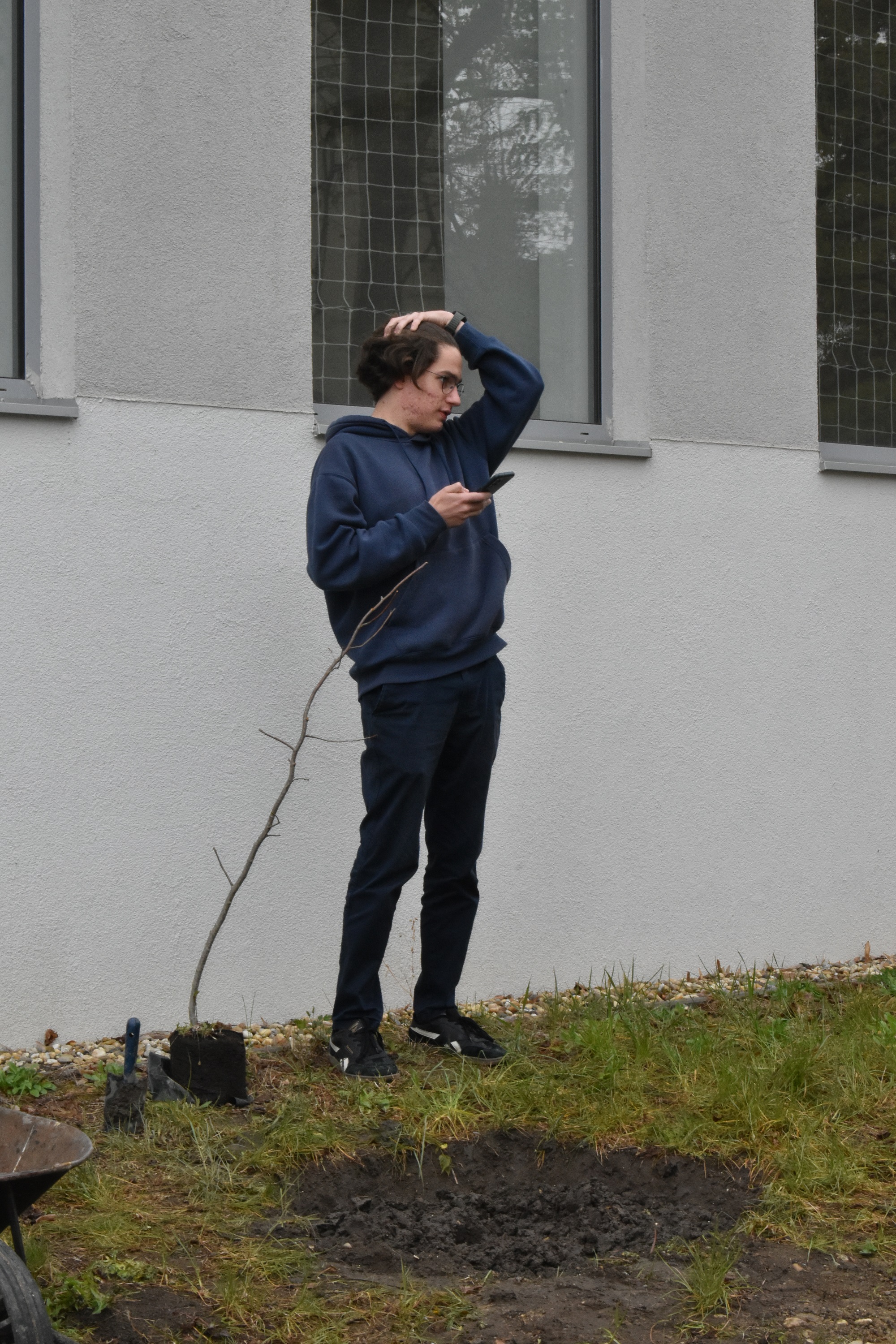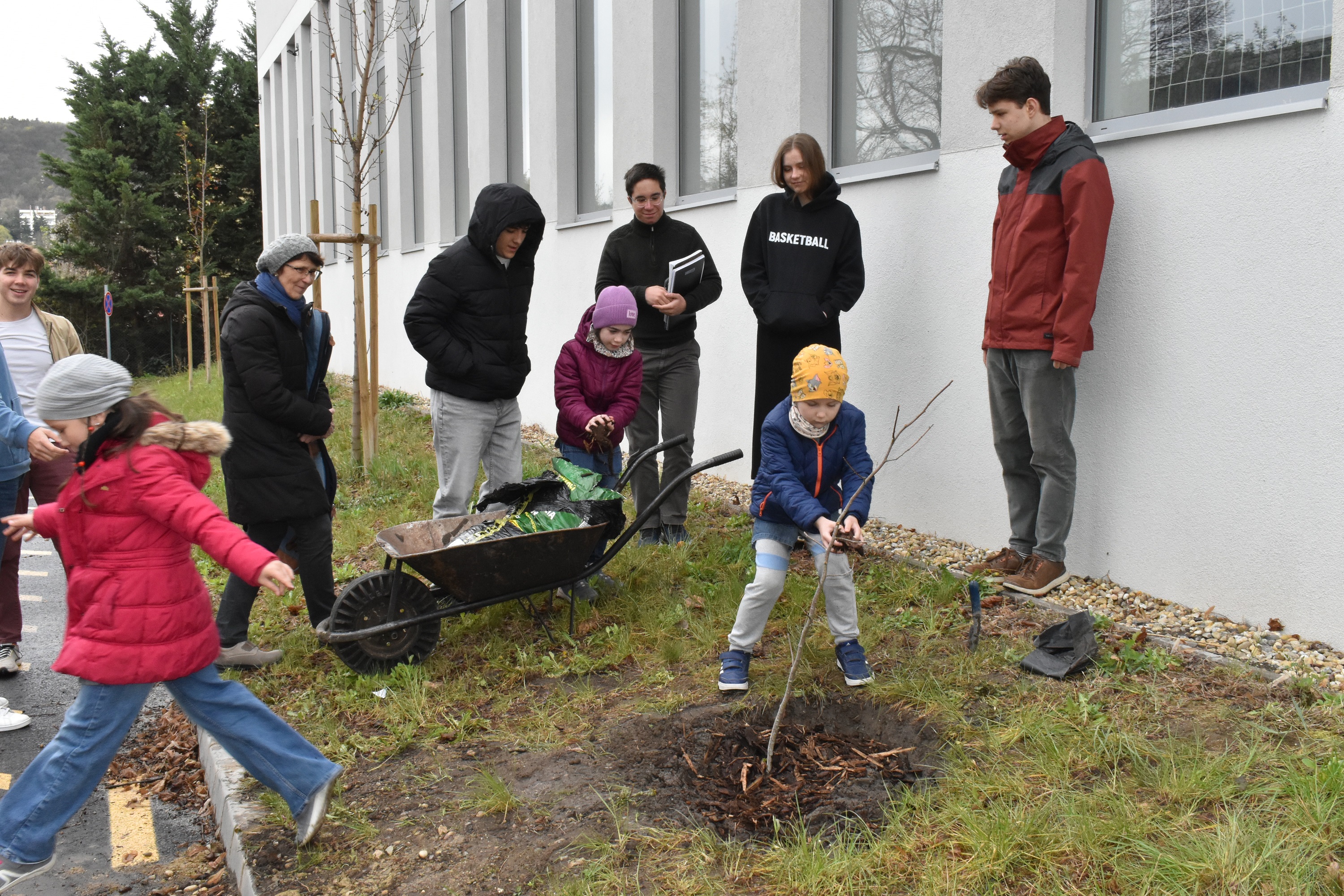 Az ültetést megelőző héten a DÖK-ösök - Staudt Petra, Erőss Alíz, Vecsernyés Nóra, Szloszjár Ajsa, Nagy Zóra és Makai Ádám, valamint a hozzájuk csatlakozó Taraczky Júlia és Tóth Balázs - nekiveselkedtek, és gödröt ástak, talicskáztak, talajt cseréltek, trágyáztak és iszapoltak, hogy ezen a kissé esős, szeles és szürke napon már tápanyagban gazdag, porhanyós föld várja otthonosan a két facsemetét.