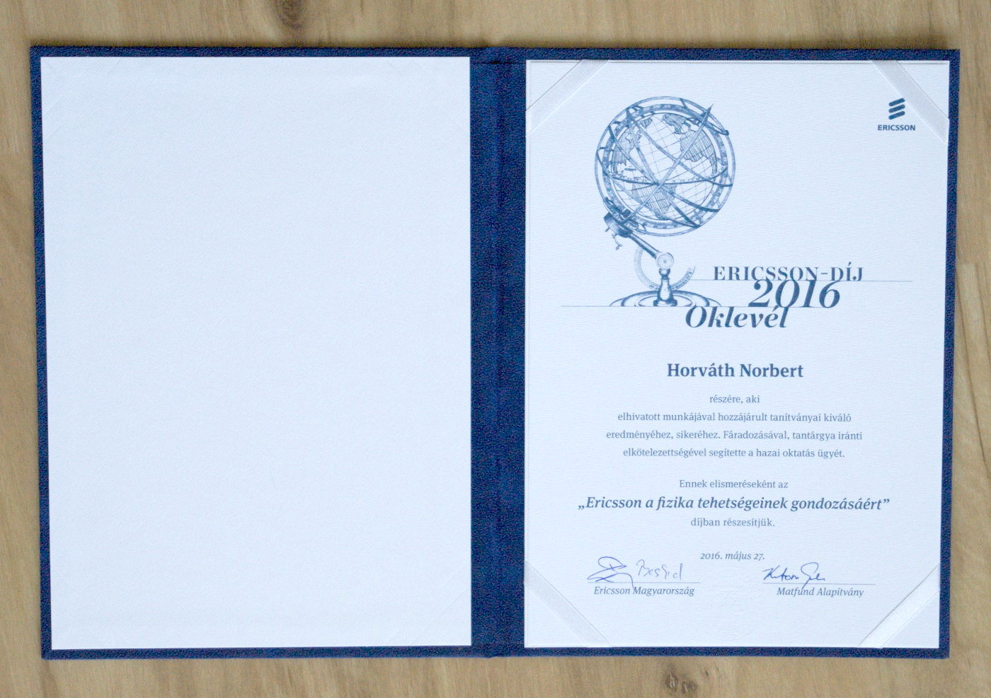 Az 1999-ben alapított Ericsson-díjat minden évben olyan matematikát illetve fizikát oktató pedagógusoknak ítéli oda a díj kuratóriuma, akik elismerten sokat tettek tantárgyuk megszerettetéséért és/vagy a tehetséggondozásért. A tantárgyak népszerűsítéséért egy-egy személyt jutalmaznak és egy-egy tanárt a matematika és a fizika tehetségeinek gondozásáért. 2016-ban Horváth Norbert tanár úr kapta meg a fizika tehetségeinek gondozásáért díjat, amelyet ünnepélyes keretek között a Magyar Tudományos Akadémia felolvasó termében adtak át.