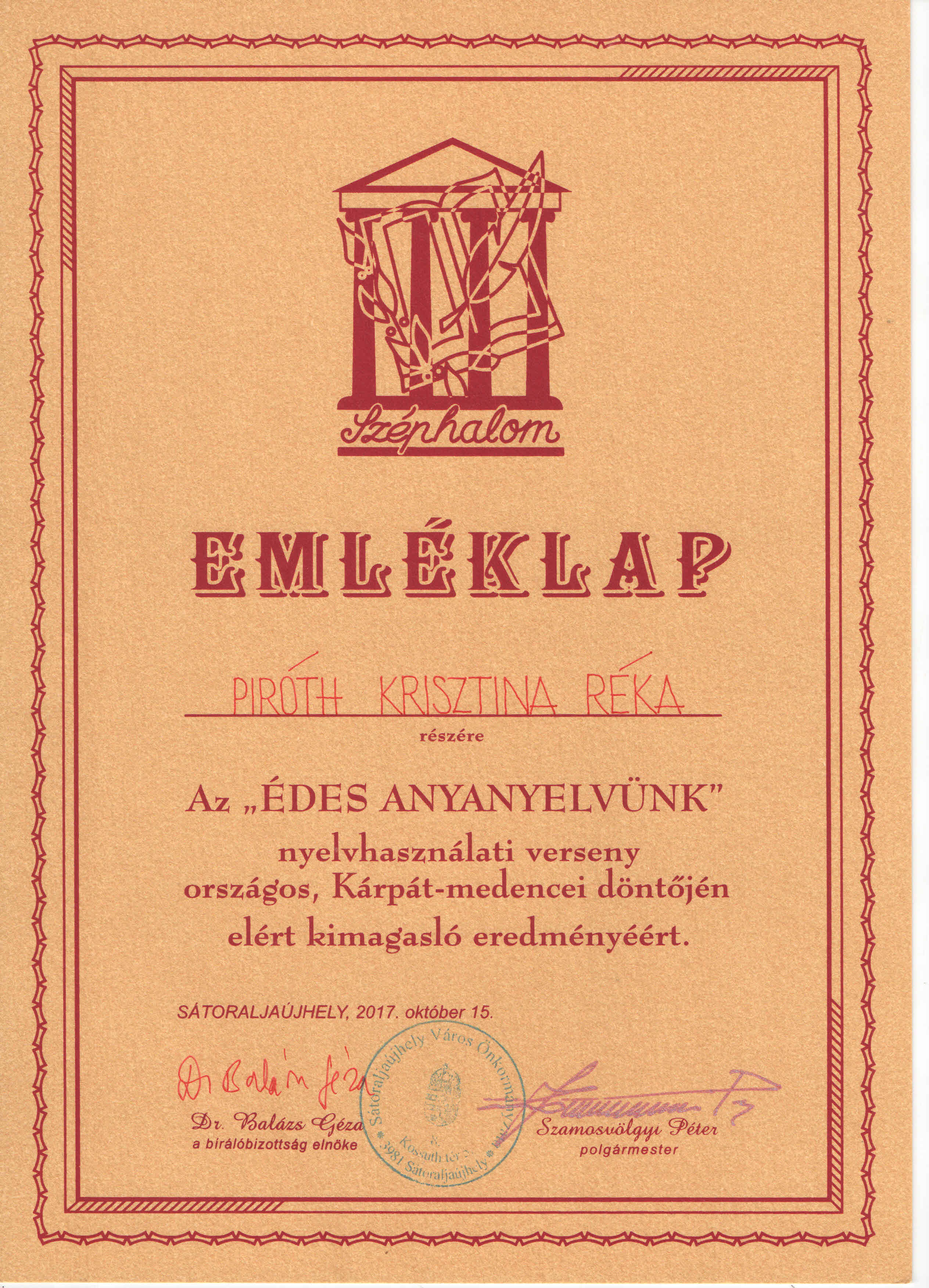 Piróth Krisztina (12.d) az írásbelin elért 2. helyezése és kitűnő szóbeli szereplésének köszönhetően elnyerte a győzteseknek járó „Sátoraljaújhely-emlékplakettet";