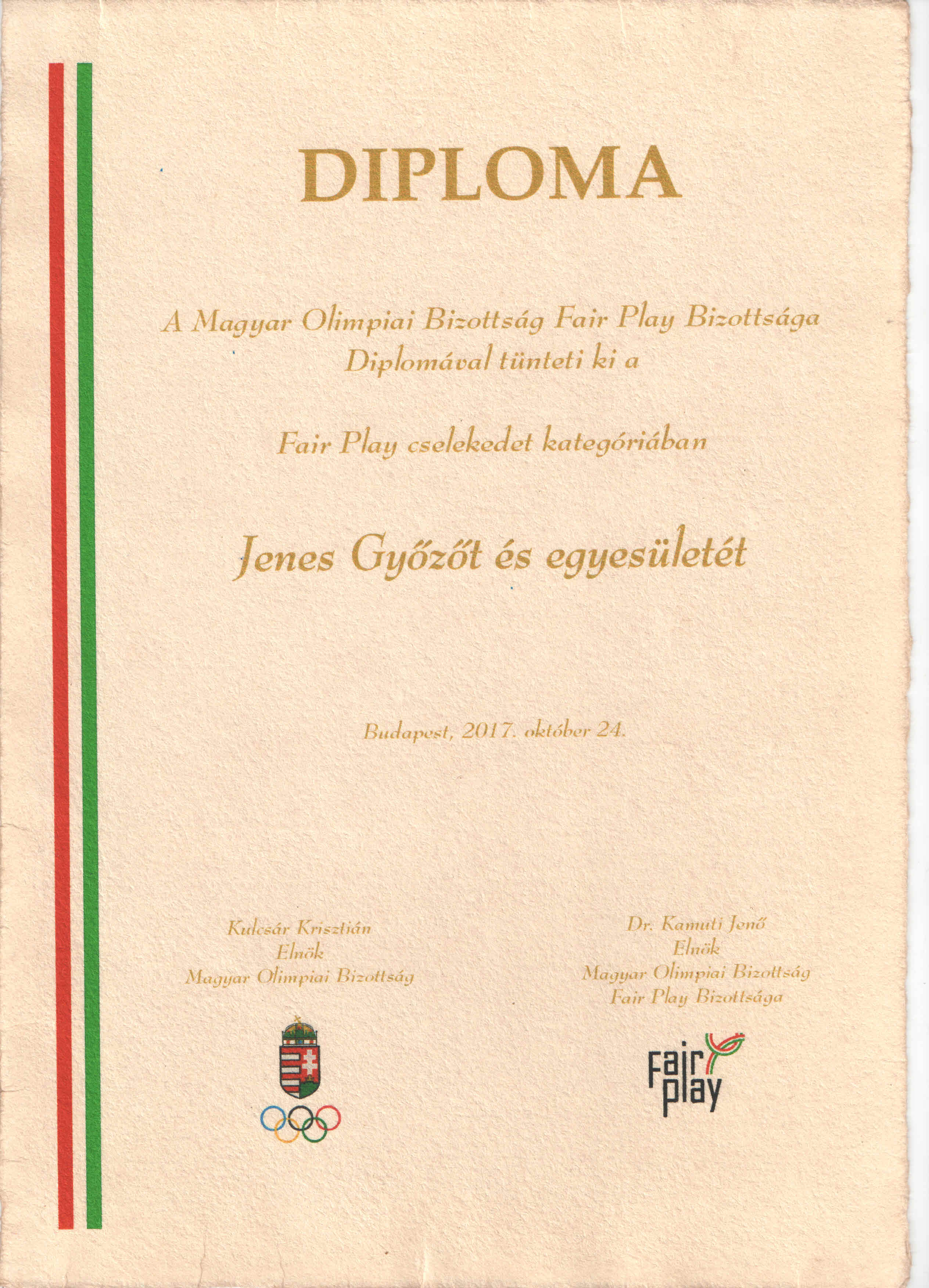 Iskolánk testnevelő tanára Jenes Győző néhány napja kitüntetésben részesült. Ahogyan Dr. Kamuti Jenő, a Nemzet Sportolója, a Magyar és a Nemzetközi Fair Play Bizottság elnöke fogalmazott: „Az idei díjazottak, hasonlóan a korábbiakhoz, méltóak e kitüntetésre. Meggyőződésem, hogy fair play nélkül a sport elveszíti alapeszmeiségét. A fair play-jel mindenki nyer!”
