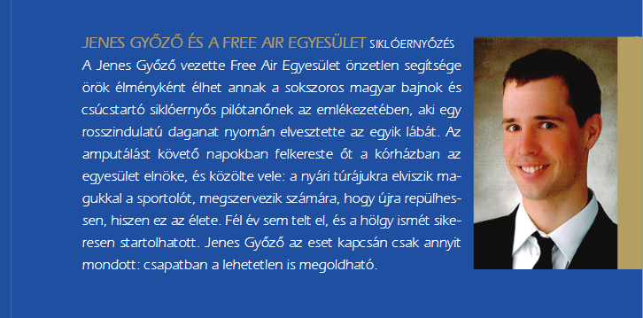 A Jenes Győző vezette Free Air Egyesület önzetlen segítsége örök élményként élhet annak a sokszoros magyar bajnok és csúcstartó siklóernyős pilótanőnek az emlékezetében, aki egy rosszindulatú daganat nyomán elvesztette az egyik lábát. Az amputálást követő napokban felkereste őt a kórházban az egyesület elnöke, és közölte vele: a nyári túrájukra elviszik magukkal a sportolót, megszervezik számára, hogy újra repülhessen, hiszen ez az élete. Fél év sem telt el, és a hölgy ismét sikeresen startolhatott. Jenes Győző az eset kapcsán csak annyit mondott: csapatban a lehetetlen is megoldható."