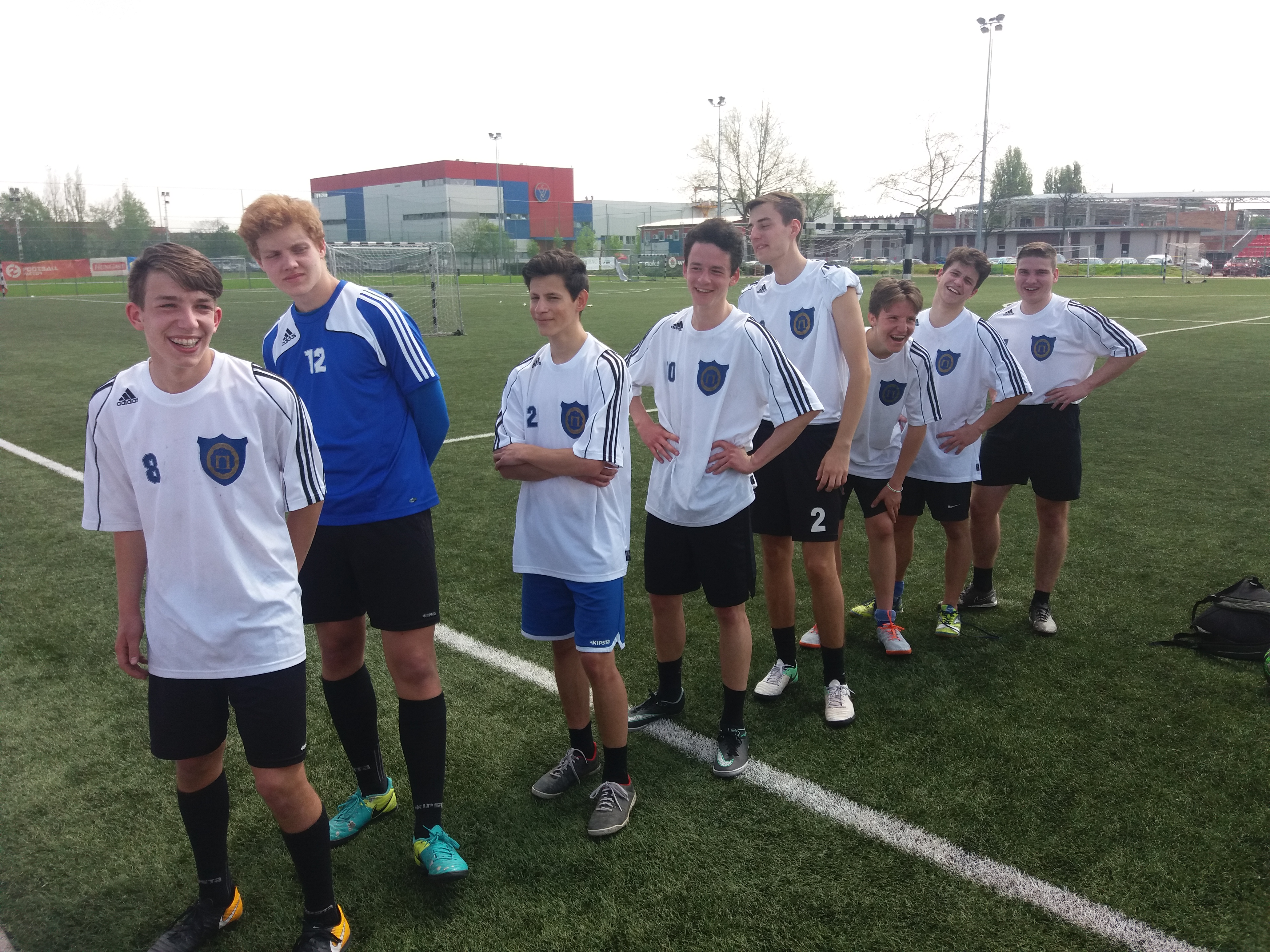 Nagy reményekkel, szép, szinte nyárias időben érkeztünk meg szerdán reggel a Vasas pályára. Mivel hármas csoportba kerültünk és az előzetes sorsolás nekünk kedvezett, ezért megnézhettük, hogy a másik két csapat miként küzd meg egymással. Az eredmény talán kedvező is lehetett volna számunkra, mivel döntetlenül végződött a mérkőzésük. Mi előbb 5:0-ra elpáholtuk a Verebély Szakgimnáziumot, de a következő mérkőzést is „hozni” kellett ugyanilyen arányban, hogy ne érje szó a ház elejét, tehát 5:0-ra győztünk a Dózsa Gy. Gimn. ellen is. Ugyanis csak az első és második helyezett csapat folytathatta küzdelmeket a legjobb 8 nyolc között. (Ők még eldöntötték a második hely sorsát 7 m-es rúgásokkal.) Mi pedig összekerültünk a kerületünkből már jól ismert Rákóczi Gimn-al. Nem volt olyan nehéz mérkőzés, mint amilyennek az eredmény mutatja: 3:2-re győztünk. Viszont már jóval acélosabb ellenfelet kaptunk az elődöntőben a Budai Ciszterci Szent Imre csapata személyében. Kemény, küzdelmes mérkőzés volt, a vezetést is ők szerezték meg, de sikerült megfordítanunk és 2:1-es győzelem után mi játszhattuk a döntőt a Madách Gimn. csapatával. Mi pedig megfogadtuk, ha már idáig eljutottunk, nem engedjük kiénekelni a sajtot a szánkból és viszonylag könnyedén nyertünk 6:3-ra. A fiúk minden dicséretet megérdemelnek, mert valóban egy csapatmunka eredménye ez a siker: a taktikai utasításokat pontosan betartva és egymást bíztatva, segítve lettünk Budapest bajnoka és utazhatunk a máj 18-20-i Vácon megrendezésre kerülő országos döntőre!
