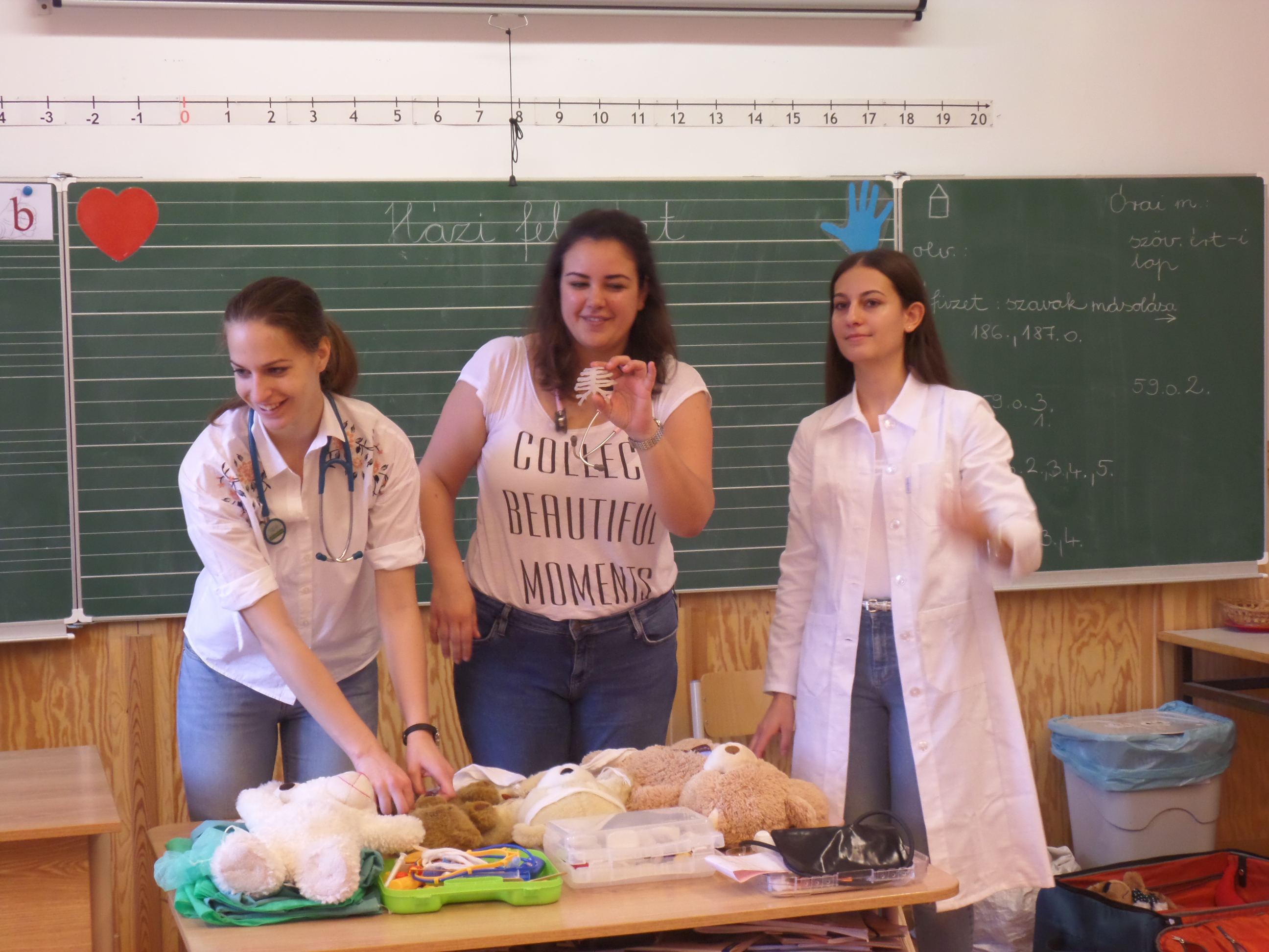 Remek, jókedvű, tanulságos foglalkozást tartottak az első osztályosok részére a Budapesti Orvostanhallgatók Egyesületének tagjai a Teddy maci program keretében.